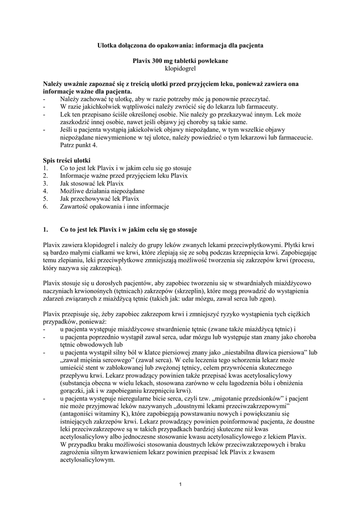 Ulotka dołączona do opakowania: informacja dla pacjenta Plavix 300 mg tabletki powlekane klopidogrel Należy uważnie zapoznać się z treścią ulotki przed przyjęciem leku, ponieważ zawiera ona informacje ważne dla pacjenta. Należy zachować tę ulotkę, aby w razie potrzeby móc ją ponownie przeczytać. W razie jakichkolwiek wątpliwości należy zwrócić się do lekarza lub farmaceuty. Lek ten przepisano ściśle określonej osobie. Nie należy go przekazywać innym. Lek może zaszkodzić innej osobie, nawet jeśli objawy jej choroby są takie same. Jeśli u pacjenta wystąpią jakiekolwiek objawy niepożądane, w tym wszelkie objawy niepożądane niewymienione w tej ulotce, należy powiedzieć o tym lekarzowi lub farmaceucie. Patrz punkt 4. Spis treści ulotki 1. Co to jest lek Plavix i w jakim celu się go stosuje 2. Informacje ważne przed przyjęciem leku Plavix 3. Jak stosować lek Plavix 4. Możliwe działania niepożądane 5. Jak przechowywać lek Plavix 6. Zawartość opakowania i inne informacje 1. Co to jest lek Plavix i w jakim celu się go stosuje Plavix zawiera klopidogrel i należy do grupy leków zwanych lekami przeciwpłytkowymi. Płytki krwi są bardzo małymi ciałkami we krwi, które zlepiają się ze sobą podczas krzepnięcia krwi. Zapobiegając temu zlepianiu, leki przeciwpłytkowe zmniejszają możliwość tworzenia się zakrzepów krwi (procesu, który nazywa się zakrzepicą). Plavix stosuje się u dorosłych pacjentów, aby zapobiec tworzeniu się w stwardniałych miażdżycowo naczyniach krwionośnych (tętnicach) zakrzepów (skrzeplin), które mogą prowadzić do wystąpienia zdarzeń związanych z miażdżycą tętnic (takich jak: udar mózgu, zawał serca lub zgon). Plavix przepisuje się, żeby zapobiec zakrzepom krwi i zmniejszyć ryzyko wystąpienia tych ciężkich przypadków, ponieważ: u pacjenta występuje miażdżycowe stwardnienie tętnic (zwane także miażdżycą tętnic) i u pacjenta poprzednio wystąpił zawał serca, udar mózgu lub występuje stan znany jako choroba tętnic obwodowych lub u pacjenta wystąpił silny ból w klatce piersiowej znany jako „niestabilna dławica piersiowa” lub „zawał mięśnia sercowego” (zawał serca). W celu leczenia tego schorzenia lekarz może umieścić stent w zablokowanej lub zwężonej tętnicy, celem przywrócenia skutecznego przepływu krwi. Lekarz prowadzący powinien także przepisać kwas acetylosalicylowy (substancja obecna w wielu lekach, stosowana zarówno w celu łagodzenia bólu i obniżenia gorączki, jak i w zapobieganiu krzepnięciu krwi). u pacjenta występuje nieregularne bicie serca, czyli tzw. „migotanie przedsionków” i pacjent nie może przyjmować leków nazywanych „doustnymi lekami przeciwzakrzepowymi” (antagoniści witaminy K), które zapobiegają powstawaniu nowych i powiększaniu się istniejących zakrzepów krwi. Lekarz prowadzący powinien poinformować pacjenta, że doustne leki przeciwzakrzepowe są w takich przypadkach bardziej skuteczne niż kwas acetylosalicylowy albo jednoczesne stosowanie kwasu acetylosalicylowego z lekiem Plavix. W przypadku braku możliwości stosowania doustnych leków przeciwzakrzepowych i braku zagrożenia silnym krwawieniem lekarz powinien przepisać lek Plavix z kwasem acetylosalicylowym. 1 2. Informacje ważne przed przyjęciem leku Plavix Kiedy nie przyjmować leku Plavix jeśli u pacjenta stwierdzono uczulenie (nadwrażliwość) na klopidogrel lub którykolwiek z pozostałych składników tego leku (wymienionych w punkcie 6), jeśli u pacjenta występuje stan chorobowy, który obecnie powoduje krwawienie, taki jak: wrzód żołądka lub krwawienie wewnątrz mózgu, jeśli u pacjenta występuje ciężka choroba wątroby. Jeśli pacjent uważa, że dotyczy go którekolwiek z tych zaburzeń lub ma jakiekolwiek inne wątpliwości, powinien skonsultować się z lekarzem prowadzącym, zanim przyjmie lek Plavix. Ostrzeżenia i środki ostrożności Jeśli którakolwiek z sytuacji wymienionych poniżej dotyczy pacjenta, to przed przyjęciem leku Plavix powinien on poinformować o tym lekarza prowadzącego: jeśli występuje ryzyko krwawienia, takie jak: - stan chorobowy, który powoduje ryzyko wewnętrznego krwawienia (np. wrzód żołądka) zaburzenie krwi usposabiające do wewnętrznego krwawienia (krwawienie wewnątrz tkanek, narządów lub stawów ciała) - ostatnio doznany ciężki uraz - ostatnio przebyty zabieg chirurgiczny (włącznie z zabiegiem stomatologicznym) - planowany w następnych siedmiu dniach zabieg chirurgiczny (włącznie z zabiegiem stomatologicznym) jeśli u pacjenta stwierdzono zakrzep w tętnicy mózgu (udar niedokrwienny), który wystąpił w ciągu ostatnich siedmiu dni jeśli u pacjenta występuje choroba nerek lub wątroby jeśli pacjent miał w przeszłości alergię lub uczulenie na którykolwiek z leków stosowanych w leczeniu tej choroby. Podczas stosowania leku Plavix: Należy poinformować lekarza, jeśli u pacjenta planowany jest zabieg chirurgiczny (w tym stomatologiczny). Należy również niezwłocznie poinformować lekarza o występowaniu schorzenia (zwanego zakrzepową plamicą małopłytkową - ang. TTP – Thrombotic Thrombocytopenic Purpura), objawiającego się gorączką i podskórnymi wybroczynami krwawymi, o wyglądzie czerwonych, punktowych plamek występujących z lub bez nie dającego się wyjaśnić uczucia skrajnego zmęczenia, stanem dezorientacji, zażółceniem skóry lub oczu (żółtaczka) (patrz punkt 4 „Możliwe działania niepożądane”). W przypadku skaleczenia lub zranienia, czas jaki upłynie zanim krwawienie ustanie, może być nieco dłuższy niż zwykle. Jest to związane ze sposobem działania leku, ponieważ zapobiega powstawaniu zakrzepów krwi. Nie sprawia to zwykle kłopotów przy niewielkich skaleczeniach i zranieniach np. skaleczenia w czasie golenia. Tym niemniej, w przypadku wystąpienia krwawienia, należy niezwłocznie skontaktować się z lekarz
