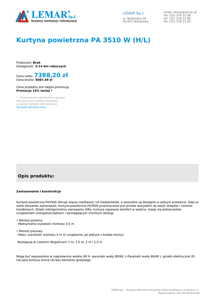 LEMAR Sp.J. ul. Bytomska 18 42-672 Wieszowa email: [email protected] tel: (32) 376 22 06 tel: (32) 376 21 85 tel: (32) 376 21 95 Kurtyna powietrzna PA 3510 W (H/L) Producent: Brak Dostępność: 3-14 dni roboczych 7388,20 zł Cena netto: Cena brutto: 9087,49 zł Cena produktu jest objęta promocją: Promocja 15% taniej * * - Promocja jest ograniczona czasowo. Aktualną cenę możesz sprawdzić w naszym sklepie internetowym. Sprawdź aktualną cenę Opis produktu: Zastosowanie i konstrukcja Kurtyna powietrzna PA3500 oferuje więcej możliwości niż kiedykolwiek, a wszystkie są dostępne w jednym produkcie. Daje to wiele obszarów zastosowań. Kurtyna powietrzna PA3500 przeznaczona jest przede wszystkim do wejść sklepów i centrów handlowych. Dzięki inteligentnemu sterowaniu SIRe, kurtyna zapewnia komfort w wejściu, stając się jednocześnie urządzeniem energooszczędnym i wymagającym minimum obsługi. • Montaż poziomy - Maksymalna wysokość montażu 3,5 m • Montaż pionowy - Maks. szerokość montażu 5 m (2 urządzenia, po jednym z każdej strony) Występują w czterech długościach 1 m, 1.5 m, 2 m i 2.5 m Mogą być wyposażone w nagrzewnicę wodna (W H- parametr wody 80/60, L-Parametr wody 60/40 ), grzałki elektryczne (E) lub jako kurtyna zimna (A)-bez elementu grzejnego. LEMAR Sp.J. - Niniejszy dokument nie stanowi oferty handlowej w rozumieniu k.c. Wygenerowano: 2017-03-08 04:59:00 LEMAR Sp.J. ul. Bytomska 18 42-672 Wieszowa email: [email protected] tel: (32) 376 22 06 tel: (32) 376 21 85 tel: (32) 376 21 95 LEMAR Sp.J. - Niniejszy dokument nie stanowi oferty handlowej w rozumieniu k.c. Wygenerowano: 2017-03-08 04:59:00 Powered by TCPDF (www.tcpdf.org)