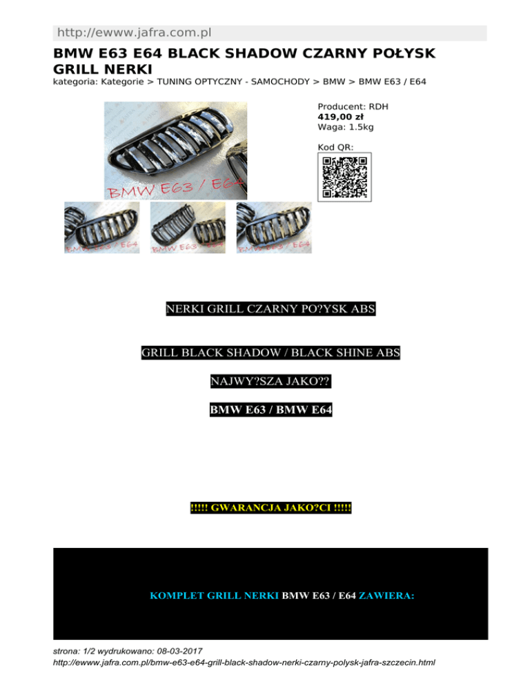 http://ewww.jafra.com.pl BMW E63 E64 BLACK SHADOW CZARNY POŁYSK GRILL NERKI kategoria: Kategorie > TUNING OPTYCZNY - SAMOCHODY > BMW > BMW E63 / E64 Producent: RDH 419,00 zł Waga: 1.5kg Kod QR: NERKI GRILL CZARNY PO?YSK ABS GRILL BLACK SHADOW / BLACK SHINE ABS NAJWY?SZA JAKO?? BMW E63 / BMW E64 !!!!! GWARANCJA JAKO?CI !!!!! KOMPLET GRILL NERKI BMW E63 / E64 ZAWIERA: strona: 1/2 wydrukowano: 08-03-2017 http://ewww.jafra.com.pl/bmw-e63-e64-grill-black-shadow-nerki-czarny-polysk-jafra-szczecin.html - KOLOR: Black Shadow / Czarny Po?ysk / Black Gloss / Black Shine - DWA ELEMENTY: 1. Dwie Nerki ( lewa i prawa strona ) wykonane z wysokiej jako?? ABS'u z wysokim po?yskiem 2. Pasuje idealnie, dok?adnie jak orygina? - Bardzo Wysoka Jako?? 3. Bardzo prosty monta? na Clipsy, dok?adnie jak oryginal 4. Grill Black Shadow nadaje agresywnego i sportowego wygl?du zachwycaj?c innych u?ytkowników dróg 5. Zastosowanie do BMW E63, BMW E64 2004 - 2010 6. Gwarancja 12mc Towar dost?pny od r?ki, Wysy?ka w 99% w dniu zamówienia strona: 2/2 wydrukowano: 08-03-2017 http://ewww.jafra.com.pl/bmw-e63-e64-grill-black-shadow-nerki-czarny-polysk-jafra-szczecin.html