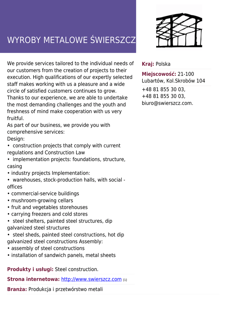 WYROBY METALOWE ŚWIERSZCZ We provide services tailored to the individual needs of our customers from the creation of projects to their execution. High qualifications of our expertly selected staff makes working with us a pleasure and a wide circle of satisfied customers continues to grow. Thanks to our experience, we are able to undertake the most demanding challenges and the youth and freshness of mind make cooperation with us very fruitful. As part of our business, we provide you with comprehensive services: Design: • construction projects that comply with current regulations and Construction Law • implementation projects: foundations, structure, casing • industry projects Implementation: • warehouses, stock-production halls, with social offices • commercial-service buildings • mushroom-growing cellars • fruit and vegetables storehouses • carrying freezers and cold stores • steel shelters, painted steel structures, dip galvanized steel structures • steel sheds, painted steel constructions, hot dip galvanized steel constructions Assembly: • assembly of steel constructions • installation of sandwich panels, metal sheets Produkty i usługi: Steel construction. Strona internetowa: http://www.swierszcz.com [1] Branża: Produkcja i przetwórstwo metali Kraj: Polska Miejscowość: 21-100 Lubartów, Kol.Skrobów 104 +48 81 855 30 03, +48 81 855 30 03, [email protected]. Źródło: http://www.invest.lubelskie.pl/pl/firma/wyroby-metalowe-swierszcz
