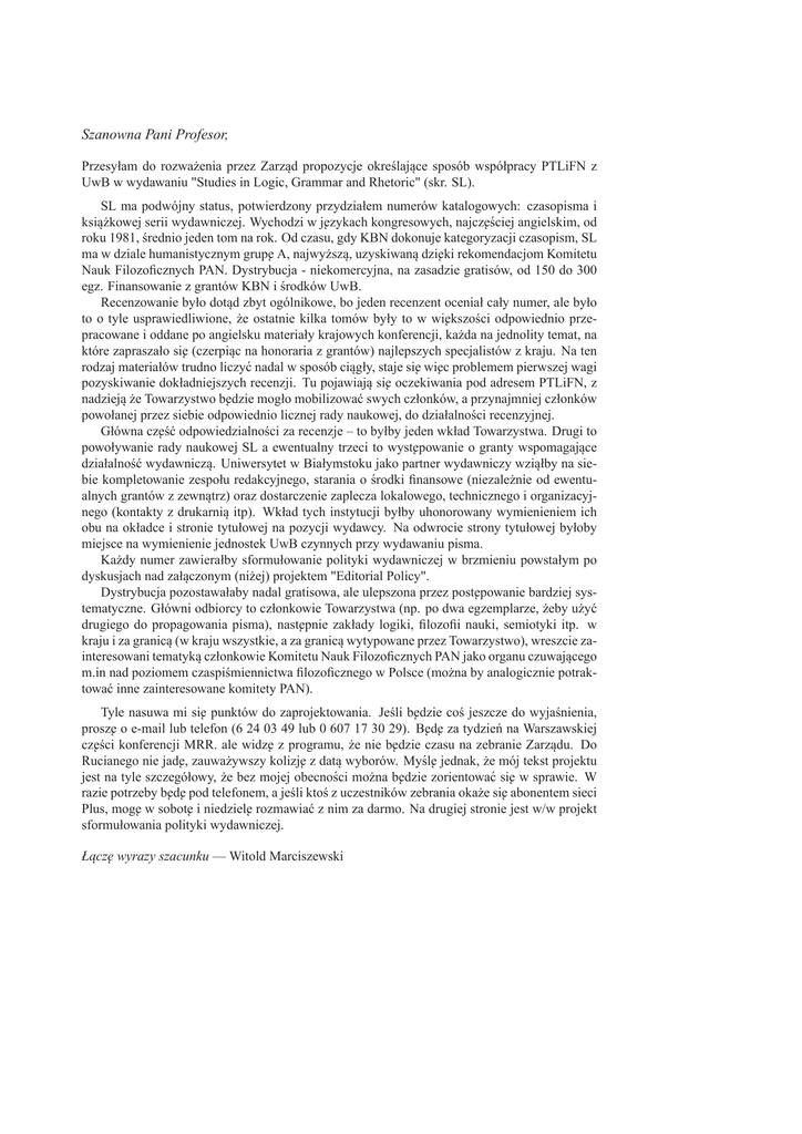 Szanowna Pani Profesor, Przesyłam do rozważenia przez Zarzad ˛ propozycje określajace ˛ sposób współpracy PTLiFN z UwB w wydawaniu "Studies in Logic, Grammar and Rhetoric" (skr. SL). SL ma podwójny status, potwierdzony przydziałem numerów katalogowych: czasopisma i ksiażkowej ˛ serii wydawniczej. Wychodzi w j˛ezykach kongresowych, najcz˛eściej angielskim, od roku 1981, średnio jeden tom na rok. Od czasu, gdy KBN dokonuje kategoryzacji czasopism, SL ma w dziale humanistycznym grup˛e A, najwyższa,˛ uzyskiwana˛ dzi˛eki rekomendacjom Komitetu Nauk Filozoficznych PAN. Dystrybucja - niekomercyjna, na zasadzie gratisów, od 150 do 300 egz. Finansowanie z grantów KBN i środków UwB. Recenzowanie było dotad ˛ zbyt ogólnikowe, bo jeden recenzent oceniał cały numer, ale było to o tyle usprawiedliwione, że ostatnie kilka tomów były to w wi˛ekszości odpowiednio przepracowane i oddane po angielsku materiały krajowych konferencji, każda na jednolity temat, na które zapraszało si˛e (czerpiac ˛ na honoraria z grantów) najlepszych specjalistów z kraju. Na ten rodzaj materiałów trudno liczyć nadal w sposób ciagły, ˛ staje si˛e wi˛ec problemem pierwszej wagi pozyskiwanie dokładniejszych recenzji. Tu pojawiaja˛ si˛e oczekiwania pod adresem PTLiFN, z nadzieja˛ że Towarzystwo b˛edzie mogło mobilizować swych członków, a przynajmniej członków powołanej przez siebie odpowiednio licznej rady naukowej, do działalności recenzyjnej. Główna cz˛eść odpowiedzialności za recenzje – to byłby jeden wkład Towarzystwa. Drugi to powoływanie rady naukowej SL a ewentualny trzeci to wyst˛epowanie o granty wspomagajace ˛ działalność wydawnicza.˛ Uniwersytet w Białymstoku jako partner wydawniczy wziałby ˛ na siebie kompletowanie zespołu redakcyjnego, starania o środki finansowe (niezależnie od ewentualnych grantów z zewnatrz) ˛ oraz dostarczenie zaplecza lokalowego, technicznego i organizacyjnego (kontakty z drukarnia˛ itp). Wkład tych instytucji byłby uhonorowany wymienieniem ich obu na okładce i stronie tytułowej na pozycji wydawcy. Na odwrocie strony tytułowej byłoby miejsce na wymienienie jednostek UwB czynnych przy wydawaniu pisma. Każdy numer zawierałby sformułowanie polityki wydawniczej w brzmieniu powstałym po dyskusjach nad załaczonym ˛ (niżej) projektem "Editorial Policy". Dystrybucja pozostawałaby nadal gratisowa, ale ulepszona przez post˛epowanie bardziej systematyczne. Główni odbiorcy to członkowie Towarzystwa (np. po dwa egzemplarze, żeby użyć drugiego do propagowania pisma), nast˛epnie zakłady logiki, filozofii nauki, semiotyki itp. w kraju i za granica˛ (w kraju wszystkie, a za granica˛ wytypowane przez Towarzystwo), wreszcie zainteresowani tematyka˛ członkowie Komitetu Nauk Filozoficznych PAN jako organu czuwajacego ˛ m.in nad poziomem czaspiśmiennictwa filozoficznego w Polsce (można by analogicznie potraktować inne zainteresowane komitety PAN). Tyle nasuwa mi si˛e punktów do zaprojektowania. Jeśli b˛edzie coś jeszcze do wyjaśnienia, prosz˛e o e-mail lub telefon (6 24 03 49 lub 0 607 17 30 29). B˛ed˛e za tydzień na Warszawskiej cz˛eści konferencji MRR. ale widz˛e z programu, że nie b˛edzie czasu na zebranie Zarzadu. ˛ Do Rucianego nie jad˛e, zauważywszy kolizj˛e z data˛ wyborów. Myśl˛e jednak, że mój tekst projektu jest na tyle szczegółowy, że bez mojej obecności można b˛edzie zorientować si˛e w sprawie. W razie potrzeby b˛ed˛e pod telefonem, a jeśli ktoś z uczestników zebrania okaże si˛e abonentem sieci Plus, mog˛e w sobot˛e i niedziel˛e rozmawiać z nim za darmo. Na drugiej stronie jest w/w projekt sformułowania polityki wydawniczej. Łacz˛ ˛ e wyrazy szacunku — Witold Marciszewski EDITORIAL POLICY This Journal’s title "Studies in Logic, Grammar and Rhethoric" is to cover three closely interconnected fields of research, each represented by a venerable historical name alluding to the classical Trivium. LOGIC is to mean both formal logic and the methodology of sciences, both related to theoretical computer science: logic – as related through computability theory that keeps on the course started with Hilbert, Gödel, Turing etc., and the methododology – through the issues like decidabilility, computational models for empirical theories, etc. GRAMMAR is to mean syntactic issues, esp. formal grammar and its relations to the theory of automata. RHETORIC is to be conceived in that broad Rennesaince sense (initiated still with Buridan) that involves not only the art of speech, corresponding to the modern theory of communication, but also the logic of practical life, whose modern counterpart is to be found in the theory of games, rules and formal models of economic behaviour, etc. It was the intention of the founders of The Polish Association for Logic and Philosophy of Science to create broad opportunities to develop collaboration and integration among logicians, mathematicians, computer scientists and philosophers from various, even fairly distant, fields of research. This Journal’s platform as broad as defined above, seems to exactly fit into those intentions. The aim of the Journal is to provide a forum for Polish authors, also those being at the start of their academic career. Those, owing to the careful reviews before publishing, as well as comments likely to follow publications, would be thereby efficiently assisted in their professional development. However, the most important this Journal’s aim is to become a forum of collaboration between Polish and foreign scholars. The Journal is published by the Polish Society for Logic and Philosophy of Science and the University of Białystok at which the journal originated in 1981 and obtained the output of 20 volumes. The Society appoints the Editorial Advisory Board and is bound to support the Editors in organizing the process of reviewing. The University, acting through its two departments, 