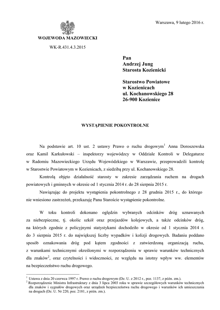 Warszawa, 9 lutego 2016 r. WOJEWODA MAZOWIECKI WK-R.431.4.3.2015 Pan Andrzej Jung Starosta Kozienicki Starostwo Powiatowe w Kozienicach ul. Kochanowskiego 28 26-900 Kozienice WYSTĄPIENIE POKONTROLNE Na podstawie art. 10 ust. 2 ustawy Prawo o ruchu drogowym 1 Anna Doroszewska oraz Kamil Karkułowski – inspektorzy wojewódzcy w Oddziale Kontroli w Delegaturze w Radomiu Mazowieckiego Urzędu Wojewódzkiego w Warszawie, przeprowadzili kontrolę w Starostwie Powiatowym w Kozienicach, z siedzibą przy ul. Kochanowskiego 28. Kontrolą objęto działalność starosty w zakresie zarządzania ruchem na drogach powiatowych i gminnych w okresie od 1 stycznia 2014 r. do 28 sierpnia 2015 r. Nawiązując do projektu wystąpienia pokontrolnego z 28 grudnia 2015 r., do którego nie wniesiono zastrzeżeń, przekazuję Panu Staroście wystąpienie pokontrolne. W toku kontroli dokonano oględzin wybranych odcinków dróg uznawanych za niebezpieczne, tj. okolic szkół oraz przejazdów kolejowych, a także odcinków dróg, na których zgodnie z policyjnymi statystykami dochodziło w okresie od 1 stycznia 2014 r. do 3 sierpnia 2015 r. do największej liczby wypadków i kolizji drogowych. Badaniu poddano sposób oznakowania dróg pod kątem zgodności z zatwierdzoną organizacją ruchu, z warunkami technicznymi określonymi w rozporządzeniu w sprawie warunków technicznych dla znaków2, oraz czytelności i widoczności, ze względu na istotny wpływ ww. elementów na bezpieczeństwo ruchu drogowego. 1 2 Ustawa z dnia 20 czerwca 1997 r. Prawo o ruchu drogowym (Dz. U. z 2012 r., poz. 1137, z późn. zm.). Rozporządzenie Ministra Infrastruktury z dnia 3 lipca 2003 roku w sprawie szczegółowych warunków technicznych dla znaków i sygnałów drogowych oraz urządzeń bezpieczeństwa ruchu drogowego i warunków ich umieszczania na drogach (Dz. U. Nr 220, poz. 2181, z późn. zm.). Kontrolą objęto również kompletność projektów organizacji ruchu pod kątem wymaganych opinii, tryb ich zatwierdzania, a także wykonywanie obowiązku przeprowadzania kontroli wynikającego z § 12 ust. 3 i 5 rozporządzenia o zarządzaniu ruchem3. Mając na uwadze wpływ istniejącej organizacji ruchu na bezpieczeństwo użytkowników dróg, w toku kontroli przeprowadzono oględziny w terenie obejmujące poniższe odcinki dróg powiatowych i gminnych: droga nr 1713W (Studzianki Pancerne – Ryczywół), na odcinku w miejscowości Basinów, gmina Magnuszew, droga nr 1715W (Brzóza – Radom), na odcinku w miejscowości Cecylówka, gmina Głowaczów, droga nr 1735W (Opactwo – Wólka Wojcieszkowa, w miejscowości Nagórnik, gmina Sieciechów) – na odcinku przy przejeździe kolejowym, droga nr 1731W (Sieciechów – Gniewoszów, w miejscowości Wola Klasztorna, gmina Sieciechów) – na odcinku przy przejeździe kolejowym, droga nr 170808W (ul. Piastowska w miejscowości Aleksandrówka, gmina Kozienice) – na odcinku przy przejeździe kolejowym, droga nr 170116W (ul. Fabryczna w miejscowości Garbatka–Letnisko, gmina Garbatka–Letnisko) – na odcinku przy przejeździe kolejowym, droga nr 1739W (Bogucin – Brzustów, granica gminy w miejscowości Bogucin, gmina Garbatka–Letnisko) – na odcinku przy przejeździe kolejowym, droga nr 170538W (Chinów – do drogi krajowej nr 79, w miejscowości Chinów, gmina Kozienice) – na odcinku przy przejeździe kolejowym, droga nr 1712W (Wola Chodkowska, gmina Kozienice) – na odcinku przy publicznej szkole podstawowej. Zatwierdzanie projektów organizacji ruchu oraz realizacja obowiązków kontrolnych I. W toku kontroli przedstawiono zatwierdzone przez Starostę 2 projekty stałej organizacji ruchu4, odnoszące się do odcinków dróg poddanych oględzinom5. Badaniu poddano ww. projekty organizacji ruchu. Projekty posiadały wszystkie wymagane opinie, zgodnie z § 7 ust. 2 rozporządzenia o zarządzaniu ruchem, które nie zawierały uwag dotyczących projektów organizacji ruchu, 3 4 5 2 Rozporządzenie Ministra Infrastruktury z dnia 23 września 2003 r. w sprawie szczegółowych warunków zarządzania ruchem na drogach oraz wykonywania nadzoru nad tym zarządzaniem (Dz. U. Nr 177, poz. 1729). Projekty stałej organizacji ruchu oznaczone: KM.III.7121.1.8.2014 oraz KM.III.7121.1.2.2012. Zatwierdzona organizacja ruchu obowiązywała na 2 z 9 odcinków dróg poddanych oględzinom, tj.: nr 170808W (ul. Piastowska w miejscowości Aleksandrówka, gmina Kozienice) oraz nr 170538W (Chinów – do drogi krajowej nr 79, w miejscowości Chinów, gmina Kozienice). oraz zostały zatwierdzone przez starostę. Zgodnie z regulacją § 8 ust. 7 rozporządzenia o zarządzaniu ruchem określano w nich termin, w którym powinna zostać wprowadzona zatwierdzona organizacja ruchu. Do Starosty Kozienickiego nie wpłynęły w okresie kontrolowanym skargi ani wnioski dotyczące organizacji ruchu na drogach poddanych oględzinom. W przypadku obu projektów stałej organizacji ruchu organ zarządzający ruchem został zawiadomiony przez jednostkę wprowadzającą organizację ruchu o terminie jej wprowadzenia i przeprowadził kontrolę wykonania zadań technicznych wynikających z realizacji projektów, o której mowa w § 12 ust. 3 rozporządzenia o zarządzaniu ruchem. W odniesieniu do 9 odcinków dróg poddanych oględzinom, w stosunku do których organ zarządzający ruchem był zobowiązany na podstawie § 12 ust. 5 rozporządzenia o zarządzaniu ruchem do przeprowadzenia co najmniej raz na 6 miesięcy kontroli prawidłowości zastosowania, wykonania, funkcjonowania i utrzymania znaków drogowych, urządzeń sygnalizacji świetlnej, urządzeń sygnalizacji dźwiękowej oraz urządzeń bezpieczeństwa ruchu drogowego, ustalono że: w przypadku 6 odcinków dróg powiatowych6 zachowano wymaganą częstotliwość kontroli – kontrole były wykonane w kwietniu i październiku 2014 r. oraz w maju 2015 r., w przypadku 3 dróg gminnych7 nie przeprowadzono żadnej kontroli – inspektor w Wydziale Komunikac