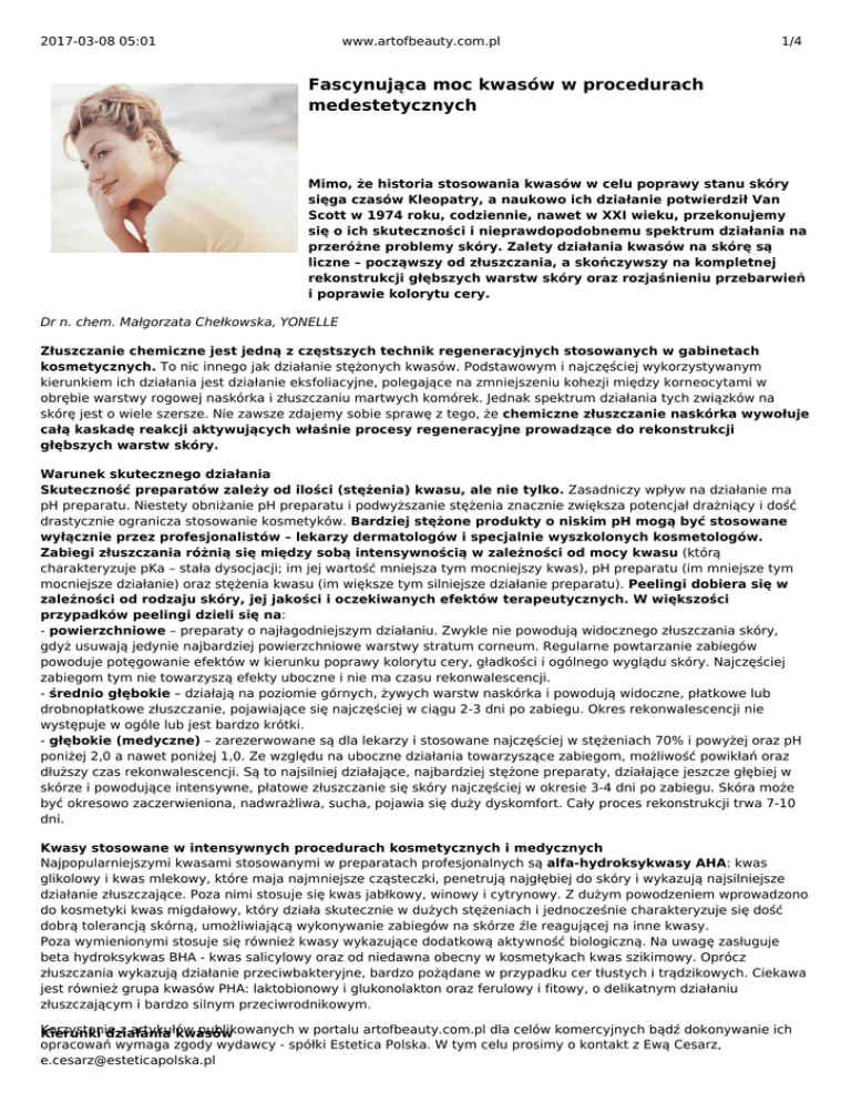 2017-03-08 05:01 www.artofbeauty.com.pl 1/4 Fascynująca moc kwasów w procedurach medestetycznych Mimo, że historia stosowania kwasów w celu poprawy stanu skóry sięga czasów Kleopatry, a naukowo ich działanie potwierdził Van Scott w 1974 roku, codziennie, nawet w XXI wieku, przekonujemy się o ich skuteczności i nieprawdopodobnemu spektrum działania na przeróżne problemy skóry. Zalety działania kwasów na skórę są liczne – począwszy od złuszczania, a skończywszy na kompletnej rekonstrukcji głębszych warstw skóry oraz rozjaśnieniu przebarwień i poprawie kolorytu cery. Dr n. chem. Małgorzata Chełkowska, YONELLE Złuszczanie chemiczne jest jedną z częstszych technik regeneracyjnych stosowanych w gabinetach kosmetycznych. To nic innego jak działanie stężonych kwasów. Podstawowym i najczęściej wykorzystywanym kierunkiem ich działania jest działanie eksfoliacyjne, polegające na zmniejszeniu kohezji między korneocytami w obrębie warstwy rogowej naskórka i złuszczaniu martwych komórek. Jednak spektrum działania tych związków na skórę jest o wiele szersze. Nie zawsze zdajemy sobie sprawę z tego, że chemiczne złuszczanie naskórka wywołuje całą kaskadę reakcji aktywujących właśnie procesy regeneracyjne prowadzące do rekonstrukcji głębszych warstw skóry. Warunek skutecznego działania Skuteczność preparatów zależy od ilości (stężenia) kwasu, ale nie tylko. Zasadniczy wpływ na działanie ma pH preparatu. Niestety obniżanie pH preparatu i podwyższanie stężenia znacznie zwiększa potencjał drażniący i dość drastycznie ogranicza stosowanie kosmetyków. Bardziej stężone produkty o niskim pH mogą być stosowane wyłącznie przez profesjonalistów – lekarzy dermatologów i specjalnie wyszkolonych kosmetologów. Zabiegi złuszczania różnią się między sobą intensywnością w zależności od mocy kwasu (którą charakteryzuje pKa – stała dysocjacji; im jej wartość mniejsza tym mocniejszy kwas), pH preparatu (im mniejsze tym mocniejsze działanie) oraz stężenia kwasu (im większe tym silniejsze działanie preparatu). Peelingi dobiera się w zależności od rodzaju skóry, jej jakości i oczekiwanych efektów terapeutycznych. W większości przypadków peelingi dzieli się na: - powierzchniowe – preparaty o najłagodniejszym działaniu. Zwykle nie powodują widocznego złuszczania skóry, gdyż usuwają jedynie najbardziej powierzchniowe warstwy stratum corneum. Regularne powtarzanie zabiegów powoduje potęgowanie efektów w kierunku poprawy kolorytu cery, gładkości i ogólnego wyglądu skóry. Najczęściej zabiegom tym nie towarzyszą efekty uboczne i nie ma czasu rekonwalescencji. - średnio głębokie – działają na poziomie górnych, żywych warstw naskórka i powodują widoczne, płatkowe lub drobnopłatkowe złuszczanie, pojawiające się najczęściej w ciągu 2-3 dni po zabiegu. Okres rekonwalescencji nie występuje w ogóle lub jest bardzo krótki. - głębokie (medyczne) – zarezerwowane są dla lekarzy i stosowane najczęściej w stężeniach 70% i powyżej oraz pH poniżej 2,0 a nawet poniżej 1,0. Ze względu na uboczne działania towarzyszące zabiegom, możliwość powikłań oraz dłuższy czas rekonwalescencji. Są to najsilniej działające, najbardziej stężone preparaty, działające jeszcze głębiej w skórze i powodujące intensywne, płatowe złuszczanie się skóry najczęściej w okresie 3-4 dni po zabiegu. Skóra może być okresowo zaczerwieniona, nadwrażliwa, sucha, pojawia się duży dyskomfort. Cały proces rekonstrukcji trwa 7-10 dni. Kwasy stosowane w intensywnych procedurach kosmetycznych i medycznych Najpopularniejszymi kwasami stosowanymi w preparatach profesjonalnych są alfa-hydroksykwasy AHA: kwas glikolowy i kwas mlekowy, które maja najmniejsze cząsteczki, penetrują najgłębiej do skóry i wykazują najsilniejsze działanie złuszczające. Poza nimi stosuje się kwas jabłkowy, winowy i cytrynowy. Z dużym powodzeniem wprowadzono do kosmetyki kwas migdałowy, który działa skutecznie w dużych stężeniach i jednocześnie charakteryzuje się dość dobrą tolerancją skórną, umożliwiającą wykonywanie zabiegów na skórze źle reagującej na inne kwasy. Poza wymienionymi stosuje się również kwasy wykazujące dodatkową aktywność biologiczną. Na uwagę zasługuje beta hydroksykwas BHA - kwas salicylowy oraz od niedawna obecny w kosmetykach kwas szikimowy. Oprócz złuszczania wykazują działanie przeciwbakteryjne, bardzo pożądane w przypadku cer tłustych i trądzikowych. Ciekawa jest również grupa kwasów PHA: laktobionowy i glukonolakton oraz ferulowy i fitowy, o delikatnym działaniu złuszczającym i bardzo silnym przeciwrodnikowym. Korzystanie z artykułów publikowanych w portalu artofbeauty.com.pl dla celów komercyjnych bądź dokonywanie ich Kierunki działania kwasów opracowań wymaga zgody wydawcy - spółki Estetica Polska. W tym celu prosimy o kontakt z Ewą Cesarz, [email protected] 2017-03-08 05:01 www.artofbeauty.com.pl 2/4 DZIAŁANIE 1. Złuszczanie Pierwotną i podstawową funkcją zabiegów z wykorzystaniem stężonych kwasów jest usuwanie martwych lub zniszczonych komórek górnych warstw skóry. Kwasy zmniejszają kohezję między keratynocytami warstwy rogowej naskórka. Choć mechanizm tego działania nie jest do końca wyjaśniony, to najczęściej dowodzi się ich aktywności w kierunku hydrolizowania wiązań w desmosomach, stanowiących połączenia między komórkami oraz zmniejszana spoistości cementu międzykomórkowego poprzez aktywowanie specyficznych enzymów prowadzące do modyfikacji jego składu. DZIAŁANIE 2. Przyspieszenie cyklu odnowy komórkowej Stwierdzonym, potwierdzonym w badaniach klinicznych efektem działania kwasów jest przyspieszenie tempa odnowy komórkowej. W młodej skórze cykl od powstania do złuszczenia się komórek naskórka TOT (Turnover Time) trwa przeciętnie 4 tygodnie, czyli 28 