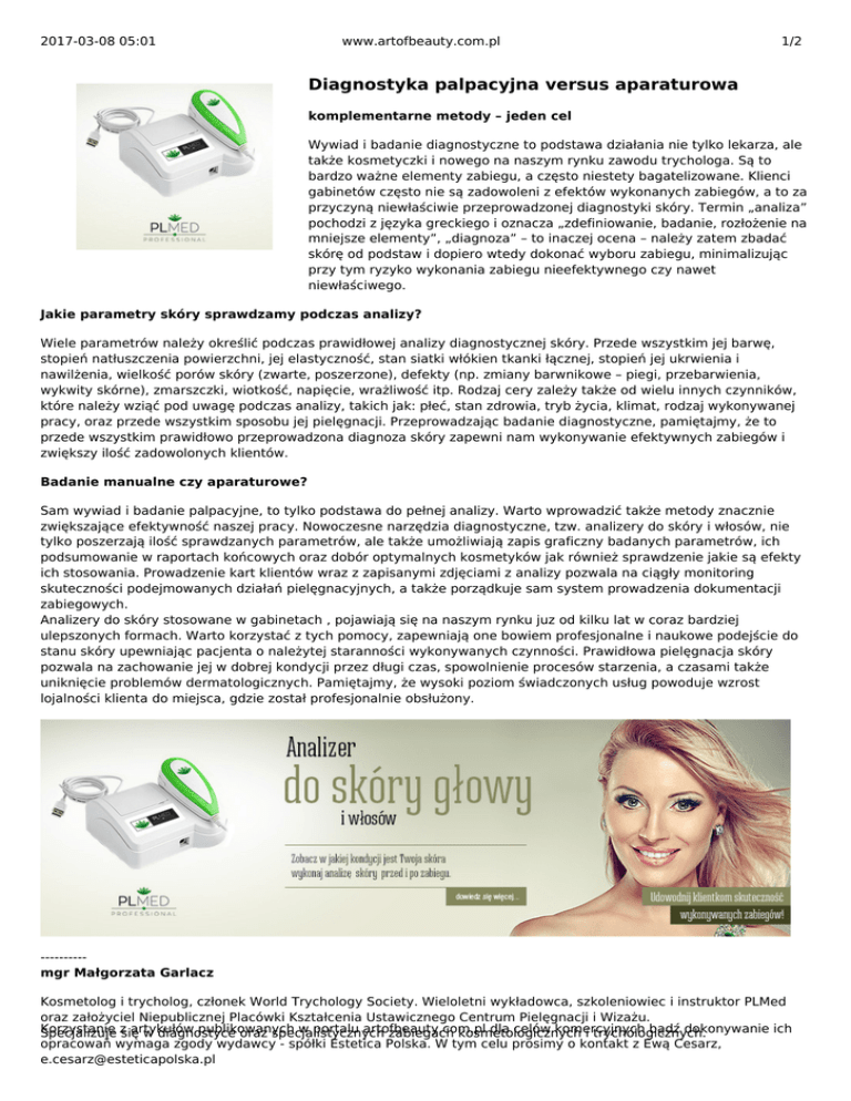 2017-03-08 05:01 www.artofbeauty.com.pl 1/2 Diagnostyka palpacyjna versus aparaturowa komplementarne metody – jeden cel Wywiad i badanie diagnostyczne to podstawa działania nie tylko lekarza, ale także kosmetyczki i nowego na naszym rynku zawodu trychologa. Są to bardzo ważne elementy zabiegu, a często niestety bagatelizowane. Klienci gabinetów często nie są zadowoleni z efektów wykonanych zabiegów, a to za przyczyną niewłaściwie przeprowadzonej diagnostyki skóry. Termin „analiza” pochodzi z języka greckiego i oznacza „zdefiniowanie, badanie, rozłożenie na mniejsze elementy”, „diagnoza” – to inaczej ocena – należy zatem zbadać skórę od podstaw i dopiero wtedy dokonać wyboru zabiegu, minimalizując przy tym ryzyko wykonania zabiegu nieefektywnego czy nawet niewłaściwego. Jakie parametry skóry sprawdzamy podczas analizy? Wiele parametrów należy określić podczas prawidłowej analizy diagnostycznej skóry. Przede wszystkim jej barwę, stopień natłuszczenia powierzchni, jej elastyczność, stan siatki włókien tkanki łącznej, stopień jej ukrwienia i nawilżenia, wielkość porów skóry (zwarte, poszerzone), defekty (np. zmiany barwnikowe – piegi, przebarwienia, wykwity skórne), zmarszczki, wiotkość, napięcie, wrażliwość itp. Rodzaj cery zależy także od wielu innych czynników, które należy wziąć pod uwagę podczas analizy, takich jak: płeć, stan zdrowia, tryb życia, klimat, rodzaj wykonywanej pracy, oraz przede wszystkim sposobu jej pielęgnacji. Przeprowadzając badanie diagnostyczne, pamiętajmy, że to przede wszystkim prawidłowo przeprowadzona diagnoza skóry zapewni nam wykonywanie efektywnych zabiegów i zwiększy ilość zadowolonych klientów. Badanie manualne czy aparaturowe? Sam wywiad i badanie palpacyjne, to tylko podstawa do pełnej analizy. Warto wprowadzić także metody znacznie zwiększające efektywność naszej pracy. Nowoczesne narzędzia diagnostyczne, tzw. analizery do skóry i włosów, nie tylko poszerzają ilość sprawdzanych parametrów, ale także umożliwiają zapis graficzny badanych parametrów, ich podsumowanie w raportach końcowych oraz dobór optymalnych kosmetyków jak również sprawdzenie jakie są efekty ich stosowania. Prowadzenie kart klientów wraz z zapisanymi zdjęciami z analizy pozwala na ciągły monitoring skuteczności podejmowanych działań pielęgnacyjnych, a także porządkuje sam system prowadzenia dokumentacji zabiegowych. Analizery do skóry stosowane w gabinetach , pojawiają się na naszym rynku juz od kilku lat w coraz bardziej ulepszonych formach. Warto korzystać z tych pomocy, zapewniają one bowiem profesjonalne i naukowe podejście do stanu skóry upewniając pacjenta o należytej staranności wykonywanych czynności. Prawidłowa pielęgnacja skóry pozwala na zachowanie jej w dobrej kondycji przez długi czas, spowolnienie procesów starzenia, a czasami także uniknięcie problemów dermatologicznych. Pamiętajmy, że wysoki poziom świadczonych usług powoduje wzrost lojalności klienta do miejsca, gdzie został profesjonalnie obsłużony. ---------mgr Małgorzata Garlacz Kosmetolog i trycholog, członek World Trychology Society. Wieloletni wykładowca, szkoleniowiec i instruktor PLMed oraz założyciel Niepublicznej Placówki Kształcenia Ustawicznego Centrum Pielęgnacji i Wizażu. Korzystanie artykułów publikowanych w portalu artofbeauty.com.pl dla celów komercyjnych bądź dokonywanie ich Specjalizuje zsię w diagnostyce oraz specjalistycznych zabiegach kosmetologicznych i trychologicznych. opracowań wymaga zgody wydawcy - spółki Estetica Polska. W tym celu prosimy o kontakt z Ewą Cesarz, [email protected] 2017-03-08 05:01 www.artofbeauty.com.pl 2/2 Informacje: PLMED Sp. z o.o. ul. św. Krzyża 19/8, 31-023 Kraków tel. 669 797 079, 790 499 993 www.mgarlacz.pl, www.plmed.com.pl Korzystanie z artykułów publikowanych w portalu artofbeauty.com.pl dla celów komercyjnych bądź dokonywanie ich opracowań wymaga zgody wydawcy - spółki Estetica Polska. W tym celu prosimy o kontakt z Ewą Cesarz, [email protected]