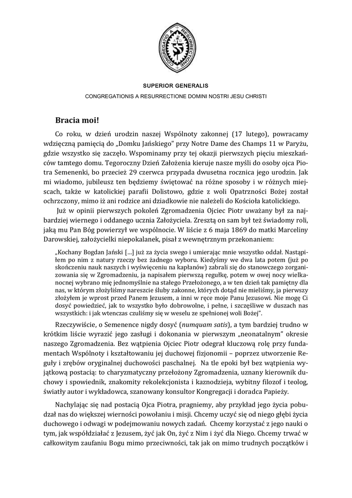 SUPERIOR GENERALIS CONGREGATIONIS A RESURRECTIONE DOMINI NOSTRI JESU CHRISTI Bracia moi! Co roku, w dzień urodzin naszej Wspólnoty zakonnej (17 lutego), powracamy wdzięczną pamięcią do „Domku Jańskiego” przy Notre Dame des Champs 11 w Paryżu, gdzie wszystko się zaczęło. Wspominamy przy tej okazji pierwszych pięciu mieszkańców tamtego domu. Tegoroczny Dzień Założenia kieruje nasze myśli do osoby ojca Piotra Semenenki, bo przecież 29 czerwca przypada dwusetna rocznica jego urodzin. Jak mi wiadomo, jubileusz ten będziemy świętować na różne sposoby i w różnych miejscach, także w katolickiej parafii Dolistowo, gdzie z woli Opatrzności Bożej został ochrzczony, mimo iż ani rodzice ani dziadkowie nie należeli do Kościoła katolickiego. Już w opinii pierwszych pokoleń Zgromadzenia Ojciec Piotr uważany był za najbardziej wiernego i oddanego ucznia Założyciela. Zresztą on sam był też świadomy roli, jaką mu Pan Bóg powierzył we wspólnocie. W liście z 6 maja 1869 do matki Marceliny Darowskiej, założycielki niepokalanek, pisał z wewnętrznym przekonaniem: „Kochany Bogdan Jański […] już za życia swego i umierając mnie wszystko oddał. Nastąpiłem po nim z natury rzeczy bez żadnego wyboru. Kiedyśmy we dwa lata potem (już po skończeniu nauk naszych i wyświęceniu na kapłanów) zabrali się do stanowczego zorganizowania się w Zgromadzeniu, ja napisałem pierwszą regułkę, potem w owej nocy wielkanocnej wybrano mię jednomyślnie na stałego Przełożonego, a w ten dzień tak pamiętny dla nas, w którym złożyliśmy nareszcie śluby zakonne, których dotąd nie mieliśmy, ja pierwszy złożyłem je wprost przed Panem Jezusem, a inni w ręce moje Panu Jezusowi. Nie mogę Ci dosyć powiedzieć, jak to wszystko było dobrowolne, i pełne, i szczęśliwe w duszach nas wszystkich: i jak wtenczas czuliśmy się w weselu ze spełnionej woli Bożej”. Rzeczywiście, o Semenence nigdy dosyć (numquam satis), a tym bardziej trudno w krótkim liście wyrazić jego zasługi i dokonania w pierwszym „neonatalnym” okresie naszego Zgromadzenia. Bez wątpienia Ojciec Piotr odegrał kluczową rolę przy fundamentach Wspólnoty i kształtowaniu jej duchowej fizjonomii – poprzez utworzenie Reguły i zrębów oryginalnej duchowości paschalnej. Na tle epoki był bez wątpienia wyjątkową postacią: to charyzmatyczny przełożony Zgromadzenia, uznany kierownik duchowy i spowiednik, znakomity rekolekcjonista i kaznodzieja, wybitny filozof i teolog, światły autor i wykładowca, szanowany konsultor Kongregacji i doradca Papieży. Nachylając się nad postacią Ojca Piotra, pragniemy, aby przykład jego życia pobudzał nas do większej wierności powołaniu i misji. Chcemy uczyć się od niego głębi życia duchowego i odwagi w podejmowaniu nowych zadań. Chcemy korzystać z jego nauki o tym, jak współdziałać z Jezusem, żyć jak On, żyć z Nim i żyć dla Niego. Chcemy trwać w całkowitym zaufaniu Bogu mimo przeciwności, tak jak on mimo trudnych początków i cierpienia doznanego także ze strony współbraci, nigdy nie zwątpił w sens obranej drogi. Zawsze był przekonany, że jako zmartwychwstańcy zostaliśmy powołani, by być posłańcami największej nadziei, którą jest Chrystus; że nie wolno nam patrzeć ze smutkiem, lękiem i obawami w przyszłość; że trzeba mieć przenikliwy wzrok wiary, który potrafi dostrzec światło płynące od Zmartwychwstałego Pana. Jako duchowi synowie Ojca Piotra wierzymy, że „jego bratnia modlitwa nas wspomaga”. Sam nas przecież uczył, iż „w modlitwie tylko moc nasza, tam nabieramy sił do zwyciężania przeszkód, do spełniania dobrych uczynków wszystkich, do doskonalenia się coraz wyższego w cnocie, do połączenia się z Bogiem”. On też pierwszy został zgłoszony do procesu kanonizacyjnego w Kongregacji Świętych. Tak się jednak historia potoczyła, że wyprzedził go Bogdan Jański i Paweł Smolikowski. To jednak nie przeszkadza, by prosić w modlitwie tego, który nadał kierunek Zgromadzeniu. Drodzy Bracia! Dzień Założenia przypomina nam, że wszyscy jesteśmy spadkobiercami (dzieła, które Bóg zapoczątkował 178 lat temu) wielkich idei Domku Jańskiego, i wszyscy wezwani do odkrywania i interpretowania charyzmatu założycielskiego oraz urzeczywistniania go w nowy sposób w dzisiejszych czasach. Praca nad odkrywaniem pierwotnego ducha i coraz lepsza znajomość założycieli jest zadaniem kolejnych pokoleń, a jedocześnie – jak zauważył papież Benedykt XVI – bardzo skutecznym środkiem, by ożywić wspólnoty zakonne i nadać im nowy impuls ascetyczny, apostolski i misyjny; by już istniejące dzieła i formy działalności zostały na nowo ożywione przez nowe siły; by pojawiły się nowe inicjatywy, będące autentyczną realizacją charyzmatu założycieli (por. Przemówienie z 18 lutego 2008). Jestem głęboko przekonany, że także my potrzebujemy ciągle nowych impulsów, by rozwijać życie duchowe i apostolskie, by kontynuować misję Zgromadzenia z nową mocą mimo uszczuplających się ludzkich zasobów. Tym, co uderza w przywołanym na początku liście, jest promieniowanie radości i szczęścia z otrzymanego daru powołania oraz wiernego realizowania Bożego zamysłu. Darmowe, niczym nie zasłużone wezwanie pod sztandar Zmartwychwstałego winno być dla nas źródłem entuzjazmu, radości i szczęścia, którego sobie i Wam życzę i w modlitwie wypraszam. Z ojcowskim błogosławieństwem i braterskim pozdrowieniem! In Christo Redivivo Bernard Hylla CR Przełożony Generalny Rzym, 17 lutego 2014 roku, w 178. rocznicę założenia Domku Jańskiego