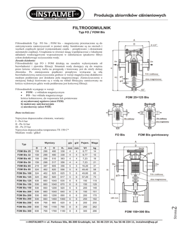 FILTROODMULNIK Filtroodmulnik Typ FO bis ; FOM bis – magnetyczny przeznaczone s do zatrzymywania zanieczyszcze w postaci stałej. Instalowane s na sieciach i w złach cieplnych (przed wymiennikami ciepła – przepływami i elementami automatyki cieplnej). Urz dzenia te równie mog współpracowa z lokalnymi układami wodoci gowymi wyposa onymi w od elaziacze (piaskowe filtry) celem dodatkowego oczyszczenia wody. Zasada działania: Filtroodmulniki typ FO i FOM działaj na zasadzie wykorzystania sił bezwładno ci i zjawiska filtracji. Strumie wody dostaj cy si do wn trza przez króciec wlotowy trafia na przegrod i kierowany jest do strefy dolnej zbiornika. Po zmniejszeniu pr dko ci przepływu wytr cane s sił bezwładno ciow zanieczyszczenia grubsze w wersji magnetycznej dodatkowo medium poddawane jest działaniu pola magnetycznego. Zanieczyszczenia o mniejszej frakcji kierowane s z wod na wkład filtracyjny zamocowany na kró cu wylotowym gdzie woda poddawana jest ko cowej filtracji. Filtroodmulnik wyst puje w wersji: • FOM – z wkładem magnetycznym • FO – bez wkładu magnetycznego kró ce kołnierzowe, do wspawania lub gwintowane a) ocynkowanej ogniowo (atest PZH) b) malowany antykorozyjnie c) nierdzewny (atest PZH) FOM 25÷125 Bis Dane techniczne: Najwy sze dopuszczalne ci nienie, warianty: I - Pn 6 bar II - Pn 16 bar III - Pn 25 bar Najwy sza dopuszczalna temperatura TS 150 C* Medium: woda / glikol Wymiary Typ FOM Bis 25 D 159 A 298 H 480 FO Bis g/p H1 338 g/d mm mm 4 4 Pojem. Waga V/l 6,77 kg 14 FOM Bis 32 159 298 480 338 4 4 6,77 15 FOM Bis 40 159 298 510 363 4 4 7,23 19 FOM Bis 50 159 298 517 356 4 4 7,23 21 FOM Bis 65 219 397 605 356 5 5 16,20 31 FOM Bis 80 324 462 820 556 5 6 49,40 58 FOM Bis 100 324 462 825 625 5 6 49,80 65 FOM Bis 125 324 462 920 617 5 6 57,20 73 FOM Bis 125 508 660 1040 635 6 6 150 118 FOM Bis 150 508 660 1040 670 6 6 150 129 FOM Bis 150 508 660 1290 920 6 6 200 148 FOM Bis 200 508 660 1040 640 6 6 150 151 FOM Bis 200 508 660 1290 890 6 6 200 170 FOM Bis 200 508 660 1460 1060 6 6 250 182 FOM Bis 250 608 768 985 620 8 8 200 250 FOM Bis 250 608 768 1155 790 8 8 250 262 FOM Bis 300 608 768 1780 1180 8 8 300 286 >>-?0 @ AA 5 & 3; , 94)*;; FOM Bis gwintowany $ B $C # 34 /4 FOM 150÷300 Bis : /, ( D 34 /4 / , # E& Charakterystyka przepływów dla FILTROODMULNIKA - współczynnik oporu miejscowego: dla typ FO = 2 dla typ FOM = 3 p = f(V) p= x V2/2 Charakterystyka przepływu dla FO-40 i FOM 40 Charakterystyka przepływu dla FO-50 i FOM 50 Charakterystyka przepływu dla FO-65 i FOM 65 Charakterystyka przepływu dla FO-80 i FOM 80 Charakterystyka przepływu dla FO-100 i FOM 100 Charakterystyka przepływu dla FO-125 i FOM 125 Charakterystyka przepływu dla FO-150 i FOM 150 Charakterystyka przepływu dla FO-200 i FOM 200 >>-?0 @ AA 5 & 3; , 94)*;; $ B $C # 34 /4 : /, ( D 34 /4 / , # E&