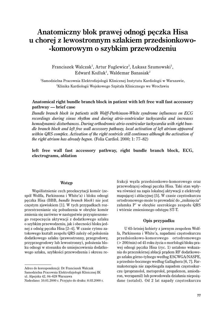 Anatomiczny blok prawej odnogi pęczka Hisa u chorej z lewostronnym szlakiem przedsionkowo-komorowym o szybkim przewodzeniu Franciszek Walczak 1, Artur Fuglewicz 2, Łukasz Szumowski 1, Edward Koźluk 1, Waldemar Banasiak 2 1 Samodzielna Pracownia Elektrofizjologii Klinicznej Instytutu Kardiologii w Warszawie, 2 Klinika Kardiologii Wojskowego Szpitala Klinicznego we Wrocławiu Anatomical right bundle branch block in patient with left free wall fast accessory pathway — brief case Bundle branch block in patients with Wolff-Parkinson-White syndrome influences on ECG recordings during sinus rhythm and during atrio-ventricular tachycardia and increases hemodynamic disturbances. During orthodromic atrio-ventricular tachycardia with right bundle branch block and left free wall accessory pathway, local activation of left atrium appeared within QRS complex. Activation of the right ventricle still continues although the activation of the right atrium has already begun. (Folia Cardiol. 2000; 1: 77–82) left free wall fast accessory pathway, right bundle branch block, ECG, electrograms, ablation Wstęp Współistnienie cech preekscytacji komór (zespół Wolffa, Parkinsona i White’a) i bloku odnogi pęczka Hisa (BBB, bundle branch block) nie jest częstym zjawiskiem [1]. W tych przypadkach rozprzestrzenianie się pobudzenia w obrębie komór zmienia się zarówno w następstwie przyspieszonego rozpoczęcia aktywacji z dodatkowego szlaku o szybkim przewodzeniu, jak i obecności bloku jednej z odnóg pęczka Hisa [2–4]. W czasie rytmu zatokowego kształt zespołu QRS zależy od położenia dodatkowego szlaku (prawostronny, przegrodowy, przyprzegrodowy lub lewostronny), położenia bloku odnogi w stosunku do umiejscowienia dodatkowego szlaku, szybkości przewodzenia i okresu re- Adres do korespondencji: Dr Franciszek Walczak Samodzielna Pracownia Elektrofizjologii Klinicznej IK ul. Alpejska 42, 04–628 Warszawa Nadesłano: 10.01.2000 r. Przyjęto do druku: 8.03.2000 r. frakcji węzła przedsionkowo-komorowego oraz przewodzącej odnogi pęczka Hisa. Taki stan wpływa również na zapis lokalnej aktywacji z elektrody mapującej i ablacyjnej [5]. W czasie częstoskurczu ortodromowego może to prowadzić do „zniknięcia” załamka P’ w obrębie szerokiego zespołu QRS i wtórnie zmienionego odstępu ST-T. Opis przypadku U 65-letniej kobiety z jawnym zespołem Wolffa, Parkinsona i White’a, napadami częstoskurczu przedsionkowo-komorowego ortodromowego (> 200/min) od 45 roku życia o morfologii bloku prawej odnogi pęczka Hisa (ryc. 1) ustalono wskazania do przezskórnej ablacji prądem RF dodatkowego szlaku górno-tylnego według ESCWGA/NASPE, a przednio-bocznego według Gallaghera [6, 7]. Farmakoterapia nie zapobiegała napadom częstoskurczu (propranolol, metoprolol, propafenon, amiodaron, werapamil) lub powodowała działania niepożądane (sotalol). Od 2 lat napady częstoskurczu 77 Folia Cardiol. 2000, tom 7, nr 1 występowały częściej, 5-krotnie z epizodem utraty przytomności. Napady przerywano wstrzyknięciem dożylnym werapamilu, a ostatnio adenozyny. Na podstawie wykonanych badań (echokardiografia, koronarografia, całodobowe EKG) wykluczono obecność organicznej choroby serca. U chorej wykonano ablację RF ujścia komorowego dodatkowego szlaku łączącego wolną ścianę lewego przedsionka z lewą komorą, z dojścia transaortalnego. W miejscu skutecznej ablacji objawy przewodzenia przez dodatkowy szlak rozpoczynały się w 65 ms aktywacji mięśnia lewej komory. Dopiero w tym czasie rozpoczęła się aktywacja mięśnia prawej komory, która kończy się w 140 ms (ryc. 2). Skuteczność ablacji potwierdzono badaniem elektrofizjologicznym. Cechy przewodzenia przez dodatkowy szlak i napady częstoskurczu nie nawróciły w okresie 2-letniej obserwacji. Dyskusja U chorych z szybko przewodzącym dodatkowym szlakiem przedsionkowo-komorowym w kie- runku zstępującym, prawidłowym węzłem przedsionkowo-komorowym, a bez anatomicznego bloku odnogi pęczka Hisa stopień preekscytacji zależy przede wszystkim od położenia dodatkowego szlaku. Pewien wpływ ma również zachowanie się układu autonomicznego. W przypadku szlaku prawostronnego górnego i przyprzegrodowego górnego (przedniego i przegrodowego przedniego wg Gallaghera) dominują cechy preekscytacji, a u chorego ze szlakiem lewostronnym tylnym (bocznym wg Gallaghera) zwykle dominuje przewodzenie przezfizjologiczne; cechy preekscytacji są niewielkie. W przypadku szlaku przyprzegrodowego dolnego (przegrodowego tylnego wg Gallaghera) i dolnego prawego (tylnego prawego wg Gallaghera) cechy preekscytacji są umiarkowane. Kierunek fali delta pozwala określić położenie dodatkowego szlaku. Obecność trwałego bloku odnogi pęczka Hisa może utrudnić ocenę położenia dodatkowego szlaku (AP, accessory pathway) z powodu „podwójnie” zmienionego toru depolaryzacji mięśnia komór [5]. Stan ten nasuwa jednak pewne wnioski diagnostyczne. Współistnienie cech preekscytacji z cechami Ryc. 1. Częstoskurcz przedsionkowo-komorowy ortodromowy (cykl 270 ms) o morfologii prawej odnogi pęczka Hisa. Niewidoczne załamki P’. Aktywacja lewego przedsionka odbywa się podczas aktywacji prawej komory, a aktywacja prawego przedsionka pogłębia zniekształcenie odcinka ST wywołane blokiem odnogi. Fig. 1. Orthodromic atrio-ventricular tachycardia (CL 270 ms) with right bundle branch block. P’ is within QRS complex . Left atrium activation begins during right ventricular activation. Right atrial activation increased abnormality of ST interval secondary to block of the bundle. 78 F. Walczak i wsp., Anatomiczny blok prawej odnogi pęczka Hisa Ryc. 2. W czasie częstoskurczu przedsionkowo-komorowego ortodromowego (cykl 290 ms), z cechami bloku zupełnego prawej odnogi pęczka Hisa (QRS 140 ms), lokalna aktywacja lewego przedsionka wyprzedza aktywację prawej komory . Aktywację lewego przedsionka poprzedza sygnał pęczka Kenta (K) w 