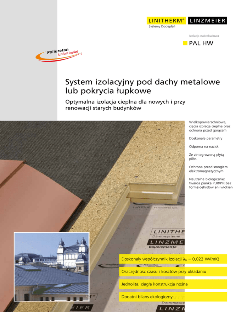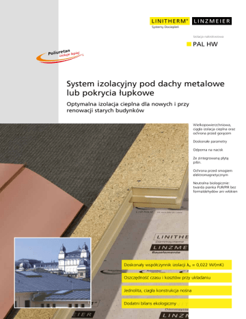 L I N I T H E R M® L I N Z M E I E R Systemy Dociepleñ Elementy Budowlane Izolacja nakrokwiowa PAL HW System izolacyjny pod dachy metalowe lub pokrycia łupkowe Optymalna izolacja cieplna dla nowych i przy renowacji starych budynków Wielkopowierzchniowa, ciągła izolacja cieplna oraz ochrona przed gorącem Doskonałe parametry Odporna na nacisk Ze zintegrowaną płytą pilśn. Ochrona przed smogiem elektromagnetycznym Neutralna biologicznie: twarda pianka PUR/PIR bez formaldehydów ani włókien Doskonały współczynnik izolacji λD = 0,022 W/(mK) Oszczędność czasu i kosztów przy układaniu Jednolita, ciagła konstrukcja nośna Dodatni bilans ekologiczny LINZMEIER L I N I T H E R M® Elementy Budowlane Systemy Dociepleñ LINITHERM PAL HW LINITHERM PAL HW na deskowaniu Rdzeń izolacyjny: Warstwa kryjąca (powierzchniowa): PUR/ PIR - twarda pianka według PN-EN 13165, klasa E, obustronnie z folią aluminiową oklejona płytą pilśniową P5, grubość 22 mm, do moco wania pokrycia z metalu lub łupku Łączenie krawędzi: obwodowe łączenie zamkowe N+F obwodowe łączenie zamkowe F+N, płyta pilśniową z łączem F+N Uwaga: Podczas pracy nad dolnym kryciem oraz całej konstrukcji dachowej należy dotrzymywać przepisów, wskazówek i zaleceń w załączonej ulotce firmy Linzmeier Rozmiary systemu dachowego: 2420 x 580 mm (=wymiary obliczeniowe) Grubość mm element Grubość mm PUR/PIR 102 122 142 162 182 80 100 120 140 160 Grubość mm płyta pilśniową 22 22 22 22 22 Inne grubości po złożeniu zapytania. Ilość sztuk na palecie m2 21 17 15 13 11 29,5 23,9 21,1 18,2 15,4 Przewodność cieplna λD PUR/PIR 0,022 0,022 0,022 0,022 0,022 Wartość U* [W/(m2K)] 0,24 0,20 0,17 0,15 0,13 *U Wartość współczynnika U przy uwzględnieniu wspólczynników izolacyjnośći cieplnej Rsi i Rse oraz 19 mm szalunku drewnianego. Warunki specyficzne dla konkretnych objektów wg PN-EN ISO 6946 nie są uwzgędniane. LINITHERM PAL HW - izolacja cieplna oraz całopowierzchniowa podbudowa wykonana w jednym procecie roboczym. Dachy metalowe oraz łupkowe zyskują w architekturze ostatnich lat coraz większe znaczenie, ponieważ oferują atrakcyjne rozwiązania geometryczne mogące zaspokoić indywidualne życzenia klientów. Podwyższone wymagania izolacji cieplnej oraz ochrony przed gorącem również i w tym przypadku doprowadziły do stworzenia nowych rozwiązań systemów izolacyjnych, które są z punktu widzenia fizyki budowli niezwykle rozwinięte: System izolacji dachów skośnych stanowi jednocześnie izolację cieplną i całopowierzchniową konstrukcję nośną dla poszycia w jednym elemencie. Systemy z jednostronnym oklejeniem płytą pilśniową zostały opracowane dla starych lub nowych odeskowanych dachów. Zalety obróbki dla profesjonalistów. Rdzeń izolacji z twardej pianki poliuretanowej zapewnia maksymalne wartości izolacji przy minimalnej grubości płyty. Solidne łączenia krawędzi umożliwiają racjonalne układanie bez mostków cieplnych na deskowaniu pokrytym folią dachową. Płyty z drewna aglomerowanego (grubość 22 mm) są odporne na wilgoć i można po nich chodzić, tworzą one całopowierzchniową konstrukcję nosńą dla pokrycia z metalu, łupków lub cementu włoknistego. Dzięki temu unikniecie Państwo czasochłonnego szukania odpowiednich punktów mocowania. Pokrycie można mechanicznie zamocować na dowolnym miejscu. Wycięcia w dachu można dopasować przy pomocy typowych narzędzi do drewna. Także w tym przypadku mocowanie połączeń nie nastręcza trudności. Zachowaj dystans. Na elementy LINITHERM PAL HW nanoszona jest odpowiednia warstwa pilśniową. Zapewnia ona szybkie i bezpieczne odprowadzenie skondensowanej pary wodnej spomiędzy metalowego dachu a warstwy oddzielającej. Powstały odstęp redukuje również dżwięki rozchodzące się w materiałach. LINITHERM PAL HW, BV Marstall Schwerin Linzmeier Bauelemente GmbH Industriestraße 21 88499 Riedlingen T + 49 (0) 7371 1806-0 F + 49 (0) 7371 1806-96 Königshofen Schortentalstraße 24 07613 Heideland b. Eisenberg/Th. T + 49 (0) 36691 722-0 F + 49 (0) 36691 722-20 [email protected] www.Linitherm.com BE / LINITHERM PAL HW / PL / 2016-10 / SD Możłiwość zmian zastrzeżona