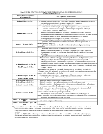 KALENDARZ CZYNNOŚCI ZWIĄZANYCH Z PRZEPROWADZENIEM REFERENDUM OGÓLNOKRAJOWEGO Data wykonania czynności Treść czynności referendalnej referendalnychł) 1 2 do dnia 23 lipca 2015 r. - utworzenie obwodów głosowania w szpitalach, zakładach pomocy społecznej, zakładach karnych i aresztach śledczych, w domach studenckich i zespołach domów studenckich oraz ustalenie ich granic, siedzib i numerów zawiadomienie Państwowej Komisji Wyborczej przez podmioty uprawnione 0 zamiarze uczestniczenia w kampanii referendalnej w programach radiowych 1 telewizyjnych nadawców publicznych; podanie do wiadomości publicznej informacji o numerach i granicach obwodów do dnia 28 lipca 2015 r. głosowania oraz siedzibach obwodowych komisji do spraw referendum, w tym o lokalach obwodowych komisji do spraw referendum dostosowanych do potrzeb osób niepełnosprawnych uprawnionych do udziału w referendum, a także o możliwości głosowania korespondencyjnego i przez pełnomocnika zgłaszanie przez armatorów wniosków o utworzenie obwodów głosowania na polskich statkach morskich; do dnia 7 sierpnia 2015 r. zgłaszanie kandydatów do obwodowych komisji wyborczych przez podmioty uprawnione powołanie obwodowych komisji do spraw referendum; podanie do wiadomości publicznej informacji o numerach i granicach obwodów do dnia 16 sierpnia 2015 r. głosowania utworzonych za granicą oraz siedzibach obwodowych komisji do spraw referendum; sporządzenie spisów osób uprawnionych do udziału w referendum - składanie przez żołnierzy pełniących zasadniczą lub okresową służbę wojskową oraz pełniących służbę w charakterze kandydatów na żołnierzy zawodowych lub odbywających ćwiczenia i przeszkolenie wojskowe, a także ratowników odbywających zasadniczą służbę w obronie cywilnej poza miejscem stałego zamieszkania, policjantów z od dnia 16 sierpnia 2015 r. do jednostek skoszarowanych, funkcjonariuszy BOR, Straży Granicznej, Państwowej Straży dnia 23 sierpnia 2015 r. Pożarnej i Służby Więziennej pełniących służbę w systemie skoszarowanym, wniosków o dopisanie do wybranego przez nich spisu osób uprawnionych do udziału w referendum, sporządzonego dla miejscowości, w której odbywają służbę od dnia 21 sierpnia 2015 r. do - nieodpłatne rozpowszechnianie w programach publicznych nadawców radiowych i telewizyjnych audycji referendalnych podmiotów uprawnionych dnia 4 września 2015 r. - zgłaszanie zamiaru głosowania korespondencyjnego do dnia 22 sierpnia 2015 r. - składanie wniosków o sporządzenie aktu pełnomocnictwa do głosowania do dnia 28 sierpnia 2015 r. - składanie wniosków o dopisanie do spisu osób uprawnionych do udziału w referendum w do dnia 1 września 2015 r. wybranym przez siebie obwodzie głosowania składanie przez osoby uprawnione do udziału w referendum przebywające na statkach morskich wniosków o wpisanie do spisu osób uprawnionych do udziału w referendum utworzonych na tych statkach; do dnia 3 września 2015 r. składanie przez osoby uprawnione do udziału w referendum przebywające za granicą zgłoszeń w sprawie wpisania do spisu osób uprawnionych do udziału w referendum w obwodach głosowania utworzonych za granicą w dniu 4 września 2015 r. o godzinie - zakończenie kampanii referendalnej 2400 w dniu 6 września 2015 r. godz. 600- głosowanie 2200 ł) Zgodnie z art. 9 § 2 ustawy z dnia 5 stycznia 2011 r. - Kodeks wyborczy (Dz. U. Nr 21, poz. 112, z późn. zm.), w związku z art. 92 ust. 1 ustawy z dnia 14 marca 2003 r. o referendum ogólnokrajowym, jeżeli koniec terminu wykonania czynności określonej w Kodeksie wyborczym przypada na sobotę albo na dzień ustawowo wolny od pracy, termin upływa pierwszego roboczego dnia po tym dniu. Zgodnie z art. 9 § 3 Kodeksu wyborczego, w związku z art. 92 ust. 1 ustawy z dnia 14 marca 2003 r. o referendum ogólnokrajowym, jeżeli Kodeks wyborczy nie stanowi inaczej, czynności wyborcze są dokonywane w godzinach urzędowania sądów, organów wyborczych, urzędów gmin oraz konsulatów.