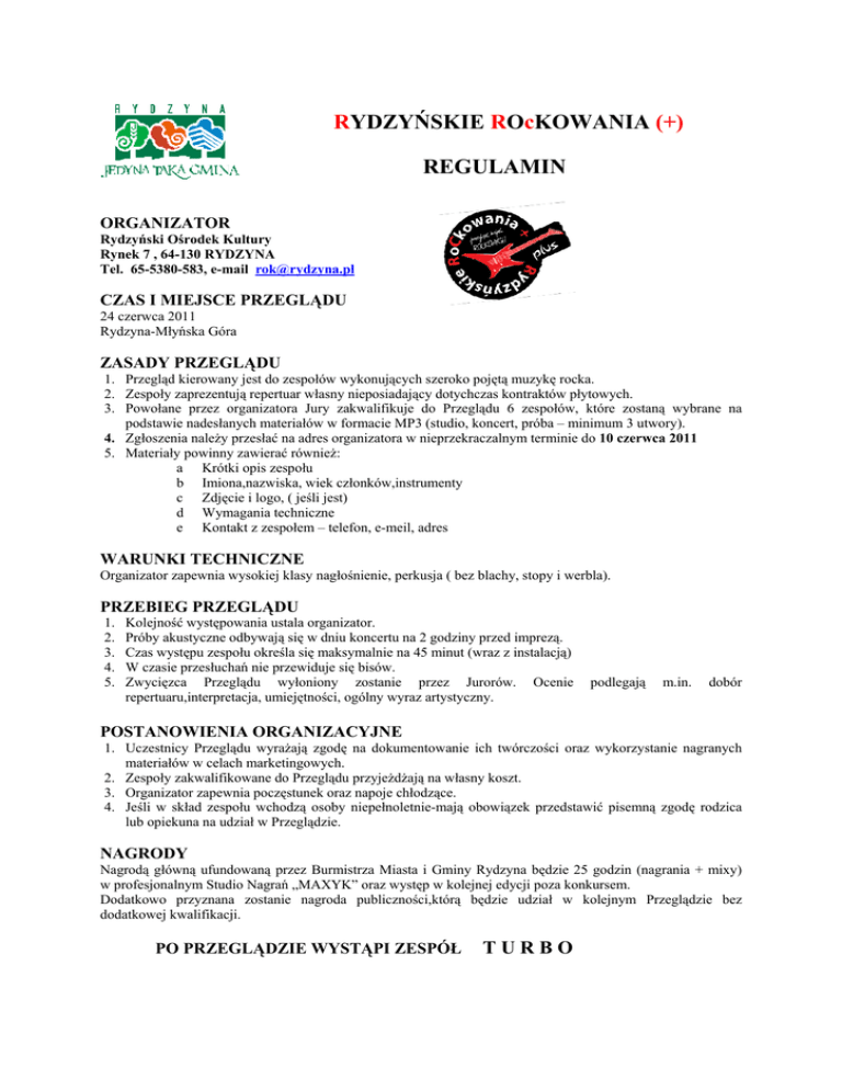 RYDZYŃSKIE ROcKOWANIA (+) REGULAMIN ORGANIZATOR Rydzyński Ośrodek Kultury Rynek 7 , 64-130 RYDZYNA Tel. 65-5380-583, e-mail [email protected] CZAS I MIEJSCE PRZEGLĄDU 24 czerwca 2011 Rydzyna-Młyńska Góra ZASADY PRZEGLĄDU 1. Przegląd kierowany jest do zespołów wykonujących szeroko pojętą muzykę rocka. 2. Zespoły zaprezentują repertuar własny nieposiadający dotychczas kontraktów płytowych. 3. Powołane przez organizatora Jury zakwalifikuje do Przeglądu 6 zespołów, które zostaną wybrane na podstawie nadesłanych materiałów w formacie MP3 (studio, koncert, próba – minimum 3 utwory). 4. Zgłoszenia naleŜy przesłać na adres organizatora w nieprzekraczalnym terminie do 10 czerwca 2011 5. Materiały powinny zawierać równieŜ: a Krótki opis zespołu b Imiona,nazwiska, wiek członków,instrumenty c Zdjęcie i logo, ( jeśli jest) d Wymagania techniczne e Kontakt z zespołem – telefon, e-meil, adres WARUNKI TECHNICZNE Organizator zapewnia wysokiej klasy nagłośnienie, perkusja ( bez blachy, stopy i werbla). PRZEBIEG PRZEGLĄDU 1. 2. 3. 4. 5. Kolejność występowania ustala organizator. Próby akustyczne odbywają się w dniu koncertu na 2 godziny przed imprezą. Czas występu zespołu określa się maksymalnie na 45 minut (wraz z instalacją) W czasie przesłuchań nie przewiduje się bisów. Zwycięzca Przeglądu wyłoniony zostanie przez Jurorów. Ocenie repertuaru,interpretacja, umiejętności, ogólny wyraz artystyczny. podlegają m.in. dobór POSTANOWIENIA ORGANIZACYJNE 1. Uczestnicy Przeglądu wyraŜają zgodę na dokumentowanie ich twórczości oraz wykorzystanie nagranych materiałów w celach marketingowych. 2. Zespoły zakwalifikowane do Przeglądu przyjeŜdŜają na własny koszt. 3. Organizator zapewnia poczęstunek oraz napoje chłodzące. 4. Jeśli w skład zespołu wchodzą osoby niepełnoletnie-mają obowiązek przedstawić pisemną zgodę rodzica lub opiekuna na udział w Przeglądzie. NAGRODY Nagrodą główną ufundowaną przez Burmistrza Miasta i Gminy Rydzyna będzie 25 godzin (nagrania + mixy) w profesjonalnym Studio Nagrań „MAXYK” oraz występ w kolejnej edycji poza konkursem. Dodatkowo przyznana zostanie nagroda publiczności,którą będzie udział w kolejnym Przeglądzie bez dodatkowej kwalifikacji. PO PRZEGLĄDZIE WYSTĄPI ZESPÓŁ TURBO