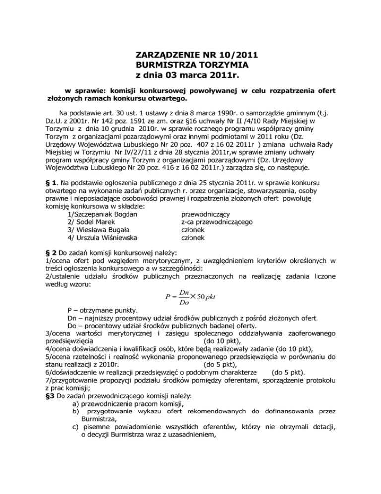 ZARZĄDZENIE NR 10/2011 BURMISTRZA TORZYMIA z dnia 03 marca 2011r. w sprawie: komisji konkursowej powoływanej w celu rozpatrzenia ofert złożonych ramach konkursu otwartego. Na podstawie art. 30 ust. 1 ustawy z dnia 8 marca 1990r. o samorządzie gminnym (t.j. Dz.U. z 2001r. Nr 142 poz. 1591 ze zm. oraz §16 uchwały Nr II /4/10 Rady Miejskiej w Torzymiu z dnia 10 grudnia 2010r. w sprawie rocznego programu współpracy gminy Torzym z organizacjami pozarządowymi oraz innymi podmiotami w 2011 roku (Dz. Urzędowy Województwa Lubuskiego Nr 20 poz. 407 z 16 02 2011r ) zmiana uchwała Rady Miejskiej w Torzymiu Nr IV/27/11 z dnia 28 stycznia 2011r,w sprawie zmiany uchwały program współpracy gminy Torzym z organizacjami pozarządowymi (Dz. Urzędowy Województwa Lubuskiego Nr 20 poz. 416 z 16 02 2011r.) zarządza się, co następuje. § 1. Na podstawie ogłoszenia publicznego z dnia 25 stycznia 2011r. w sprawie konkursu otwartego na wykonanie zadań publicznych r. przez organizacje, stowarzyszenia, osoby prawne i nieposiadające osobowości prawnej i rozpatrzenia złożonych ofert powołuję komisję konkursowa w składzie: 1/Szczepaniak Bogdan przewodniczący 2/ Sodel Marek z-ca przewodniczącego 3/ Wiesława Bugała członek 4/ Urszula Wiśniewska członek § 2 Do zadań komisji konkursowej należy: 1/ocena ofert pod względem merytorycznym, z uwzględnieniem kryteriów określonych w treści ogłoszenia konkursowego a w szczególności: 2/ustalenie udziału środków publicznych przeznaczonych na realizację zadania liczone według wzoru: P Dn 50 pkt Do P – otrzymane punkty. Dn – najniższy procentowy udział środków publicznych z pośród złożonych ofert. Do – procentowy udział środków publicznych badanej oferty. 3/ocena wartości merytorycznej i zasięgu społecznego oddziaływania zaoferowanego przedsięwzięcia (do 10 pkt), 4/ocena doświadczenia i kwalifikacji osób, które będą realizowały zadanie (do 10 pkt), 5/ocena rzetelności i realność wykonania proponowanego przedsięwzięcia w porównaniu do stanu realizacji z 2010r. (do 5 pkt), 6/doświadczenie w realizacji przedsięwzięć o podobnym charakterze (do 5 pkt). 7/przygotowanie propozycji podziału środków pomiędzy oferentami, sporządzenie protokołu z prac komisji; §3 Do zadań przewodniczącego komisji należy: a) przewodniczenie pracom komisji, b) przygotowanie wykazu ofert rekomendowanych do dofinansowania przez Burmistrza, c) pisemne powiadomienie wszystkich oferentów, którzy nie otrzymali dotacji, o decyzji Burmistrza wraz z uzasadnieniem, d) sporządzenia protokołu z posiedzenia komisji, zarządzenia z rozstrzygnięcia konkursu oraz informacji do oferentów; §4 Kandydaci, o których mowa w § 1 ust. 3 zgłoszeni do udziału w pracach komisji konkursowej muszą spełniać łącznie następujące kryteria: 1) są obywatelami RP i korzystają z pełni praw publicznych; 2) nie reprezentują organizacji pozarządowych lub podmiotów wymienionych w art. 3 ust. 3 ustawy, biorących udział w konkursie; 3) nie podlegają wyłączeniu określonemu w art. 24 ustawy z dnia 14 czerwca 1960 r. – Kodeks postępowania administracyjnego (tekst jednolity: Dz. U. z 2000 r. Nr 98, poz.1071 ze. zm.); 4) mają doświadczenie w przedmiocie określonego zadania publicznego oraz w zakresie działalności organizacji pozarządowych lub podmiotów wymienionych w art. 3 ust. 3 ustawy; 5) wyrażają zgodę na przetwarzanie swoich danych osobowych zgodnie z ustawą z dnia 29 sierpnia 1997 r. o ochronie danych osobowych (tekst jednolity: Dz. U. z 2002r. Nr 101, poz. 926 z późn. zm.); §5Przedmiotem oceny będą zgłoszone oferty w zakresie: 1. Upowszechniania kultury fizycznej i sportu obejmuje w szczególności: - organizację imprez sportowych, - całoroczną organizację szkolenia i współzawodnictwa sportowego upowszechniania kultury fizycznej, sportu, rozwijanie i wspieranie szkolenia sportowego na terenie gminy Torzym - udział w zawodach międzynarodowych, krajowych, okręgowych, lokalnych. 2.Działalności na rzecz osób niepełnosprawnych obejmujące w szczególności: -integrację środowisk ludzi niepełnosprawnych, -wspieranie aktywności środowisk osób niepełnosprawnych w tym wypoczynku, 3.Nauki, edukacji, oświaty i wychowania obejmujące w szczególności: - wyrównywanie szans edukacyjnych wśród uczniów szkół podstawowych i gimnazjalnych, dla których organem prowadzącym jest gmina Torzym, -stwarzanie warunków dla rozwoju talentów dzieci i młodzieży, § 6· Czas pracy komisji dla oceny formalnej i przedstawienia wniosków ustalam do dzień 10 kwietnia 2011r. § 7. Zarządzenie wchodzi w życie z dniem podpisania. Burmistrz Ryszard Stanulewicz 2