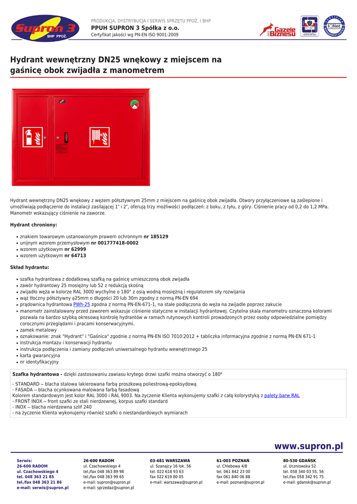PRODUKCJA, DYSTRYBUCJA I SERWIS SPRZĘTU PPOŻ. I BHP PPUH SUPRON 3 Spółka z o.o. Certyfikat jakości wg PN-EN ISO 9001:2009 Hydrant wewnętrzny DN25 wnękowy z miejscem na gaśnicę obok zwijadła z manometrem Hydrant wewnętrzny DN25 wnękowy z wężem półsztywnym 25mm z miejscem na gaśnicę obok zwijadła. Otwory przyłączeniowe są zaślepione i umożliwiają podłączenie do instalacji zasilającej 1” i 2”, oferują trzy możliwości podłączeń: z boku, z tyłu, z góry. Ciśnienie pracy od 0,2 do 1,2 MPa. Manometr wskazujący ciśnienie na zaworze. Hydrant chroniony: ● ● ● ● znakiem towarowym ustanowionym prawem ochronnym nr 185129 unijnym wzorem przemysłowym nr 001777418-0002 wzorem użytkowym nr 62999 wzorem użytkowym nr 64713 Skład hydrantu: ● ● ● ● ● ● ● ● ● ● ● ● szafka hydrantowa z dodatkową szafką na gaśnicę umieszczoną obok zwijadła zawór hydrantowy 25 mosiężny lub 52 z redukcją skośną zwijadło węża w kolorze RAL 3000 wychylne o 180° z osią wodną mosiężną i regulatorem siły rozwijania wąż tłoczny półsztywny φ25mm o długości 20 lub 30m zgodny z normą PN-EN 694 prądownica hydrantowa PWh-25 zgodna z normą PN-EN-671-1, na stałe podłączona do węża na zwijadle poprzez zakucie manometr zainstalowany przed zaworem wskazuje ciśnienie statyczne w instalacji hydrantowej. Czytelna skala manometru oznaczona kolorami pozwala na bardzo szybką okresową kontrolę hydrantów w ramach rutynowych kontroli prowadzonych przez osoby odpowiedzialne pomiędzy corocznymi przeglądami i pracami konserwacyjnymi. zamek metalowy oznakowanie: znak "Hydrant" i "Gaśnica" zgodnie z normą PN-EN ISO 7010:2012 + tabliczka informacyjna zgodnie z normą PN-EN 671-1 instrukcja montażu i konserwacji hydrantu instrukcja podłączenia i zamiany podłączeń uniwersalnego hydrantu wewnętrznego 25 karta gwarancyjna nr identyfikacyjny Szafka hydrantowa - dzięki zastosowaniu zawiasu krytego drzwi szafki można otworzyć o 180º - STANDARD – blacha stalowa lakierowana farbą proszkową poliestrową-epoksydową - FASADA – blacha ocynkowana malowana farbą fasadową Kolorem standardowym jest kolor RAL 3000 i RAL 9003. Na życzenie Klienta wykonujemy szafki z całą kolorystyką z palety barw RAL - FRONT INOX – front szafki ze stali nierdzewnej, korpus szafki standard - INOX – blacha nierdzewna szlif 240 - na życzenie Klienta wykonujemy również szafki o niestandardowych wymiarach www.supron.pl Serwis: 26-600 RADOM ul. Czachowskiego 4 tel. 048 363 21 85 tel./fax 048 363 21 86 e-mail: [email protected] 26-600 RADOM ul. Czachowskiego 4 tel./fax 048 363 89 98 tel./fax 048 363 99 65 e-mail: [email protected] e-mail: [email protected] 03-481 WARSZAWA ul. Szanajcy 16 lok. 56 tel. 022 618 93 63 fax 022 619 80 05 e-mail: [email protected] 61-003 POZNAŃ ul. Chlebowa 4/8 tel. 061 842 23 00 fax 061 840 06 88 e-mail: [email protected] 80-530 GDAŃSK ul. Uczniowska 52 tel. 058 340 03 55, 56 tel./fax 058 342 91 75 e-mail: [email protected] PRODUKCJA, DYSTRYBUCJA I SERWIS SPRZĘTU PPOŻ. I BHP PPUH SUPRON 3 Spółka z o.o. Certyfikat jakości wg PN-EN ISO 9001:2009 Drzwi szafki hydrantowej - pełne z blachy stalowej - pełne z okienkiem z plexi - pełne z blachy stalowej z miejscem na ROP - pełne ze szkła bezpiecznego Przy drzwiach z szyb zastosowano zamek PATENT i innowacyjne rozwiązanie dla mocowania kluczyka. Dzięki temu nie ma konieczności stosowania dodatkowej skrzynki na kluczyk obok hydrantu. Zawór hydrantowy i prądownica - mosiężny zawór hydrantowy 25 oraz zakucie prądownicy tuleją aluminiową - mosiężny zawór hydrantowy 25 oraz zakucie prądownicy tuleją mosiężną - aluminiowy zawór hydrantowy 52 z redukcją skośną, zakucie prądownicy tuleją aluminiową - mosiężny zawór hydrantowy 52 z nasadą aluminiową i redukcją skośną, zakucie prądownicy tuleją aluminiową Zakuwanie prądownicy hydrantowej z wężem oraz osi wodnej z wężem i całego układu hydraulicznego hydrantu (zgodnie ze wzorem użytkowym nr 62999) gwarantuje szczelność połączenia niezależnie od upływu czasu - znacząco skraca się czas corocznych przeglądów hydrantów. Opcje połączenia węża łączącego zawór hydrantowy z osią wodną: - standard - połączenie gwintowane - na życzenie Klienta połączenie za pomocą nasady i łącznika - połączenie to w zasadniczy sposób skraca czas przeglądu hydrantu Rodzaj zamka - PATENT - zamek patentowy, kluczyk umieszczony jest za szybką bezpieczną - EURO - zamek przystosowany do założenia plomby - ZESPÓŁ ZAMKA - rozwiązanie chronione prawem ochronnym UPRP nr 64713 Galeria możliwości wykonań hydrantów Parametry techniczne: Symbol produktu PN-EN 671-1[W-25/30G] PN-EN 671-1[W-25/20G] Długość węża Wymiary hydrantu [wys.x szer.xgł.] Wymiary wnęki [wys.xszer.xgł.] 30m 20m 650x950x250mm 670x970x260mm www.supron.pl Serwis: 26-600 RADOM ul. Czachowskiego 4 tel. 048 363 21 85 tel./fax 048 363 21 86 e-mail: [email protected] 26-600 RADOM ul. Czachowskiego 4 tel./fax 048 363 89 98 tel./fax 048 363 99 65 e-mail: [email protected] e-mail: [email protected] 03-481 WARSZAWA ul. Szanajcy 16 lok. 56 tel. 022 618 93 63 fax 022 619 80 05 e-mail: [email protected] 61-003 POZNAŃ ul. Chlebowa 4/8 tel. 061 842 23 00 fax 061 840 06 88 e-mail: [email protected] 80-530 GDAŃSK ul. Uczniowska 52 tel. 058 340 03 55, 56 tel./fax 058 342 91 75 e-mail: [email protected]