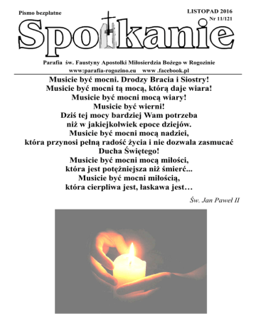 Pismo bezpłatne LISTOPAD 2016 Nr 11/121 Parafia św. Faustyny Apostołki Miłosierdzia Bożego w Rogozinie www:parafia-rogozino.eu www .facebook.pl Musicie być mocni. Drodzy Bracia i Siostry! Musicie być mocni tą mocą, którą daje wiara! Musicie być mocni mocą wiary! Musicie być wierni! Dziś tej mocy bardziej Wam potrzeba niż w jakiejkolwiek epoce dziejów. Musicie być mocni mocą nadziei, która przynosi pełną radość życia i nie dozwala zasmucać Ducha Świętego! Musicie być mocni mocą miłości, która jest potężniejsza niż śmierć... Musicie być mocni miłością, która cierpliwa jest, łaskawa jest… Św. Jan Paweł II Nr 11/121 Spacerkiem po okolicy parafii ... Za nami kolejny etap działań Funduszu Sołeckiego. Do końca września b.r. mieszkańcy gminy na zebraniach wiejskich musieli określić, na jakie cele zostaną przeznaczone środki finansowe w ich miejscowościach w 2017 roku. Przez lata sołectwa funkcjonowały, otrzymując środki z budżetu gminy na swoje działania, ale w wielu miejscach ciężar i koszty organizacji życia w sołectwie opierały się na samych mieszkańcach, a ich potrzeby często pozostawały niezauważone. Każde sołectwo jest inne, jednak sam fakt, że potrzeby sołectw są lepiej słyszalne, a mieszkańcy pewniejsi siebie i bardziej świadomi swoich praw, jest dużym sukcesem. Fundusz sołecki to nasze pieniądze. Decyzja o tym, na co wydać pieniądze z funduszu , należy tylko do mieszkańców. Ich zdanie jest wiążące i nikt ich w podjęciu decyzji na zebraniu wiejskim zastąpić nie może. Fundusz sołecki to jedyne rozwiązanie w Polsce, w ramach którego o części budżetu gminy decydują bezpośrednio mieszkańcy, a ich wola zobowiązuje wójta do wpisania efektów owych decyzji do projektu budżetu. W przypadku funduszu sołeckiego, jak i wszystkich innych publicznych budżetowych wydatków, każdy posiada konstytucyjne prawo do sprawdzenia, jak urząd realizuje i wydatkuje fundusz. Każdy może zapytać o faktury, zamówienia usług, umowy podpisywane na wykonanie przedsięwzięć. Również każdy z nas może dowiedzieć się, jak i przez kogo podejmowane były decyzje o przeznaczeniu funduszu sołeckiego. Fundusz sołecki wiąże się z ożywionymi dyskusjami, nawet ze sporami! Ale to właśnie dzięki takim rozmowom powstają pomysły rozwiązania problemów w sołectwie. Wreszcie jest się o co pospierać, i to nie tylko o to, na co wydać pieniądze, ale też o to, co jest w sołectwie ważne, jak chcemy rozwijać nasze sołectwo, kto odpowiada za drogi, chodniki, lampy, tereny zielone, kto musi utrzymać świetlicę itd. Nie ma nic ważniejszego, jak poszukiwanie odpowiedzi na pytania rodzące się w związku z funkcjonowaniem w przestrzeni publicznej. Z pewnością fundusz sołecki nie rozwiąże wszystkich problemów sołectwa, ale jest szansą dla każdego z sołectw, dobrym punktem wyjścia do wspólnej dyskusji i organizowania się wokół ważnych dla nas spraw. Fundusz sołecki to pieniądze, które mają służyć poprawie warunków życia mieszkańców gminy. Jest wyodrębniany w budżecie gminy i przez cały czas pozostaje jego częścią. Za wykonanie funduszu sołeckiego, podobnie jak całego budżetu gminy, odpowiada wójt. Kwota, jaką dysponuje sołectwo, jest bezpośrednio uzależniona od liczby jego mieszkańców, a pula środków funduszu sołeckiego w naszej gminie w roku 2017 wyniesie 380 tysięcy złotych. Prawidłowo wykonany przez gminę fundusz sołecki podlega zwrotowi przez budżet państwa w formie dotacji celowej nawet w 40 procentach wydatków wykonanych w ramach tego funduszu. cd str 3 Przygotował Krzysztof Czerwiński 2 Spacerkiem po okolicy parafii ... Nr 11/121 Mieszkańcy Rogozina, którzy, jak się okazuje, z racji ilości mieszkańców dysponują największą w gminie kwotą 28 500 zł z puli funduszu, przedstawili propozycje do realizacji w 2017 r : m.in. modernizacja kilku ulic , budowa chodników, ogrodzenie placu zabaw. Wiadomo, że potrzeb jest wiele lecz ograniczone do w/w kwoty środki funduszu nie pozwalają na wykonanie w jego ramach większej inwestycji . Na przykład położenie solidnego asfaltu na 300 metrowym odcinku ulicy Słonecznej to kwota ok. 300 000 zł. Takie przedsięwzięcia, rzec można strategiczne, rozwijające infrastrukturę techniczną w tej podpłockiej części gminy wymagają zrozumienia potrzeb, dobrej woli i odpowiedzialnych decyzji większości rady gminy. Braki w infrastrukturze drogowej w samym tylko Rogozinie są znaczne. Na ponad 20 uliczek jedyny fragment nawierzchni asfaltowej na drogach gminnych znajduję się tylko na odcinku ul . Słonecznej. Wspomnieć tu należy, że środki na wykonanie asfaltu na tej ulicy były zabezpieczone w latach ubiegłych w budżecie gminnym , jednak ostatecznie radni przeznaczyli je na inne cele. Porównując, to np. w Radzanowie jest tylko kilka uliczek, które nie mają asfaltu lub kostki brukowej.. Wracając do rozdysponowania środków funduszu, to zdecydowane poparcie zdobyła propozycja zgłoszona przez p. S. Trojanowskiego i Radę Sołecką dotycząca zagospodarowania działek gminnych o nr 120/2 ; 345/6 znajdujących się w centrum wsi; jednej obok przystanku pomiędzy budynkiem dawnej gminy a apteką oraz drugiej przy Domu Ludowym, na której znajduje się plac zabaw. Celem tej propozycji jest stworzenie szczegółowego planu zagospodarowania tego terenu, a następnie urządzenie zieleni, chodników tak, by mieszkańcy mogli bezpiecznie w przyjaznym otoczeniu spędzić czas wolny. Dotychczasowa „siłownia pod chmurką” wzbogaci się przyszłym roku o urządzenia do ćwiczeń aerobowych dla starszych, na placu zabaw przybędą nowe zabawki dla dzieci, pojawią się chodniki , które zostaną tak wykonane, by można było na nich wygodnie spacerować z wózkami dziecięcymi i jeździć na rolkach. Także w innych miejscowościach odbyły się zebrania i tak ; w Stróżewku kwotę 17 