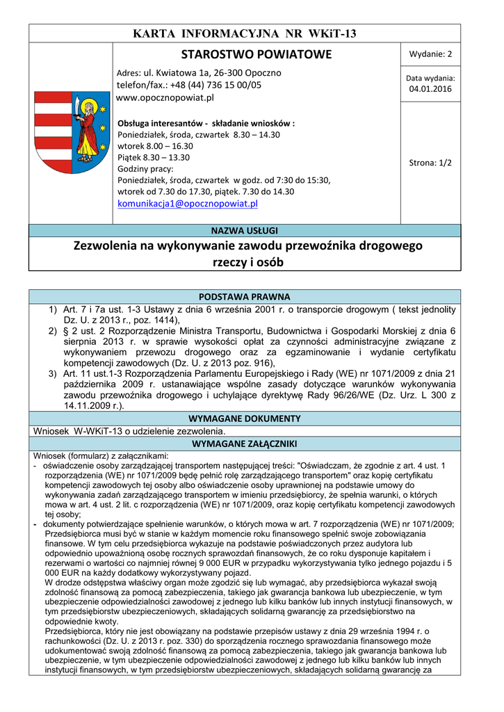 KARTA INFORMACYJNA NR WKiT-13 STAROSTWO POWIATOWE Adres: ul. Kwiatowa 1a, 26-300 Opoczno telefon/fax.: +48 (44) 736 15 00/05 www.opocznopowiat.pl Obsługa interesantów - składanie wniosków : Poniedziałek, środa, czwartek 8.30 – 14.30 wtorek 8.00 – 16.30 Piątek 8.30 – 13.30 Godziny pracy: Poniedziałek, środa, czwartek w godz. od 7:30 do 15:30, wtorek od 7.30 do 17.30, piątek. 7.30 do 14.30 Wydanie: 2 Data wydania: 04.01.2016 Strona: 1/2 [email protected] NAZWA USŁUGI Zezwolenia na wykonywanie zawodu przewoźnika drogowego rzeczy i osób PODSTAWA PRAWNA 1) Art. 7 i 7a ust. 1-3 Ustawy z dnia 6 września 2001 r. o transporcie drogowym ( tekst jednolity Dz. U. z 2013 r., poz. 1414), 2) § 2 ust. 2 Rozporządzenie Ministra Transportu, Budownictwa i Gospodarki Morskiej z dnia 6 sierpnia 2013 r. w sprawie wysokości opłat za czynności administracyjne związane z wykonywaniem przewozu drogowego oraz za egzaminowanie i wydanie certyfikatu kompetencji zawodowych (Dz. U. z 2013 poz. 916), 3) Art. 11 ust.1-3 Rozporządzenia Parlamentu Europejskiego i Rady (WE) nr 1071/2009 z dnia 21 października 2009 r. ustanawiające wspólne zasady dotyczące warunków wykonywania zawodu przewoźnika drogowego i uchylające dyrektywę Rady 96/26/WE (Dz. Urz. L 300 z 14.11.2009 r.). WYMAGANE DOKUMENTY Wniosek W-WKiT-13 o udzielenie zezwolenia. WYMAGANE ZAŁĄCZNIKI Wniosek (formularz) z załącznikami: - oświadczenie osoby zarządzającej transportem następującej treści: "Oświadczam, że zgodnie z art. 4 ust. 1 rozporządzenia (WE) nr 1071/2009 będę pełnić rolę zarządzającego transportem" oraz kopię certyfikatu kompetencji zawodowych tej osoby albo oświadczenie osoby uprawnionej na podstawie umowy do wykonywania zadań zarządzającego transportem w imieniu przedsiębiorcy, że spełnia warunki, o których mowa w art. 4 ust. 2 lit. c rozporządzenia (WE) nr 1071/2009, oraz kopię certyfikatu kompetencji zawodowych tej osoby; - dokumenty potwierdzające spełnienie warunków, o których mowa w art. 7 rozporządzenia (WE) nr 1071/2009; Przedsiębiorca musi być w stanie w każdym momencie roku finansowego spełnić swoje zobowiązania finansowe. W tym celu przedsiębiorca wykazuje na podstawie poświadczonych przez audytora lub odpowiednio upoważnioną osobę rocznych sprawozdań finansowych, że co roku dysponuje kapitałem i rezerwami o wartości co najmniej równej 9 000 EUR w przypadku wykorzystywania tylko jednego pojazdu i 5 000 EUR na każdy dodatkowy wykorzystywany pojazd. W drodze odstępstwa właściwy organ może zgodzić się lub wymagać, aby przedsiębiorca wykazał swoją zdolność finansową za pomocą zabezpieczenia, takiego jak gwarancja bankowa lub ubezpieczenie, w tym ubezpieczenie odpowiedzialności zawodowej z jednego lub kilku banków lub innych instytucji finansowych, w tym przedsiębiorstw ubezpieczeniowych, składających solidarną gwarancję za przedsiębiorstwo na odpowiednie kwoty. Przedsiębiorca, który nie jest obowiązany na podstawie przepisów ustawy z dnia 29 września 1994 r. o rachunkowości (Dz. U. z 2013 r. poz. 330) do sporządzenia rocznego sprawozdania finansowego może udokumentować swoją zdolność finansową za pomocą zabezpieczenia, takiego jak gwarancja bankowa lub ubezpieczenie, w tym ubezpieczenie odpowiedzialności zawodowej z jednego lub kilku banków lub innych instytucji finansowych, w tym przedsiębiorstw ubezpieczeniowych, składających solidarną gwarancję za przedsiębiorstwo na odpowiednie kwoty. Audytorem upoważnionym do poświadczenia rocznych sprawozdań finansowych jest biegły rewident w rozumieniu przepisów ustawy z dnia 29 września 1994 r. o rachunkowości. Odpowiednio upoważnioną osobą do poświadczenia rocznych sprawozdań finansowych jest członek zarządu spółki prawa handlowego lub innej osoby prawnej, wspólnik spółki jawnej, komplementariusz spółki komandytowej lub komandytowo-akcyjnej, lub przedsiębiorca będący osobą fizyczną. - oświadczenie przedsiębiorcy, że dysponuje bazą eksploatacyjną wraz ze wskazaniem adresu bazy, jeżeli adres ten jest inny niż adres siedziby, - oświadczenie o zamiarze zatrudnienia kierowców wobec których nie orzeczono zakazu wykonywania zawodu kierowcy lub oświadczenie o zamiarze współpracy z osobami niezatrudnionymi przez przedsiębiorcę, lecz wykonującymi osobiście przewóz na jego rzecz, spełniającymi w/w wymogi - dowód uiszczenia opłaty za wydanie zezwolenia na wykonywanie zawodu przewoźnika drogowego i wypisów z tego zezwolenia, - informację z Krajowego Rejestru Karnego dotyczącą osoby: a) będącej członkiem organu zarządzającego osoby prawnej, osoby zarządzającej spółką jawną lub komandytową, b) prowadzącej działalność gospodarczą - w przypadku innego przedsiębiorcy, c) zarządzającej transportem lub uprawnionej na podstawie umowy do wykonywania zadań zarządzającego transportem w imieniu przedsiębiorcy - albo oświadczenie tych osób o niekaralności za przestępstwa umyślne w dziedzinach określonych w art. 6 rozporządzenia (WE) nr 1071/2009. Po uzyskaniu zezwolenia na wykonywanie zawodu przewoźnika drogowego przedsiębiorca przedkłada do organu, o którym mowa w art. 7 ust. 2, wykaz pojazdów zawierający następujące informacje: markę, typ, rodzaj/przeznaczenie, numer rejestracyjny, numer VIN, wskazanie rodzaju tytułu prawnego do dysponowania pojazdem. FORMULARZE DO POBRANIA Druk Wniosku W-WKiT-13 w wersji papierowej dostępny w Wydziale Komunikacji i Transportu lub do pobrania na stronie internetowej Starostwa: www.opocznopowiat.pl w zakładce: Poradnik Interesanta OPŁATY Za udzielenie zezwolenia na wykonywanie zawodu przewoźnika drogowego w zakresie przewozu osób lub rzeczy pobiera się opłatę w wysokości 1000 zł. MIEJSCE ZŁOŻENIA WNIOSKU Starostwo Powiatowe, ul. Kwiatowa 1a, 26-300 Opoczno, parter, Wydział komunikacji i Transportu, sala operacyjna. MIEJSCE ZAŁATWIENIA SPRAWY Wydział Komu