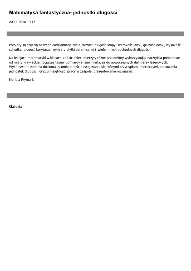 Matematyka fantastyczna- jednostki długosci 20.11.2016 19:17 Pomiary są częścią naszego codziennego życia. Wzrost, długość stopy, szerokość ławki, grubość deski, wysokość schodka, długość korytarza, wymiary płytki ceramicznej i wiele innych pochodnych długości. Na lekcjach matematyki w klasach 4a i 4c dzieci mierzyły różne przedmioty wykorzystując narzędzia pomiarowe od miary krawieckiej, poprzez taśmy pomiarowe, suwmiarki, aż do nowoczesnych dalmierzy laserowych. Wykonywane zadania doskonaliły umiejętność posługiwania się różnymi przyrządami mierniczymi, stosowania jednostek długości, oraz umiejętność pracy w zespole, prezentowania rozwiązań. Mariola Frymark Galeria