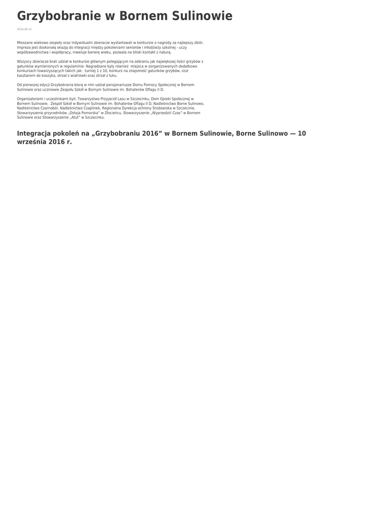Grzybobranie w Bornem Sulinowie 2016-09-12 Mieszane wiekowo zespoły oraz indywidualni zbieracze wystartowali w konkursie o nagrody za najlepszy zbiór. Impreza jest doskonałą okazją do integracji między pokoleniami seniorów i młodzieży szkolnej - uczy współzawodnictwa i współpracy, niweluje barierę wieku, pozwala na bliski kontakt z naturą. Wszyscy zbieracze brali udział w konkursie głównym polegającym na zebraniu jak największej ilości grzybów z gatunków wymienionych w regulaminie. Nagradzane były również miejsca w zorganizowanych dodatkowo konkursach towarzyszących takich jak: turniej 1 z 10, konkurs na znajomość gatunków grzybów, rzut kasztanem do koszyka, strzał z wiatrówki oraz strzał z łuku. Od pierwszej edycji Grzybobrania biorą w nim udział pensjonariusze Domu Pomocy Społecznej w Bornem Sulinowie oraz uczniowie Zespołu Szkół w Bornym Sulinowie im. Bohaterów Oflagu II D. Organizatorami i uczestnikami byli: Towarzystwo Przyjaciół Lasu w Szczecinku, Dom Opieki Społecznej w Bornem Sulinowie, Zespół Szkół w Bornym Sulinowie im. Bohaterów Oflagu II D, Nadleśnictwo Borne Sulinowo, Nadleśnictwo Czarnobór, Nadleśnictwo Czaplinek, Regionalna Dyrekcja ochrony Środowiska w Szczecinie, Stowarzyszenie przyrodników „Ostoja Pomorska” w Złocieńcu, Stowarzyszenie „Wyprzedzić Czas” w Bornem Sulinowie oraz Stowarzyszenie „Atut” w Szczecinku. Integracja pokoleń na „Grzybobraniu 2016” w Bornem Sulinowie, Borne Sulinowo — 10 września 2016 r.