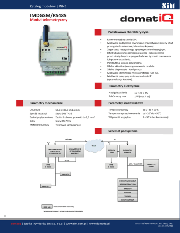 Katalog modułów | INNE IMDGSM/RS485 Moduł telemetryczny Podstawowa charakterystyka: • • • • • • • • • Łatwy montaż na szynie DIN. Możliwość podłączenia zewnętrznej magnetycznej anteny GSM przez gniazdo antenowe, lub anteny kątowej. Zegar czasu rzeczywistego z podtrzymaniem bateryjnym. 8 MB wbudowanej pamięci nieulotnej - zabezpieczenie przed utratą danych w przypadku braku łączności z serwerem lub przerw w zasilaniu. Port RS485 z izolacją galwaniczną. Zdalna aktualizacja oprogramowania modułu. Zdalna diagnostyka i konfiguracja. Możliwość identyfikacji miejsca instalacji (Cell-ID). Możliwość pracy przy zmiennym adresie IP (optymalizacja kosztów). Parametry elektryczne Napięcie zasilania Pobór mocy max 10 ÷ 32 V DC 1 W (max 4 W) Parametry mechaniczne Parametry środowiskowe Obudowa Sposób instalacji Zaciski przyłączeniowe Kolor Materiał obudowy Temperatura pracy od 0˚ do + 50˚C Temperatura przechowywania od - 20˚ do + 50˚C Wilgotność względna 5 ÷ 90 % bez kondensacji 53,6 x 106,5 x 61,5 mm Szyna DIN TH35 Zaciski śrubowe, przewód do 2,5 mm2 Szary RAL7035 Tworzywo samogasnące Schemat podłączenia 34 domatiq | Spółka Inżynierów SIM Sp. z o.o. | www.sim.com.pl | www.domatiq.pl IMDGSM/RS485 MODEL nr: 2950/2960 ver. 15.10.2016