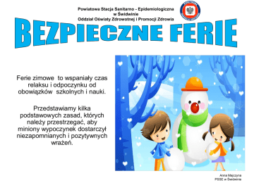 Powiatowa Stacja Sanitarno - Epidemiologiczna w Świdwinie Oddział Oświaty Zdrowotnej i Promocji Zdrowia Ferie zimowe to wspaniały czas relaksu i odpoczynku od obowiązków szkolnych i nauki. Przedstawiamy kilka podstawowych zasad, których należy przestrzegać, aby miniony wypoczynek dostarczył niezapomnianych i pozytywnych wrażeń. Anna Majczyna PSSE w Świdwinie Powiatowa Stacja Sanitarno - Epidemiologiczna w Świdwinie Oddział Oświaty Zdrowotnej i Promocji Zdrowia PAMIĘTAJMY O PODSTAWOWYCH ZASADACH BEZPIECZEŃSTWA PODCZAS WYPOCZYNKU ZIMOWEGO: •W wolnym czasie przebywajmy na świeżym powietrzu, dbajmy o aktywność fizyczną, •ubierajmy się odpowiednio do temperatury panującej na dworze, •rzucając się śnieżkami nie łączmy miękkiego śniegu z kawałkami lodu czy kamieni Powiatowa Stacja Sanitarno - Epidemiologiczna w Świdwinie Oddział Oświaty Zdrowotnej i Promocji Zdrowia PAMIĘTAJMY O PODSTAWOWYCH ZASADACH BEZPIECZEŃSTWA PODCZAS WYPOCZYNKU ZIMOWEGO: •nie celujmy w twarz drugiej osoby, •nie rzucajmy śnieżkami w nadjeżdżające samochody, •na łyżwach jeźdźmy tylko w wyznaczonych miejscach, •nie ślizgajmy się po lodzie na rzece lub stawie, Powiatowa Stacja Sanitarno - Epidemiologiczna w Świdwinie Oddział Oświaty Zdrowotnej i Promocji Zdrowia ZABEZPIECZ SIĘ PRZED GRYPĄ! GRYPA – jest chorobą zakaźną, zakażenie następuje poprzez bezpośredni kontakt z wirusem przenoszonym drogą kropelkową. PODCZAS KASZLU LUB KICHANIA ZAMIAST DŁONIĄ, ZASŁANIAJ USTA I NOS WEWNĘTRZNĄ CZĘŚCIĄ RAMIENIA! Powiatowa Stacja Sanitarno - Epidemiologiczna w Świdwinie Oddział Oświaty Zdrowotnej i Promocji Zdrowia PRZESTRZEGAJ ETYKIETY ODDECHOWEJ! Aby opanować wydostawanie się wydzieliny z dróg oddechowych, wszystkim osobom z objawami nieżytu górnych dróg oddechowych, bez względu na przypuszczalną przyczynę, należy zalecić: Powiatowa Stacja Sanitarno - Epidemiologiczna w Świdwinie Oddział Oświaty Zdrowotnej i Promocji Zdrowia ALKOHOL ŚRODKI PSYCHOAKTYWNE PAPIEROSY ZMIENIAJĄ TWOJĄ ŚWIADOMOŚĆ ! Powiatowa Stacja Sanitarno - Epidemiologiczna w Świdwinie Oddział Oświaty Zdrowotnej i Promocji Zdrowia POGOTOWIE RATUNKOWE 999 POLICJA 997 STRAŻ POŻARNA 998 PUNKTY TESTOWANIA W KIERUNKU HIV/AIDS Koszalin tel. (94) 345 05 11 Szczecin tel. (91) 486 00 25 801 199 990 - Ogólnopolski Telefon Zaufania – Narkotyki 801 140 068 – pomarańczowa linia (system pomocy rodzicom, których dzieci się upijają) 801 120 002 – niebieska linia (przemoc w rodzinie) Nad zapewnieniem bezpieczeństwa Twojego i Twojej rodziny czuwa wiele instytucji. Nie obawiaj się skontaktowania z nimi w każdym przypadku, gdy nie jesteś pewien swojego bezpieczeństwa