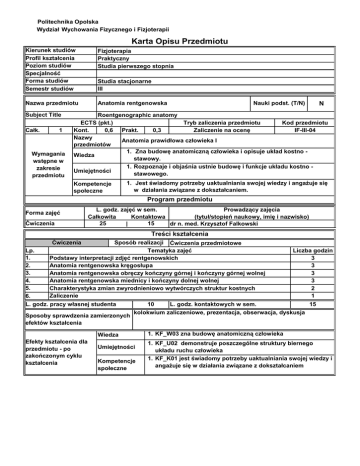 Politechnika Opolska Wydział Wychowania Fizycznego i Fizjoterapii Karta Opisu Przedmiotu Kierunek studiów Profil kształcenia Poziom studiów Specjalność Forma studiów Semestr studiów Fizjoterapia Praktyczny Studia pierwszego stopnia Nazwa przedmiotu Anatomia rentgenowska Subject Title Całk. 1 Wymagania wstępne w zakresie przedmiotu Studia stacjonarne III Nauki podst. (T/N) N Roentgenographic anatomy ECTS (pkt.) Tryb zaliczenia przedmiotu Kod przedmiotu Kont. 0,6 Prakt. 0,3 Zaliczenie na ocenę IF-III-04 Nazwy Anatomia prawidłowa człowieka I przedmiotów 1. Zna budowę anatomiczną człowieka i opisuje układ kostno Wiedza stawowy. … 1. Rozpoznaje i objaśnia ustnie budowę i funkcje układu kostno Umiejętności stawowego. Kompetencje społeczne 2. 1. Jest świadomy potrzeby uaktualniania swojej wiedzy i angażuje się w działania związane z dokształcaniem. Program przedmiotu Forma zajęć Ćwiczenia L. godz. zajęć w sem. Prowadzący zajęcia Całkowita Kontaktowa (tytuł/stopień naukowy, imię i nazwisko) 25 15 dr n. med. Krzysztof Falkowski | Treści kształcenia Ćwiczenia Lp. 1. 2. 3. 4. 5. 6. Sposób realizacji Ćwiczenia przedmiotowe Tematyka zajęć Podstawy interpretacji zdjęć rentgenowskich Anatomia rentgenowska kręgosłupa Anatomia rentgenowska obręczy kończyny górnej i kończyny górnej wolnej Anatomia rentgenowska miednicy i kończyny dolnej wolnej Charakterystyka zmian zwyrodnieniowo wytwórczych struktur kostnych Zaliczenie L. godz. pracy własnej studenta Sposoby sprawdzenia zamierzonych efektów kształcenia 10 L. godz. kontaktowych w sem. 15 kolokwium zaliczeniowe, prezentacja, obserwacja, dyskusja Wiedza Efekty kształcenia dla przedmiotu - po zakończonym cyklu kształcenia Liczba godzin 3 3 3 3 2 1 Umiejętności Kompetencje społeczne 1. KF_W03 zna budowę anatomiczną człowieka 1. KF_U02 demonstruje poszczególne struktury biernego układu ruchu człowieka 1. KF_K01 jest świadomy potrzeby uaktualniania swojej wiedzy i angażuje się w działania związane z dokształcaniem Metody dydaktyczne: Wykład: Wykład informacyjny. Prezentacje multimedialne Ćwiczenia: Ćwiczenia praktyczne. Dyskusja dydaktyczna. Konsultacje. Forma i warunki zaliczenia przedmiotu: Ćwiczenia: kolowium zaliczeniowe - pytania otwarte (50% poprawnych odpowiedzi) - 50% oceny końcowej ocena z odpowiedzi ustnej - 20% oceny końcowej obserwacja postawy i zachowań studenta 10% - oceny końcowej dyskusja - 10% oceny końcowej prezentacja (praca własna studenta) - 10% oceny końcowej Literatura podstawowa: [1] Gołębiewska B.: Radiologia dla fizjoterapeuty, Katowice 2012 [2] Wicke L.: Atlas Anatomii Radiologicznej, Wrocław 2009 [3] Daniel B.: Anatomia Radiologiczna, PZWL, Warszawa 2011 Literatura uzupełniająca: [1] Pruszyński B.: Radiologia obrazowa, Warszawa, 2008 [2] Kelly B.: Diagnostyka obrazowa, Elsevier Urban&Partner, Wrocław 2008 [3] McQuillen Martensen K.: Radiographic Image Analysis,Elsevier Saunders, 2010 ______________ * niewłaściwe przekreślić ………………………………………………….. ………………………………………………………. (kierownik jednostki organizacyjnej/bezpośredni przełożony: pieczęć/podpis (Dziekan Wydziału pieczęć/podpis)