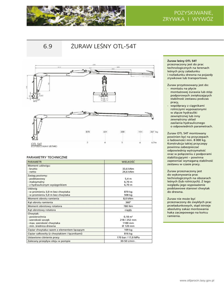 POZYSKIWANIE, Untergrund vorbereiten ZRYWKA I WYWÓZ 6.9 Żuraw leśny OTL-54T Żuraw leśny OTL 54T przeznaczony jest do prac technologicznych na terenach leśnych przy załadunku i rozładunku drewna na pojazdy zrywkowe lub transportowe. Żuraw przystosowany jest do: - montażu na płycie montażowej żurawia lub stóp podporowych zwiększających stabilność zestawu podczas pracy, - współpracy z ciągnikami rolniczymi wyposażonymi w złącze hydrauliki zewnętrznej lub inny zewnętrzny układ zasilania hydraulicznego o odpowiednich parametrach. PARAMETRY TECHNICZNE PARAMETR WIELKOŚĆ Moment udźwigu: - brutto - netto 33,6 kNm 24,6 kNm Zasięg poziomy: - podstawowy - maksymalny - z hydraulicznym wysięgnikiem 5,4 m 6,70 m 6,70 m Udźwig - w promieniu 3,0 m bez chwytaka - w promieniu 5,0 m bez chwytaka 870 kg 508 kg Moment obrotu ramienia Kąt obrotu ramienia Moment obrotowy rotatora Kąt obrotowy rotatora Chwytak: - powierzchnia - szerokość szczęk - max. szerokość chwytaka - min. średnica drewna Ciężar chwytaka razem z elementem łączącym Ciężar całkowity (z chwytakiem i łącznikami) Ustawione ciśnienie pracy Zalecany przepływ oleju w pompie 8,0 kNm 360° 780 Nm ciągły 0,18 m2 218 / 252 mm 1100 mm Ø 120 mm Żuraw OTL 54T montowany powinien być na przyczepach o ładowności min. 8 000 kg. Konstrukcja takiej przyczepy powinna zabezpieczać odpowiednią wytrzymałość oraz w połączeniu z podporami stabilizującymi – powinna zapewniać wymaganą stabilność zestawu w czasie pracy. Żuraw przeznaczony jest do wykonywania prac technologicznych na obszarach leśnych (lub rolniczych). Z tego względu jego wyposażenie podstawowe stanowi chwytak do drewna. Żuraw nie może być przeznaczony do zwykłych prac przeładunkowych, stąd istnieje absolutny zakaz montowania haka zaczepowego na końcu ramienia. 109 kg 816 kg 170 bar / 17,0 MPa 30-50 L/min . www.otljarocin.lasy.gov.pl