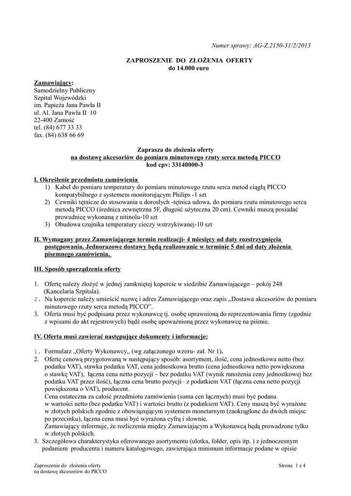 Numer sprawy: AG-Z.2150-31/2/2013 ZAPROSZENIE DO ZŁOŻENIA OFERTY do 14.000 euro Zamawiający: Samodzielny Publiczny Szpital Wojewódzki im. Papieża Jana Pawła II ul. Al. Jana Pawła II 10 22-400 Zamość tel. (84) 677 33 33 fax. (84) 638 66 69 Zaprasza do złożenia oferty na dostawę akcesoriów do pomiaru minutowego rzuty serca metodą PICCO kod cpv: 33140000-3 I. Określenie przedmiotu zamówienia 1) Kabel do pomiaru temperatury do pomiaru minutowego rzutu serca metod ciągłą PICCO kompatybilnego z systemem monitorującym Philips -1 szt 2) Cewniki tętnicze do stosowania u dorosłych -tętnica udowa, do pomiaru rzutu minutowego serca metodą PICCO (średnica zewnętrzna 5F, długość użyteczna 20 cm). Cewniki muszą posiadać prowadnicę wykonaną z nitinolu-10 szt 3) Obudowa czujnika temperatury cieczy wstrzykiwanej-10 szt II. Wymagany przez Zamawiającego termin realizacji- 4 miesięcy od daty rozstrzygnięcia postępowania. Jednorazowe dostawy będą realizowanie w terminie 5 dni od daty złożenia pisemnego zamówienia. III. Sposób sporządzenia oferty 1. Ofertę należy złożyć w jednej zamkniętej kopercie w siedzibie Zamawiającego – pokój 248 (Kancelaria Szpitala). 2. Na kopercie należy umieścić nazwę i adres Zamawiającego oraz zapis „Dostawa akcesoriów do pomiaru minutowego rzuty serca metodą PICCO”. 3. Oferta musi być podpisana przez wykonawcę tj. osobę uprawnioną do reprezentowania firmy (zgodnie z wpisami do akt rejestrowych) bądź osobę upoważnioną przez wykonawcę na piśmie. IV. Oferta musi zawierać następujące dokumenty i informacje: 1. Formularz „Oferty Wykonawcy„ (wg załączonego wzoru- zał. Nr 1). 2. Ofertę cenową przygotowaną w następujący sposób: asortyment, ilość, cena jednostkowa netto (bez podatku VAT), stawka podatku VAT, cena jednostkowa brutto (cena jednostkowa netto powiększona o stawkę VAT), łączna cena netto pozycji – bez podatku VAT (wynik mnożenia ceny jednostkowej bez podatku VAT przez ilość), łączna cena brutto pozycji– z podatkiem VAT (łączna cena netto pozycji powiększona o VAT), producent. Cena ostateczna za całość przedmiotu zamówienia (suma cen łącznych) musi być podana w wartości netto (bez podatku VAT) i wartości brutto (z podatkiem VAT). Ceny muszą być wyrażone w złotych polskich zgodnie z obowiązującym systemem monetarnym (zaokrąglone do dwóch miejsc po przecinku), łączna cena musi być wyrażona cyfrą i słownie. Zamawiający informuje, że rozliczenia między Zamawiającym a Wykonawcą będą prowadzone tylko w złotych polskich. 3. Szczegółowa charakterystyka oferowanego asortymentu (ulotka, folder, opis itp. ) z jednoczesnym podaniem producenta i numeru katalogowego, zawierająca minimum informacje podane w opisie Zaproszenie do złożenia oferty na dostawę akcesoriów do PICCO Strona 1 z 4 przedmiotu zamówienia. 4. Deklarację wytwórcy (deklaracja zgodności CE) o spełnieniu wymagań zasadniczych, certyfikat jednostki notyfikowanej dla oferowanego przedmiotu zamówienia zgodnie z ustawą o wyrobach medycznych. V. Termin złożenia oferty: 05-07-2013 r. VI. Osobami uprawnionymi do kontaktów z Wykonawcami są: - w sprawach merytorycznych – lek. med. Jarosław Bródka tel. (84) 677 31 86 - w sprawach formalnych– mgr Małgorzata Choma, tel.(84) 677 32 78. VII. Przy wyborze oferty Zamawiający będzie kierował się kryterium: cena – 100 % . VIII. Cena podana przez Wykonawcę nie może ulec podwyższeniu przez okres 4 miesięcy od daty rozstrzygnięcia postępowania. IX. Informacja o wyborze oferty zostanie zamieszczona na stronie internetowej Szpitala. X. Postępowanie zostanie zakończone wysyłaniem pisemnych zamówień. Załączniki: 1. Formularz oferty Wykonawcy 2. Formularz oferty cenowej DYREKTOR SAMODZIELNEGO PUBLICZNEGO SZPITALA WOJEWÓDZKIEGO im. Papieża Jana Pawła II w Zamościu lek. med Andrzej Mielcarek Zaproszenie do złożenia oferty na dostawę akcesoriów do PICCO Strona 2 z 4 Załącznik Nr 1 do zaproszenia OFERTA WYKONAWCY Dane dotyczące Wykonawcy: Dane dotyczące Zamawiającego: Nazwa: ...................................................................... Nazwa: Samodzielny Publiczny Szpital Wojewódzki im Papieża Jana Pawła II Siedziba (dokładny adres): ....................................... Adres: ul. Aleje Jana Pawła II 10 22-400 Zamość ..................................................................................... Numer telefonu : ........................................................ Numer telefonu: (84) 677 33 33 Numer faxu : ......................................................... Numer faxu: (84) 638 66 69 Numer NIP : ......................................................... Numer NIP: 922-22-92-491 Zobowiązania wykonawcy: 1. Nawiązując do zaproszenia do złożenia oferty (numer sprawy: AG-Z.2150-31/2/2013) na dostawę akcesoriów do pomiaru minutowego rzuty serca metodą PICCO oferuję wykonanie przedmiotu zamówienia za cenę: a) netto: ................................zł (słownie: ........................................................................................ ........................................................................................................................złotych) b) stawka podatku VAT: ................... % c) brutto: ..............................zł (słownie: ......................................................................................... ........................................................................................................................złotych). 2. Oświadczam, że zapoznałem się z opisem przedmiotu zamówienia i nie wnoszę do niego zastrzeżeń. 3. Oświadczam, że oferowany przedmiot zamówienia spełnia wymogi określone w przepisach obowiązującego prawa, jest bezpieczny i dopuszczony do używania na terenie Polski. 4. Oświadczam, że przez okres 4 miesięcy, od daty rozstrzygnięcia postępowania, cena jednostkowa br