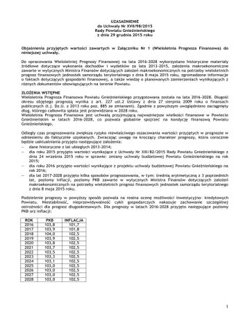 UZASADNIENIE do Uchwały Nr XVII/98/2015 Rady Powiatu Gnieźnieńskiego z dnia 29 grudnia 2015 roku Objaśnienia przyjętych wartości zawartych w Załączniku Nr 1 (Wieloletnia Prognoza Finansowa) do niniejszej uchwały. Do opracowania Wieloletniej Prognozy Finansowej na lata 2016-2028 wykorzystano historyczne materiały źródłowe dotyczące wykonania dochodów i wydatków za lata 2013-2015, założenia makroekonomiczne zawarte w wytycznych Ministra Finansów dotyczących założeń makroekonomicznych na potrzeby wieloletnich prognoz finansowych jednostek samorządu terytorialnego z dnia 8 maja 2015 roku, zgromadzone informacje o faktach dotyczących gospodarki finansowej, a także wiedzę o planowanych zamierzeniach wynikających z różnych dokumentów obowiązujących na terenie Powiatu. ZŁOŻENIA WSTĘPNE Wieloletnia Prognoza Finansowa Powiatu Gnieźnieńskiego przygotowana została na lata 2016-2028. Długość okresu objętego prognozą wynika z art. 227 ust.2 Ustawy z dnia 27 sierpnia 2009 roku o finansach publicznych (t.j. Dz.U. z 2013 roku poz. 885 ze zmianami). Zgodnie z powyższym uwzględniono zaciągnięty dług, którego całkowita spłata jest przewidziana w 2028 roku. Wieloletnia Prognoza Finansowa jest uchwałą przyjmującą najważniejsze wielkości finansowe w Powiecie Gnieźnieńskim w latach 2016-2028, co pozwala globalnie spojrzeć na kondycję finansową Powiatu Gnieźnieńskiego. Odległy czas prognozowania zwiększa ryzyko niewłaściwego oszacowania wartości przyjętych w prognozie w odniesieniu do faktycznie uzyskanych. Zwracając uwagę na kroczący charakter prognozy, która corocznie będzie uaktualniania przyjęto następujące założenia: dane historyczne z lat ubiegłych 2013-2014; dla roku 2015 przyjęto wartości wynikające z Uchwały Nr XIII/82/2015 Rady Powiatu Gnieźnieńskiego z dnia 24 września 2015 roku w sprawie: zmiany uchwały budżetowej Powiatu Gnieźnieńskiego na rok 2015; dla roku 2016 przyjęto wartości wynikające z projektu uchwały budżetowej Powiatu Gnieźnieńskiego na rok 2016; dla lat 2017-2028 przyjęto kilka sposobów prognozowania, w tym: średnią arytmetyczną z 3 poprzednich lat, poziomy inflacji, poziomy PKB zawarte w wytycznych Ministra Finansów dotyczących założeń makroekonomicznych na potrzeby wieloletnich prognoz finansowych jednostek samorządu terytorialnego z dnia 8 maja 2015 roku. Podzielenie prognozy w powyższy sposób pozwala na realna ocenę możliwości inwestycyjno- kredytowych Powiatu. Niestabilność, nieprzewidywalność cykli gospodarczych nakazuje zachowanie szczególnej ostrożności dla prognoz długookresowych. Dla prognozy w latach 2016-2028 przyjęto następujące poziomy PKB orz inflacji: ROK 2016 2017 2018 2019 2020 2021 2022 2023 2024 2025 2026 2027 2028 PKB 103,8 103,9 104,0 103,9 103,8 103,7 103,5 103,3 103,1 103,0 103,0 103,0 103,0 INFLACJA 101,7 101,8 102,5 102,5 102,5 102,5 102,5 102,5 102,5 102,5 102,5 102,5 102,5 1 Dochody i wydatki do projekcji Wieloletniej Prognozy Finansowej stanowią wielkości zagregowane (z praktyki sporządzania planów wieloletnich należy zauważyć, że niekorzystne jest ustalenie zbyt wysokiego, jak i zbyt niskiego poziomu agregacji). Jest to niezbędne do oceny, czy projekcje budżetów w przyszłych latach spełnią reguły określone w art. 242 i 243 ustawy o finansach publicznych. W ramach tych wartości wyodrębniono dwie zasadnicze grupy ze względu na ich charakter tzn. bieżące i majątkowe, przy czym w poszczególnych grupach wyodrębniono w przypadku dochodów - źródła, bądź grupy źródeł dochodów, a w przypadku wydatków - grupy wydatkowe zgodnie z uchwałą budżetową, a w nich wyodrębniono tzw. rodzaje działalności rozumiane jako: zadania oświatowe, w tym też zadania nakierowane na młodzież, zadania z zakresu pomocy społecznej, zadania w zakresie dróg, zdrowia oraz pozostałe. Wyliczenie poszczególnych wartości rozpoczęto od wyodrębnienia w każdej podgrupie tzw. transferów (dochodów i wydatków finansowanych ze środków zewnętrznych), z uwagi na ich dwoisty charakter posiadają one zarówno cechy właściwe dla danego rodzaju dochodu jak i samego specyficznie szacowanego transferu. Wyodrębnienie takiej kategorii wydaje się jak najbardziej celowe, tym bardziej, że dochody te stanowią od razu źródło finansowania konkretnego zadania Powiatu. Dodatkowo w grupie wynagrodzenia i składki od nich naliczane w zadaniach oświatowych dokonano podziału na nauczycieli oraz na administrację i obsługę. Po przyjęciu powyższych założeń został sporządzony dokument pn. "Tabela pomocnicza do sporządzenia Wieloletniej Prognozy Finansowej na lata 2016-2028", w którym zostały uwzględnione wszystkie w/w podziały zarówno w dochodach, jak i w wydatkach. 2 PROGNOZA DOCHODÓW Dochody bieżące, z tego: 1. Dochody z tytułu udziału we wpływach z podatku dochodowego od osób fizycznych (PIT) Kształtowanie się wartości dla wyżej wymienionego dochodu w poszczególnych latach przedstawia się następująco: rok rok rok rok rok rok rok rok rok rok rok rok rok rok rok rok 2013 2014 2015 2016 2017 2018 2019 2020 2021 2022 2023 2024 2025 2026 2027 2028 - 18 - 20 - 22 - 24 - 24 - 25 - 26 - 26 - 27 - 28 - 28 - 29 - 30 - 30 - 31 - 32 871 042 745 621 467 333 324 092 761 926 380 974 015 498 665 886 332 533 015 846 716 242 434 148 170 002 924 252 697 358 489 792 Przyjęte założenia: rok 2013-2014: dane historyczne. rok 2015: dochody zgodne zUchwałą Nr XIII/82/2015 Rady Powiatu Gnieźnieńskiego z dnia 24 września 2015 roku w sprawie: zmiany uchwały budżetowej Powiatu Gnieźnieńskiego na rok 2015. rok 2016: dochody zgodne z projektem uchwały budżetowej Powiatu Gnieźnieńskiego na rok 2016. rok 2017-2028: ze względów ostrożnościowych przyjęto poziom inflacji mierzonej wskaźnikiem wzrostu cen towarów i usług konsumpcyjnych - CPI w badanym okresie. Analizując dochody z tytułu udziału we wpływach z pod