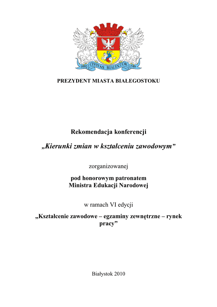 PREZYDENT MIASTA BIAŁEGOSTOKU Rekomendacja konferencji „Kierunki zmian w kształceniu zawodowym” zorganizowanej pod honorowym patronatem Ministra Edukacji Narodowej w ramach VI edycji „Kształcenie zawodowe – egzaminy zewnętrzne – rynek pracy” Białystok 2010 Przyjęto przez Radę Programową Konferencji w dn. 29.04.2010 r. 2 Rekomendacja konferencji „Kierunki zmian w kształceniu zawodowym” W Zespole Szkół Rolniczych CKP w Białymstoku 1 w dniach 10 – 11 marca 2010roku odbyła się VI juŜ edycja ogólnopolskiej konferencji zawodowej „Kształcenie zawodowe - egzaminy zewnętrzne - rynek pracy". Tematem przewodnim konferencji stały się " Kierunki zmian w kształceniu zawodowym”. Konferencję zorganizowaną przez Pana dr hab. Tadeusza Truskolaskiego – Prezydenta Miasta Białegostoku objęła honorowym patronatem Pani Katarzyna Hall - Minister Edukacji Narodowej. Patronaty miesięcznika „Dyrektor Szkoły”, jak teŜ lokalnych mediów, przydały rangi i słuŜyły promocji tej waŜnej inicjatywy Samorządu Białegostoku. Konferencja miała teŜ wymiar konkretny - Inicjatorzy oraz Rada Programowa poprzez tę konferencję poszukiwali rozwiązań zmierzających w szczególności do wytyczania kierunków zmian w kształceniu zawodowym w ramach przygotowań do zapowiadanej przez Ministerstwo Edukacji modernizacji kształcenia zawodowego, a następnie wdraŜania zmiany edukacyjnej w kształceniu zawodowym. Liczne grono znamienitych Gości i bogaty program konferencji zgromadziły liczne grono uczestników – reprezentacje urzędów pracy oraz pracodawców, uczelni wyŜszych, przedstawicieli samorządów, dyrektorów szkół i centrów kształcenia praktycznego oraz ustawicznego Regionu Podlasia i Białegostoku, licznych innych instytucji oraz nauczycieli i młodzieŜ szkół ponadgimnazjalnych. Gości oraz uczestników tego szczególnego ponadregionalnego spotkania powitał prowadzący konferencję - Pan Wojciech Janowicz, Dyrektor Departamentu Edukacji, Kultury i Sportu Urzędu Miejskiego w Białymstoku. Konferencję otworzył Pan Tadeusz Truskolaski, Prezydent Miasta Białegostoku. W swoim wystąpieniu wskazał na rangę i wagę inicjatywy Samorządu Białegostoku od początku ukierunkowanej na wspieranie i promowane kształcenia zawodowego. Pan Jerzy Kiszkiel, Podlaski Kurator Oświaty wskazując na dobrą współpracę z Samorządem Białegostoku, podziękował za wiele cennych, podejmowanych przez Miasto Białystok przedsięwzięć. Sesja seminaryjna słuŜyła zaprezentowaniu w szczególności problematyki kształcenia zawodowego z perspektywy pracodawców. Oni teŜ zaproszeni zostali do zabrania głosu w pierwszej jej części. „Szkolnictwo zawodowe a rynek pracy – nadzieje i moŜliwości współpracy” były tematem wystąpienia Pani Danuty Kaszyńskiej przedstawiciela Podlaskiego Forum Gospodarczego, zaś „Potrzeby kadrowe podlaskich pracodawców” rozpoznane w wyniku badań prowadzonych w ramach projektu… realizowanego przez WyŜszą Szkołę Ekonomiczną w Białymstoku zaprezentował Pan Maciej Muczyński. Szanse i perspektywy „MoŜliwości współpracy ze szkołami zawodowymi” nakreślił Pan Jan Zadykowicz , prezes firmy Jazon Sp. z o.o.. Pani .. Karpiuk reprezentująca Izbę Rzemieślniczą i Przedsiębiorczości przedstawiła zgromadzonym „Stanowisko Izby w/s projektu Ministerstwa Edukacji narodowej dotyczącego modyfikacji kształcenia zawodowego”. O ”Losach podlaskich absolwentów” mówiła Pani …..Dąbrowska , pracownik Wojewódzkiego Urzędu Pracy, zaś „Dobre praktyki we współpracy z pracodawcami” zaprezentowała Pani BoŜena Krasnodębska, Dyrektor Centrum Kształcenia Ustawicznego w Białymstoku. ZałoŜenia tegorocznej konferencji oraz działania Samorządu Miasta Białegostoku na przestrzeni ostatnich lat zaprezentowała Lucja Orzechowska – Zastępca Dyrektora 3 Departamentu. ZaangaŜowanie w kształcenie zawodowe, to zaangaŜowanie w misję społeczną edukacji – słuŜbę środowisku lokalnemu na dalsze lata. Rozwój oferty edukacyjnej Białymstoku to wynik systematyczności i konsekwencji działań systemowych, skutecznie podejmowanych przez organ prowadzący. Przygotowanie Miasta do modernizacji kształcenia zawodowego uwzględnia zmiany proponowane przez Ministerstwo Edukacji Narodowej zapowiadane powstawanie sieci przedsiębiorstw o najwyŜszych walorach edukacyjnych, w których uczniowie będą mieli moŜliwość praktycznego zapoznania się z nowoczesnymi metodami zarządzania, organizacji pracy, a nauczyciele - moŜliwość aktualizacji wiedzy zawodowej. W związku z powyŜszym w ramach paneli dyskusyjnych podjęto próbę odpowiedzi na dwa zasadnicze pytania: 1. Co samorząd Białegostoku moŜe zaoferować Pracodawcom? 2. Czego Pracodawcy oczekują od szkół i Samorządu? W reprezentatywnym gronie przedstawicieli pracodawców oraz uczestników konferencji wypracowano tezy na dyskusyjne spotkania panelowe: • • • doskonalenie nauczycieli szansą na podniesienie jakości kształcenia zawodowego. dobre przygotowanie zawodowe absolwentów szansą na zatrudnienie po ukończeniu szkoły (współpraca z pracodawcami, funkcjonowanie w szkołach firmy symulacyjnej, zatrudnianie specjalistów). pozaszkolne formy kształcenia jako alternatywna forma uzyskiwania kwalifikacji zawodowych, Konferencja w swoim załoŜeniu słuŜyła poszukiwaniu najbardziej optymalnych kierunków zmian w kształceniu zawodowym, w ramach przygotowań Miasta do modernizacji kształcenia zawodowego. Sprzyjała temu formuła branŜowych paneli dyskusyjnych prowadzonych przez moderatorów – Dyrektorów Szkół Miasta Białegostoku. Stanowiły one wypróbowaną juŜ formułę dyskusji ekspertów, licznych wypowiedzi pracodawców, pracowników naukowych białostockich uczelni i nauczycieli białostockich szkół, zgłaszania wniosków i problemów. Panele prowadzone przez dobrze przygotowanych moderatorów umoŜliwiły zebranie