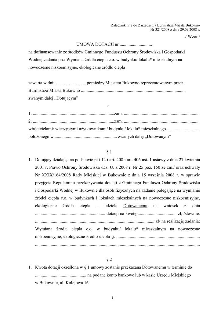 Załącznik nr 2 do Zarządzenia Burmistrza Miasta Bukowno Nr 321/2008 z dnia 29.09.2008 r. / Wzór / UMOWA DOTACJI nr ............................. na dofinansowanie ze środków Gminnego Funduszu Ochrony Środowiska i Gospodarki Wodnej zadania pn.: Wymiana źródła ciepła c.o. w budynku/ lokalu* mieszkalnym na nowoczesne niskoemisyjne, ekologiczne źródło ciepła zawarta w dniu............................pomiędzy Miastem Bukowno reprezentowanym przez: Burmistrza Miasta Bukowno .............................................................................................. zwanym dalej „Dotującym” a 1. .........................................................................zam. .................................................................... 2. .........................................................................zam. .................................................................... właścicielami/ wieczystymi uŜytkownikami/ budynku/ lokalu* mieszkalnego.............................. połoŜonego w ........................................................ zwanych dalej „Dotowanym” §1 1. Dotujący działając na podstawie pkt 12 i art. 408 i art. 406 ust. 1 ustawy z dnia 27 kwietnia 2001 r. Prawo Ochrony Środowiska /Dz. U. z 2008 r. Nr 25 poz. 150 ze zm./ oraz uchwały Nr XXIX/164/2008 Rady Miejskiej w Bukownie z dnia 15 września 2008 r. w sprawie przyjęcia Regulaminu przekazywania dotacji z Gminnego Funduszu Ochrony Środowiska i Gospodarki Wodnej w Bukownie dla osób fizycznych na zadanie polegające na wymianie źródeł ciepła c.o. w budynkach i lokalach mieszkalnych na nowoczesne niskoemisyjne, ekologiczne źródła ciepła – udziela Dotowanemu na wniosek z dnia ............................................................... dotacji na kwotę ................................... zł, /słownie: ....................................................... ................................................... zł/ na realizację zadania: Wymiana źródła ciepła c.o. w budynku/ lokalu* mieszkalnym na nowoczesne niskoemisyjne, ekologiczne źródło ciepła tj. ........................................................................... .................................................................................................................................................... §2 1. Kwota dotacji określona w § 1 umowy zostanie przekazana Dotowanemu w terminie do .............................................. na podane konto bankowe lub w kasie Urzędu Miejskiego w Bukownie, ul. Kolejowa 16. -1- 2. Kwota dotacji zostanie wypłacona z konta Gminnego Funduszu Ochrony Środowiska i Gospodarki Wodnej Dział 900 rozdz. 90011 §6270. §3 Ustala się termin realizacji zadania od ........................................ do ........................................... . §4 1. Dotowany oświadcza, iŜ posiada środki finansowe na realizację zadania określonego w § 1, które wraz ze środkami Gminnego Funduszu Ochrony Środowiska i Gospodarki Wodnej zapewnią wykonanie prac wynikających z harmonogramu rzeczowo-finansowego w ....... roku. 2. Dotowany zobowiązuje się do terminowej realizacji zadania zgodnie z harmonogramem rzeczowo-finansowym, stanowiącym integralną część umowy (Załącznik nr 1). 3. Dotowany uzyska planowany efekt ekologiczny. 4. Dotowany jest zobowiązany do przedłoŜenia Dotującemu ...................................................... §5 1. Dotujący ma prawo kontroli wykorzystania dotacji zgodnie z przeznaczeniem. Z przeprowadzonej kontroli sporządza się raport. 2. Dotowany zapewni wstęp na teren nieruchomości celem kontroli realizacji zadania, w kaŜdej jego fazie. 3. Kontrola, o której mowa w ust. 1 polega na sprawdzeniu: a. rzeczywistego przebiegu realizacji inwestycji (kontrola merytoryczna), b. dokumentów związanych z realizacją inwestycji, w szczególności oryginałów dokumentów finansowych (kontrola formalno-rachunkowa). 4. Kontrolę mogą przeprowadzać upowaŜnieni przez Dotującego pracownicy Urzędu Miejskiego w Bukownie. §6 Dotowany jest zobowiązany do pisemnego powiadomienia Dotującego o zakończeniu realizacji zadania, przed upływem terminu określonego w § 3 nin. umowy. §7 1. W przypadku stwierdzenia w trakcie kontroli nieprawidłowości w sposobie wykorzystania dotacji, polegających w szczególności na: -2- a. niezgodnej z celem określonym we wniosku i w zawartej umowie realizacji dotowanego zadania, b. rozbieŜnościach między oryginałami dokumentów, a przedstawionymi do rozliczenia kopiami lub zestawieniami, c. oświadczeniu nieprawdy w załączonych do rozliczenia oświadczeniach, przekazana kwota dotacji podlega zwrotowi na rachunek bankowy GFOŚiGW wraz z ustawowymi odsetkami liczonymi od dnia przekazania dotacji – w terminie określonym przez Dotującego w wezwaniu do zwrotu dotacji. §8 1. Dotujący moŜe natychmiastowo rozwiązać umowę, gdy: a. Dotowany nie przystąpił w terminie do realizacji lub odstąpił od realizacji zadania, na które została udzielona dotacja, b. dotacja lub jej część została wykorzystana niezgodnie z przeznaczeniem określonym w umowie, c. nie został osiągnięty planowany efekt ekologiczny, d. dotowany nie dotrzymuje innych warunków zastrzeŜonych w umowie. 2. Dotujący informuje Dotowanego na piśmie o rozwiązaniu umowy podając przyczynę. 3. W przypadkach wymienionych w ust. 1 Dotowany zobowiązany jest do zwrotu udzielonej dotacji wraz z ustawowymi odsetkami w stosunku rocznym naliczonymi od dnia jej przekazania Dotowanemu do dnia zwrotu. Zwrot w/w kwoty winien nastąpić na rachunek bankowy GFOŚiGW w terminie określonym przez Dotującego w wezwaniu do zwrotu dotacji. §9 1. Dotowany zobowiązany jest do rozliczenia dotacji w terminie do 14 dni od dnia zakończenia realizacji zadania określonego w § 3 nin. umowy i nie później niŜ do dnia 30 listopada roku, w którym przyznano dotację. 2. Rozliczenie dotacji następuje po przedłoŜeniu D