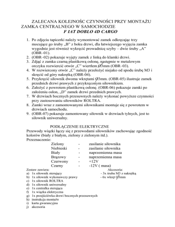 ZALECANA KOLEJNOŚC CZYNNOŚCI PRZY MONTAśU ZAMKA CENTRALNEGO W SAMOCHODZIE F IAT DOBLO 4D CARGO 1. Po zdjęciu tapicerki naleŜy wymontować zamek odkręcając trzy mocujące go śruby „B” z boku drzwi, dla łatwiejszego wyjęcia zamka wygodnie jest równieŜ wykręcić prowadnicę szyby – dwie śruby „A” (OBR–01). 2. (OBR–02) pokazuje wyjęty zamek z linką do klamki drzwi. 3. Zdjąć z zamka czarną plastikową osłonę, następnie w metalowym orczyku rozwiercić otwór „C” wiertłem O3mm (OBR–03). 4. W rozwiercony otwór „C” naleŜy przełoŜyć niejako od spodu śrubę M3 i skręcić od góry nakrętką (OBR-04). 5. Przykręcić siłownik dwoma wkrętami O3mm. (OBR-05) ilustruje zamek przednich drzwi prawych z przykręconym siłownikiem. 6. ZałoŜyć z powrotem plastikową osłonę. (OBR-06) pokazuje zamki po załoŜeniu osłon, „D” zamek drzwi przednich prawych. 7. W drzwiach bocznych przesuwnych naleŜy wykonać powyŜsze czynności przy zastosowaniu siłowników ROLTRA. 8. Zamki wraz z zamontowanymi siłownikami montuje się z powrotem w drzwiach samochodu. 9. (OBR-07) pokazuje zamontowany siłownik w drzwiach tylnych, jest to siłownik uniwersalny. PODŁĄCZENIE ELEKTRYCZNE Przewody wiązki łączy się z przewodami siłowników zachowując zgodność kolorów (biały z białym, zielony z zielonym itd.). Przeznaczenie: Zielony zasilanie siłownika Niebieski zasilanie siłownika Biały naprzemienna masa Brązowy naprzemienna masa Czerwony +12V Czarny -12V ( masa) Zestaw zawiera: Akcesoria: a) 1x siłownik sterujący - 3x śruba M3 z nakrętką b) 1x siłownik wykonawczy prawy - 6x wkręt O3mm c) 1x siłownik ROLTRA d) 1x siłownik uniwersalny e) 1x centralka sterująca f) 1x wiązka elektryczna g) 1x przejściówka drzwi bocznych przesuwnych h) instrukcja montaŜu i) karta gwarancyjna j) akcesoria