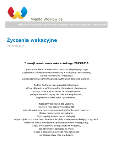 Miasto Wojkowice http://www.wojkowice.pl/main/aktualnosci/Zyczenia-wakacyjne/idn:1379/printpdf Życzenia wakacyjne 23 czerwca 2016 kategoria: Wojkowice Z okazji zakończenia roku szkolnego 2015/2016 Dyrektorom, Nauczycielom i Pracownikom Niepedagogicznym dziękujemy za codzienny trud wkładany w nauczanie, wychowanie, opiekę nad dziećmi i młodzieżą oraz za rzetelną i sumienną pracę, wytrwałość, serce dla uczniów . Radom Rodziców oraz wszystkim Rodzicom, którzy aktywnie współpracowali z placówkami oświatowymi naszego miasta, dziękujemy za zaangażowanie, podejmowane inicjatywy dla dobra Waszych dzieci, wspieranie działań szkół i przedszkola . Kierujemy gratulacje dla uczniów, którzy w roku szkolnym 2015/2016 odnieśli sukcesy w nauce, różnego rodzaju konkursach i sporcie . Dzisiaj rozpoczynają się wakacje. Wykorzystajcie ten czas jak najlepiej, odpocznijcie od trudów nauki i nabierzcie sił do podejmowania kolejnych wyzwań. Odebrane dzisiaj świadectwa są ukoronowaniem Waszej pracy. Część z Was powróci do tej szkoły we wrześniu, zaś absolwenci opuszczą jej mury, a wraz z początkiem nowego roku szkolnego rozpoczną nowy etap w edukacji. Na wakacyjny czas życzymy wszystkim szczęśliwych, udanych i bezpiecznych wakacji . Jak najwięcej ciepłych, słonecznych i radosnych dni obfitujących w niezapomniane doznania oraz dużo wypoczynku .