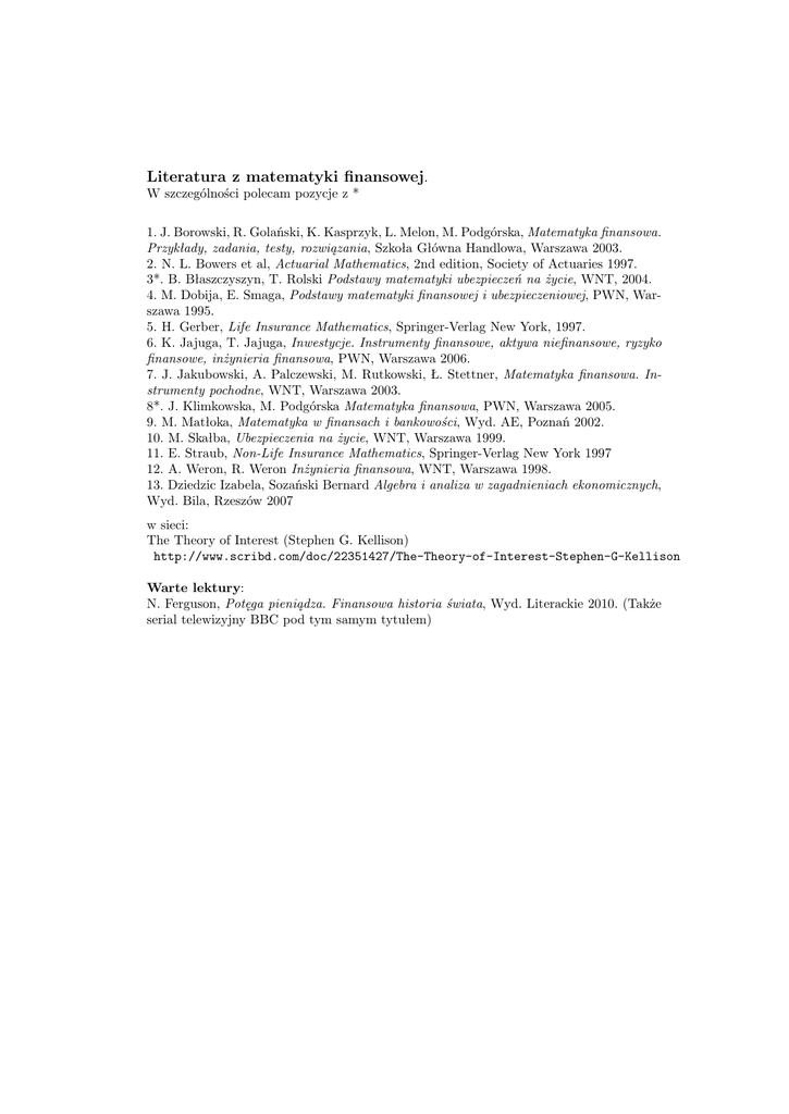 Literatura z matematyki finansowej. W szczególności polecam pozycje z * 1. J. Borowski, R. Golański, K. Kasprzyk, L. Melon, M. Podgórska, Matematyka finansowa. Przykłady, zadania, testy, rozwiązania, Szkoła Główna Handlowa, Warszawa 2003. 2. N. L. Bowers et al, Actuarial Mathematics, 2nd edition, Society of Actuaries 1997. 3*. B. Błaszczyszyn, T. Rolski Podstawy matematyki ubezpieczeń na życie, WNT, 2004. 4. M. Dobija, E. Smaga, Podstawy matematyki finansowej i ubezpieczeniowej, PWN, Warszawa 1995. 5. H. Gerber, Life Insurance Mathematics, Springer-Verlag New York, 1997. 6. K. Jajuga, T. Jajuga, Inwestycje. Instrumenty finansowe, aktywa niefinansowe, ryzyko finansowe, inżynieria finansowa, PWN, Warszawa 2006. 7. J. Jakubowski, A. Palczewski, M. Rutkowski, Ł. Stettner, Matematyka finansowa. Instrumenty pochodne, WNT, Warszawa 2003. 8*. J. Klimkowska, M. Podgórska Matematyka finansowa, PWN, Warszawa 2005. 9. M. Matłoka, Matematyka w finansach i bankowości, Wyd. AE, Poznań 2002. 10. M. Skałba, Ubezpieczenia na życie, WNT, Warszawa 1999. 11. E. Straub, Non-Life Insurance Mathematics, Springer-Verlag New York 1997 12. A. Weron, R. Weron Inżynieria finansowa, WNT, Warszawa 1998. 13. Dziedzic Izabela, Sozański Bernard Algebra i analiza w zagadnieniach ekonomicznych, Wyd. Bila, Rzeszów 2007 w sieci: The Theory of Interest (Stephen G. Kellison) http://www.scribd.com/doc/22351427/The-Theory-of-Interest-Stephen-G-Kellison Warte lektury: N. Ferguson, Potęga pieniądza. Finansowa historia świata, Wyd. Literackie 2010. (Także serial telewizyjny BBC pod tym samym tytułem)