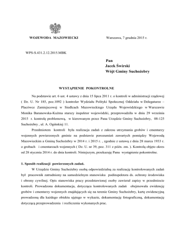 WOJEWODA MAZOWIECKI Warszawa, 7 grudnia 2015 r. WPS-S.431.2.12.2015.MBK Pan Jacek Świrski Wójt Gminy Suchożebry WYSTĄPIENIE POKONTROLNE Na podstawie art. 6 ust. 4 ustawy z dnia 15 lipca 2011 r. o kontroli w administracji rządowej ( Dz. U. Nr 185, poz.1092 ) kontroler Wydziału Polityki Społecznej Oddziału w Delegaturze – Placówce Zamiejscowej w Siedlcach Mazowieckiego Urzędu Wojewódzkiego w Warszawie Monika Baranowska-Kuźma starszy inspektor wojewódzki, przeprowadziła w dniu 29 września 2015 r. kontrolę problemową, w kierowanym przez Pana Urzędzie Gminy Suchożebry, 08-125 Suchożebry , ul. A. Ogińskiej 11. Przedmiotem kontroli była realizacja zadań z zakresu utrzymania grobów i cmentarzy wojennych powierzonych gminie na podstawie porozumień zawartych pomiędzy Wojewodą Mazowieckim a Gminą Suchożebry w 2014 r. i 2015 r. , zgodnie z ustawą z dnia 28 marca 1933 r. o grobach i cmentarzach wojennych ( Dz. U. nr 39, poz. 311 z późn. zm. ). Kontrolą objęto okres od 28 stycznia 2014 r. do dnia kontroli. Niniejszym, przekazuję Panu wystąpienie pokontrolne. 1. Sposób realizacji powierzonych zadań. W Urzędzie Gminy Suchożebry osobą odpowiedzialną za realizację kontrolowanych zadań był pracownik zatrudniony na samodzielnym stanowisku podinspektora ds. ochrony środowiska i obrony cywilnej. Opis stanowiska pracy przedstawionej osoby zawierał zapisy w przedmiocie kontroli. Prowadzona dokumentacja, dotycząca kontrolowanych zadań obejmowała ewidencję grobów i cmentarzy wojennych znajdujących się na terenie Gminy Suchożebry, kartę ewidencyjną prowadzoną dla każdego obiektu ujętego w wykazie, dokumentację fotograficzną, dokumentację dotyczącą przeprowadzenia i rozliczenia wykonanych prac. 2 2. Prawidłowość wykorzystania środków otrzymanych na realizację zadań. Pomiędzy Wojewodą Mazowieckim a Gminą Suchożebry zostało zawarte Porozumienie z dnia 28 stycznia 2014 r. w sprawie powierzenia Gminie Suchożebry obowiązku realizacji prac remontowych oraz przyznania dotacji na ten cel. Na podstawie powyższego porozumienia Gmina Suchożebry przyjęła obowiązek realizacji prac remontowych na dwóch cmentarzach jeńców radzieckich w miejscowościach Sosna–Kozółki i Suchożebry w zakresie konserwacji płyt nagrobnych i krawężników oraz utrzymania porządku i pielęgnacji zieleni. Na prawidłową realizację zadania Wojewoda przyznał dotację celową w wysokości 10 000 zł. Zgodnie z zawartym porozumieniem Gmina Suchożebry zobowiązała się zrealizować zadanie w terminie do dnia 31 października 2014 r. Termin i zakres wykonanego zadania został zachowany. Następnie pomiędzy Wojewodą Mazowieckim a Gminą Suchożebry zostało zawarte Porozumienie z dnia 10 lutego 2015 r. w sprawie powierzenia Gminie obowiązku utrzymania porządku i pielęgnacji zieleni oraz przyznania dotacji na ten cel. Gmina przyjęła obowiązek utrzymania porządku i pielęgnacji zieleni na dwóch cmentarzach jeńców radzieckich polegający na koszeniu traw, pielęgnacji alejek oraz drobnych pracach remontowych. Na prawidłową realizację zadania Wojewoda przyznał dotację celową w wysokości 9000 zł. Termin realizacji zadania został ustalony do dnia 30 listopada 2015 r. W dniu kontroli tj. 29 września 2015 r. zadanie było w trakcie realizacji. 3. Prawidłowość prowadzenia dokumentacji związanej z wykorzystaniem dotacji. Zgodnie z art. 4 pkt 8 ustawy z dnia 29 stycznia 2004 r. Prawo zamówień publicznych ( Dz. U. 2013 poz. 907 z późn. zm.) przy wyborze wykonawcy nie miały zastosowania przepisy wymienionej ustawy. W związku z realizacją zadania na podstawie Porozumienia z dnia 28 stycznia 2014 r. Gmina Suchożebry w dniu 5 maja 2014 r. zawarła umowę-zlecenie z miejscowym Zakładem Gospodarki Komunalnej Sp. z.o.o, 08-125 Suchożebry , ul. A. Ogińskiej 11 dotyczącą wykonania prac na cmentarzach jeńców radzieckich w miejscowościach Sosna-Kozółki i Suchożebry w okresie od 5 maja do 30 października 2014 r. Komisja w składzie przedstawicieli Urzędu Gminy Suchożebry oraz wykonawcy w dniu 30 października dokonała oceny prac na dwóch cmentarzach jenieckich i sporządziła na tę okoliczność odrębne protokoły odbioru robót. Protokoły nie zawierały uwag oraz zastrzeżeń . Na podstawie oceny wykonania robót zawartych w protokołach odbioru oraz na podstawie faktury wystawionej przez wykonawcę Urząd Gminy Suchożebry w dniu 31 października 2015 r. dokonał przelewu kwoty 10 000 zł na rachunek wykonawcy. Faktura została opisana w sposób umożliwiający potwierdzenie wykorzystania dotacji. Wójt Gminy Suchożebry przekazał do Mazowieckiego Urzędu Wojewódzkiego w Warszawie 3 dokumentację rozliczeniową zgodnie z § 4.1. porozumienia. Na realizację zadania nie były wykorzystane środki własne gminy oraz z innych źródeł. W związku z realizacją zadania na podstawie Porozumienia z dnia 10 lutego 2015 r. Gmina Suchożebry w dniu 27 kwietnia 2015 r. zawarła umowę-zlecenie porządkowych z Zakładem przedstawionym jak wyżej zlecającą wykonanie prac i pielęgnacyjnych w okresie od 1 maja do 30 października 2015 r. Przedstawiony zakres robót był zgodny z zakresem przedstawionym we wniosku o przyznanie dotacji. Zgodnie z umową należność w kwocie 9 000 zł zostanie zapłacona po protokolarnym odbiorze robót i otrzymaniu faktury. 4. Sposób wykonania powierzonego zadania oceniony na podstawie oględzin. W dniu kontroli dokonano oględzin dwóch cmentarzy żołnierzy jeńców radzieckich w miejscowościach Sosna-Kozółki i remontowych i pielęgnacyjnych, Suchożebry. Sprawdzono zakresy wykonanych które były zgodne z zakresami prac prac określonymi w porozumieniach. Stan cmentarzy świadczył o prowadzeniu na bieżąco konserwacji płyt nagrobnych i krawężników oraz wykonywaniu prac porządkowych i pielęgnacji zieleni. Podczas oględzin stwierdzono zły stan ogrodzenia cmentarza w miejscowości Sosna -Koz