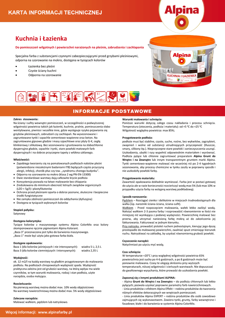 Kuchnia i Łazienka Do pomieszczeń wilgotnych i powierzchni narażonych na pleśnie, zabrudzenia i zachlapania Specjalna farba z substancjami czynnymi zabezpieczającymi przed grzybami pleśniowymi, odporna na szorowanie na mokro, dostępna w tysiącach kolorów Łazienka bez pleśni Czyste ściany kuchni Odporna na szorowanie Zakres stosowania: Na ściany i sufity wewnątrz pomieszczeń, w szczególności o podwyższonej wilgotności powietrza takich jak łazienki, kuchnie, pralnie, pomieszczenia słabo wentylowane, piwnice i wszelkie inne, gdzie występuje ryzyko pojawiania się grzybów pleśniowych, zabrudzeń czy zachlapań. Na wysezonowane i zagruntowane tynki i szpachle cementowo-wapienne oraz beton. Na zagruntowane gipsowe gładzie i masy szpachlowe oraz płyty G-K, cegłę klinkierową i silikatową. Bez sezonowania i gruntowania na słabochłonne dyspersyjne gładzie, szpachle i tynki, stare powłoki matowych farb dyspersyjnych i na dobrze przyczepne tapety z włókna szklanego. Właściwości: Zapobiega tworzeniu się na pomalowanych podłożach nalotów pleśni (potwierdzone niezależnymi badaniami ITB) będących często przyczyną alergii, infekcji, chorób płuc czy tzw. „syndromu chorego budynku”. Odporna na szorowanie na mokro (klasa 2 wg PN-EN-13300) Dwie standardowe warstwy dają całkowite krycie podłoża Konsystencja pozwala na łatwe malowanie bez chlapania Zredukowana do minimum obecność lotnych związków organicznych (LZO < 5g/l) i plastyfikatorów Ochrona przed pleśniami oparta o dobrze poznane, skuteczne i bezpieczne środki fungistatyczne Nie zamyka zdolności pomieszczeń do oddychania (dyfuzyjna) Dostępna w tysiącach wybranych kolorów Stopień połysku: Satynowy Dostępna kolorystyka: Tysiące kolorów z maszynowego systemu Alpina ColorMix oraz kolory skomponowane ręcznie pigmentami Alpina Kolorant. „Baza 3” przeznaczona jest tylko do barwienia maszynowego. „Baza 1” może być użyta jako gotowa farba biała. Dostępne opakowania: Baza 1 (dla kolorów jaśniejszych i nie intensywnych): Baza 3 (dla kolorów ciemniejszych i intensywnych): wiadra 5 L; 2,5 L wiadra 2,35 L Wydajność: ok. 12 m2/l na każdą warstwę na gładkim przygotowanym do malowania podłożu. Na podłożach chropowatych wydajność spada. Wydajność praktyczna zależna jest od grubości warstwy, na którą wpływ ma wiele czynników, w tym warunki malowania, rodzaj i stan podłoża, użyte narzędzia, osoba malująca. Rozcieńczanie: Na pierwszą warstwę można dodać max. 10% wody objętościowo Na warstwę nawierzchniową można dodać max. 5% wody objętościowo Zalecane narzędzia: Malować wałkiem, pędzlem lub natryskowo. Warunki malowania i schnięcia: Poniższe warunki dotyczą całego czasu nakładania i procesu schnięcia. Temperatura (otoczenia, podłoża i materiału): od +5 0C do +25 0C Wilgotność względna powietrza: max 85%; Przygotowanie podłoża: podłoże musi być stabilne, czyste, suche, nośne, bez wykwitów, zagrzybień, zwapnień i wolne od substancji utrudniających przyczepność (tłuszcze, smary, silikony itp.). Nieprzyczepne stare powłoki i zanieczyszczenia usunąć. Uszkodzenia, ubytki i rysy wypełnić odpowiednim materiałem i wyrównać. Podłoża pylące lub chłonne zagruntować preparatem Alpina Grunt do Wnętrz i na Zewnątrz lub innym transparentnym gruntem marki Alpina. Tynki cementowo-wapienne malować nie wcześniej niż po 2-4 tygodniach sezonowania, aby procesy chemiczne w tynku zaszły w poprawny sposób i nie uszkodziły powłoki farby. Przygotowanie materiału: Zawartość opakowania dokładnie wymieszać. Farba jest w postaci gotowej do użycia ale w razie konieczności rozcieńczyć wodą max 5% (lub max 10% w przypadku użycia farby na wstępną warstwę podkładową). Sposób nanoszenia: Pędzlem – Rozciągać cienko i delikatnie w miejscach trudnodostępnych dla wałka (np. narożniki ściana-ściana, ściana-sufit). Wałkiem - Przed rozpoczęciem malowania, wałek lekko zwilżyć wodą. Nałożyć wałkiem 2-3 pasma farby i rozprowadzić równomiernie w ilości nie mniejszej niż wynikająca z podanej wydajności. Powierzchnię malować bez przerw, aby utrzymać naniesioną farbę mokrą aż do zakończenia jej fakturowania. Fakturować w jednym kierunku. Przy natrysku, prowadzić pistolet ruchem jednostajnym, kierując jego dyszę prostopadle do malowanej powierzchni, zwalniać spust zmieniając kierunek ruchu. Natryskiwać na zakładkę, by uzyskać równomierną grubość powłoki. Czyszczenie narzędzi: Natychmiast po użyciu myć wodą. Czas schnięcia: W temperaturze +20°C i przy względnej wilgotności powietrza 65% powierzchnia jest sucha po 4-6 godzinach, a po 8 godzinach może być ponownie malowana. Czasy te ulegają skróceniu przy wyższych temperaturach, niższej wilgotności i cieńszych warstwach. Nie dopuszczać do gwałtownego wysychania, które prowadzi do uszkodzenia powłoki. Zapoznaj się z innymi produktami ALPINA: - Alpina Grunt do Wnętrz i na Zewnątrz – do podłoży chłonnych lub lekko pylących; pozwala uzyskać poprawne parametry farb nawierzchniowych. - Linia produktów z efektem Alpina Effekt – rodzina produktów do tworzenia różnych efektów dekoracyjnych we wnętrzach pomieszczeń. - Linia produktów Alpina EXPERT – rodzina produktów dla osób zawodowo zajmujących się wykonawstwem. Zawiera tynki, grunty, farby wewnętrzne i fasadowe; białe i do barwienia w systemie Alpina ColorMix. Tynki cementowe i cementowo-wapienne: Nowe tynki lub szpachlówki - sezonować minimum 2-4 tygodnie (zależnie od grubości warstwy) - zagruntować środkiem Alpina Grunt do Wnętrz i na Zewnątrz Stare tynki porowate, chłonne, lekko piaszczące: - ubytki i uszkodzenia wypełnić odpowiednim materiałem i poczekać aż zwiążą - całość zagruntować środkiem Alpina Grunt do Wnętrz i na Zewnątrz Beton (surowy): Zanieczyszczenia lub mleczko cementowe oczyścić mechanicznie lub wo