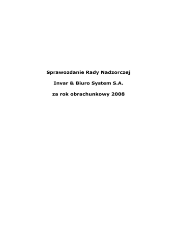 Sprawozdanie Rady Nadzorczej Invar & Biuro System S.A. za rok obrachunkowy 2008 Invar&Biuro System S.A. – sprawozdanie Rady Nadzorczej za rok obrachunkowy 2008 Niniejsze sprawozdanie Rady Nadzorczej obejmuje: I. Ocenę sprawozdania Zarządu z działalności Spółki oraz sprawozdania finansowego Invar & Biuro System S.A. za rok obrachunkowy 2008. II. Ocenę wniosku Zarządu w prawie pokrycia straty za rok obrachunkowy 2008. III. Ocenę sprawozdania Zarządu z działalności Grupy Kapitałowej oraz skonsolidowanego sprawozdania finansowego Grupy Kapitałowej Invar & Biuro System S.A. za rok obrachunkowy 2008. IV. Opis działalność Rady Nadzorczej w roku obrachunkowym 2008. V. Opinię w sprawie projektów uchwał na ZWZ zwołane na dzień 29 czerwca 2009 r. 2 Invar&Biuro System S.A. – sprawozdanie Rady Nadzorczej za rok obrachunkowy 2008 I. Ocena sprawozdania zarządu z działalności Spółki oraz sprawozdania finansowego Invar & Biuro System S.A. za rok obrachunkowy 2008. Zgodnie z art. 382 § 3 Kodeksu spółek handlowych Rada Nadzorcza dokonała oceny sprawozdania zarządu z działalności Spółki oraz sprawozdania finansowego Invar & Biuro System S.A. za rok obrachunkowy 2008. Oceny sprawozdań dokonano w oparciu o opinię i raport audytora, wyjaśnienia Zarządu oraz ocenę własną przedstawionych dokumentów. Badanie sprawozdania finansowego zostało wykonane przez biegłego rewidenta Andrzeja Kuligiewicza (nr ewid. 2043/960) reprezentującego spółkę K.R. Audyt Spółka z o.o. Sprawozdanie finansowe obejmowało: • wprowadzenie do sprawozdania finansowego, • bilans sporządzony na dzień 31 grudnia 2008 roku, który po stronie aktywów i pasywów wykazuje sumę 69.636.320,34 zł, • rachunek zysków i strat za okres od 1 stycznia 2008 roku do 31 grudnia 2008 roku wykazujący stratę netto w kwocie -3.910.290,90 zł., • zestawienie zmian w kapitale własnym za rok obrotowy od 1 stycznia 2008 roku do 31 grudnia 2008 roku wykazujące zwiększenie kapitału własnego o kwotę 30.649.260,10 zł., • sprawozdanie z przepływu środków pienięŜnych za okres od 1 stycznia 2008 roku do 31 grudnia 2008 roku wykazujące zmniejszenie stanu środków pienięŜnych netto w ciągu roku obrotowego w kwocie 5.292.819,30 zł., • W dodatkowe informacje i objaśnienia. opinii audytora, załączone sprawozdanie finansowe Spółki I&B SYSTEM S.A. obejmujące dane liczbowe i objaśnienia słowne: 3 Invar&Biuro System S.A. – sprawozdanie Rady Nadzorczej za rok obrachunkowy 2008 • przedstawia rzetelnie i jasno wszystkie informacje istotne dla oceny sytuacji majątkowej i finansowej na dzień 31 grudnia 2008r., jak teŜ jej wyniku finansowego za rok obrotowy od 1 stycznia 2008 roku do 31 grudnia 2008roku, • sporządzone zostało, we wszystkich istotnych aspektach prawidłowo, to jest zgodnie z zasadami(polityką) rachunkowości, wynikającymi z Międzynarodowych Standardów Rachunkowości, Międzynarodowych Standardów Sprawozdawczości Finansowej oraz związanych z nimi interpretacji ogłoszonych w formie rozporządzeń Komisji Europejskiej, a w zakresie nieuregulowanym w tych Standardach – stosownie do wymogów ustawy o rachunkowości i wydanych na jej podstawie przepisów wykonawczych oraz określonymi w powyŜszej ustawie zasadami rachunkowości oraz na podstawie prawidłowo prowadzonych ksiąg rachunkowych, • jest zgodne z wpływającymi na treść sprawozdania finansowego przepisami prawa i postanowieniami statutu spółki. Sprawozdanie z działalności spółki jest kompletne w rozumieniu art. 49 ust.2 ustawy o rachunkowości, a zawarte w nim informacje pochodzące ze zbadanego sprawozdania finansowego, są z nimi zgodne. Na podstawie przedłoŜonych dokumentów oraz uzyskanych wyjaśnień Rada Nadzorcza stwierdza, Ŝe sprawozdanie Zarządu z działalności Spółki oraz sprawozdanie finansowe za rok obrotowy 2008 są zgodne z księgami i dokumentami jak i ze stanem faktycznym. II. Ocena wniosku Zarządu w sprawie pokrycia straty za rok obrachunkowy 2008. Rada Nadzorcza otrzymała wniosek Zarządu o pokryciu straty netto za 2008 rok w wysokości 3.910.290,90 zł z zysków przyszłych okresów. Rada Nadzorcza nie wnosi uwag do przedstawionego wniosku i zgodnie z art. 395 § 2 pkt. 2 Kodeksu spółek handlowych przedkłada powyŜszy wniosek ocenie Zwyczajnego Walnego Zgromadzenia. III. Ocena sprawozdania zarządu z działalności Grupy Kapitałowej oraz skonsolidowanego sprawozdania finansowego Grupy Kapitałowej Invar & Biuro System S.A. za rok obrachunkowy 2008. Zgodnie z art. 382 § 3 Kodeksu spółek handlowych Rada Nadzorcza dokonała oceny sprawozdania zarządu z działalności Grupy Kapitałowej oraz skonsolidowanego 4 Invar&Biuro System S.A. – sprawozdanie Rady Nadzorczej za rok obrachunkowy 2008 sprawozdania finansowego Grupy Kapitałowej, której jednostką dominującą jest Invar & Biuro System S.A. za rok obrachunkowy 2008. Oceny sprawozdań dokonano w oparciu o opinię i raport audytora, wyjaśnienia Zarządu oraz ocenę własną przedstawionych dokumentów. Badanie sprawozdania finansowego zostało wykonane przez biegłego rewidenta Andrzeja Kuligiewicza (nr ewid. 2043/960) reprezentującego spółkę K.R. Audyt Spółka z o.o. Sprawozdanie finansowe obejmowało: • wprowadzenie do skonsolidowanego sprawozdania finansowego, • skonsolidowany bilans sporządzony na dzień 31 grudnia 2008 roku, który po stronie aktywów i pasywów wykazuje sumę 85.507.813,73 zł, • skonsolidowany rachunek zysków i strat za rok obrotowy od 1 stycznia 2008 roku do 31 grudnia 2008 roku wykazujący zysk netto w kwocie 11.653.467,10 zł., • zestawienie zmian w skonsolidowanym kapitale własnym za rok obrotowy od 1 stycznia 2008 roku do 31 grudnia 2008 roku wykazujące zwiększenie kapitału własnego o kwotę 41.525.487,92 zł., • skonsolidowane sprawozdanie z przepływu środków pienięŜnych za okres od 1 stycznia 2008 roku do 31 grudnia 2008 roku wykazujące zmniej