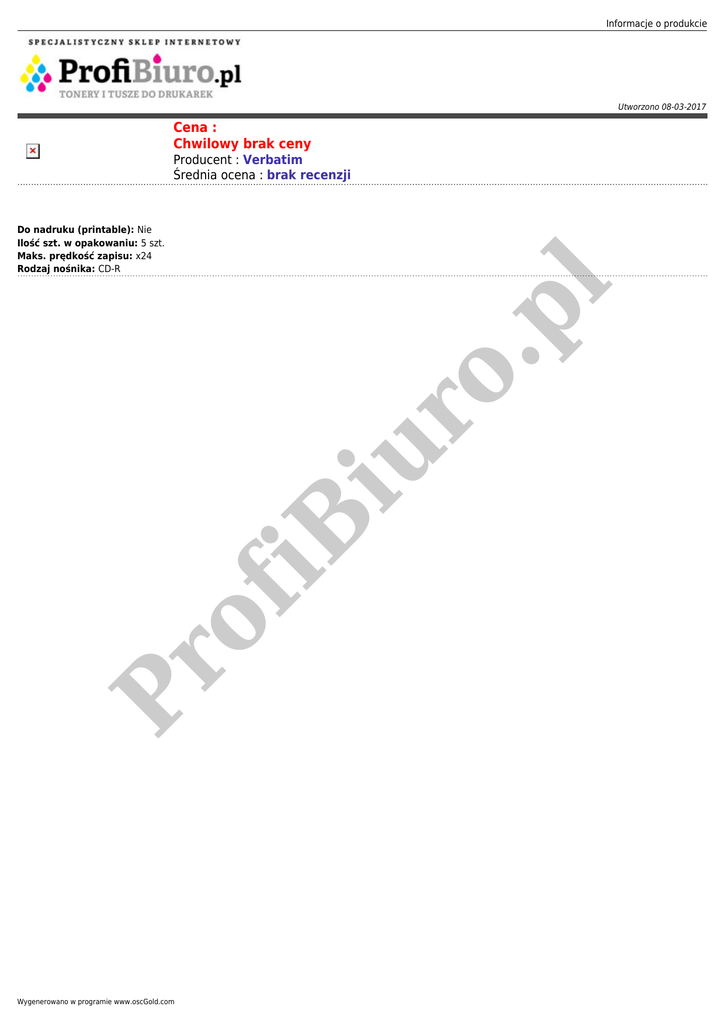 Informacje o produkcie Utworzono 08-03-2017 Cena : Chwilowy brak ceny Producent : Verbatim Średnia ocena : brak recenzji Pr of iB iu r o. pl Do nadruku (printable): Nie Ilość szt. w opakowaniu: 5 szt. Maks. prędkość zapisu: x24 Rodzaj nośnika: CD-R Wygenerowano w programie www.oscGold.com