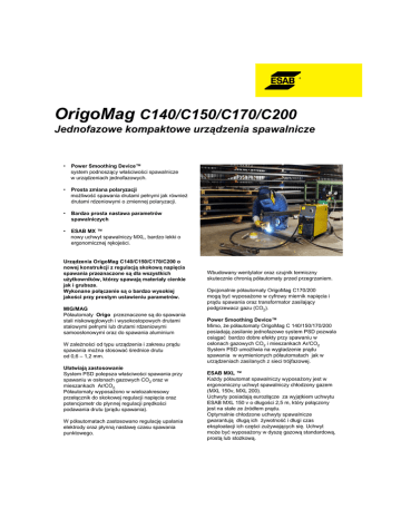 OrigoMag C140/C150/C170/C200 Jednofazowe kompaktowe urządzenia spawalnicze • Power Smoothing Device™ system podnoszący właściwości spawalnicze w urządzeniach jednofazowych. • Prosta zmiana polaryzacji możliwość spawania drutami pełnymi jak również drutami rdzeniowymi o zmiennej polaryzacji. • Bardzo prosta nastawa parametrów spawalniczych • ESAB MX ™ nowy uchwyt spawalniczy MXL, bardzo lekki o ergonomicznej rękojeści. Urządzenia OrigoMag C140/C150/C170/C200 o nowej konstrukcji z regulacją skokową napięcia spawania przeznaczone są dla wszystkich użytkowników, którzy spawają materiały cienkie jak i grubsze. Wykonane połączenie są o bardzo wysokiej jakości przy prostym ustawieniu parametrów. MIG/MAG Półautomaty Origo przeznaczone są do spawania stali niskowęglowych i wysokostopowych drutami stalowymi pełnymi lub drutami rdzeniowymi samoosłonowymi oraz do spawania aluminium W zależności od typu urządzenia i zakresu prądu spawania można stosować średnice drutu od 0,6 – 1,2 mm. Ułatwiają zastosowanie System PSD polepsza właściwości spawania przy spawaniu w osłonach gazowych CO2 oraz w mieszankach Ar/CO2. Półautomaty wyposażono w wielozakresowy przełącznik do skokowej regulacji napięcia oraz potencjometr do płynnej regulacji prędkości podawania drutu (prądu spawania). W półautomatach zastosowano regulację upalania elektrody oraz płynną nastawę czasu spawania punktowego. Wbudowany wentylator oraz czujnik termiczny skutecznie chronią półautomaty przed przegrzaniem. Opcjonalnie półautomaty OrigoMag C170/200 mogą być wyposażone w cyfrowy miernik napięcia i prądu spawania oraz transformator zasilający podgrzewacz gazu (CO2). Power Smoothing Device™ Mimo, że półautomaty OrigoMag C 140/150/170/200 posiadają zasilanie jednofazowe system PSD pozwala osiągać bardzo dobre efekty przy spawaniu w osłonach gazowych CO2 i mieszankach Ar/CO2 System PSD umożliwia na wygładzenie prądu spawania w wymienionych półautomatach jak w urządzeniach zasilanych z sieci trójfazowej. ESAB MXL ™ Każdy półautomat spawalniczy wyposażony jest w ergonomiczny uchwyt spawalniczy chłodzony gazem (MXL 150v, MXL 200). Uchwyty posiadają eurozłącze za wyjątkiem uchwytu ESAB MXL 150 v o długości 2,5 m, który połączony jest na stałe ze źródłem prądu. Optymalnie chłodzone uchwyty spawalnicze gwarantują długą ich żywotność i długi czas eksploatacji ich części zużywających się. Uchwyt może być wyposażony w dyszę gazową standardową, prostą lub stożkową. Dane techniczne OrigoMag C140 Napięcie zasilania Zabezpieczenie sieci Cykl pracy: 20% 30% 60% 100% Zakres prądu spawania Zakres napięcia spawania Prędkość podawania spoiwa OrigoMag C170 OrigoMig C200 230V 50/60 Hz 10 A 230V 50/60 Hz 10 A 230V 50/60Hz 16 A 100 A 150 A 122 A 86 A 67 A 35 – 150 A 18,5 - 30,5 V 1,0 – 14 m/min 170 A 139 A 98 A 76 A 30 – 170 A 19,5 - 35,5 V 1,0 – 17 m/mi 200 A 163 A 115 A 90 A 30 - 200 A 17,5 – 36,5 V 1,0 – 17 m/min 0,6 - 0,8 mm 0,9 mm - 0,6 - 0,8 mm 0,9 mm 1,0 mm 0,02 - 0,25 s 0,6 - 1,0 mm 0,9 - 1,0 mm 1,0 mm 0,02 - 0,25 s 54 A 42 A 35 – 130 A 20 – 28 V 2,0 – 14 m/min Średnica spoiwa Stalowego Rdzeniowego Aluminiowego Czas spawania punktowego Ilość stopni regulacji napięcia Wymiary (dł,szer,wys) mm Waga Stopień ochrony OrigoMag C150 0,6 – 0,8 mm 0,9 mm 4 650 x 300 x 550 25,0 kg IP 23 7 650 x 300 x 550 37,5 kg IP 23 230V 50/60Hz 16 A 8 860x 420 x 730 59 kg IP 23 12 860 x 420 x 730 68 kg IP 23 Dane do zamówienia: Wyposażenie dodatkowe Średnica Ø mm 0.6 / 0.8 Rodzaj drutu 1 Rolka robocza OrigoMag C140 (230V OrigoMag C150 (230V OrigoMag C170 (230V OrigoMag C200 (230V OrigoMag C140/150 3 2 Prowadnik Rolka dociskowa 4 Tulejka wewnę. 5 Tulejka zewnę. 469517880 komplet Fe, Ss, Rd 469517001 Ss = drut nierdzewny Rd = drut rdzeniowy Typ rolki Rodzaj drutu 1 Rolka robocza 2 3 Rolka Prowadnik dociskowa 4 Tulejka wewnę. 0349 306 220 0349 306 532 0349 305 236 0349 306 560 Cyfrowy miernik V/A dla C170/C200 Transformator do podgrzewacza gazu 0349 302 598 0349 302 250 V Wyposażenie dodatkowe OrigoMag C170/C200 Średnica Ø mm 50/60 Hz) 50/60 Hz) 50/60 Hz) 50/60 Hz) 5 Tulejka zewnę. Typ rolki 0.6 / 0.8 Fe, Ss, Rd 367556001 455889001 455886001 0.8 / 1.0 Fe, Ss, Rd 367556002 455907001 466074001 1.0 / 1.2 Fe, Ss, Rd 367556003 1.0 / 1.2 Al 367556004 455894001 455885001 V Dostawa zawiera: OrigoMag C140/150 z rolkami dla drutu 0,6-0,8 mm, uchwyt spawalniczy MXL 150 2,5 m (z końcówką prądową 0,8 mm) OrigoMag C170/200 z rolkami dla drutu 0,6-0,8 mm, uchwyt spawalniczy MXL 200 3,0 m (z końcówką prądową 0,8 mm) Połautomaty wyposażone są w; w kabel zasilający (3m) z wtyczką, kabel prądowy (3m) z zaciskiem prądowym, wąż gazowy (3m OrgoMag C140/150), wąż gazowy (1,5m), półkę i łańcuch do zamontowania butli gazowej oraz instrukcje obsługi. U Ss = druy nierdzewny Rd = drut rdzeniowy Al. = drut aluminiowy Biuro handlowe ESAB: ul. Chorzowska 108 40 – 101 Katowice Tel. +48 32 3511100 Fax. +48 323511120 [email protected] www.esab.pl Firma: Adres: ESAB Sp. Z o.o. Regon: 271977650 NIP: 634-00-23-457 ul. Żelazna 9 40 – 952 Katowice Polska