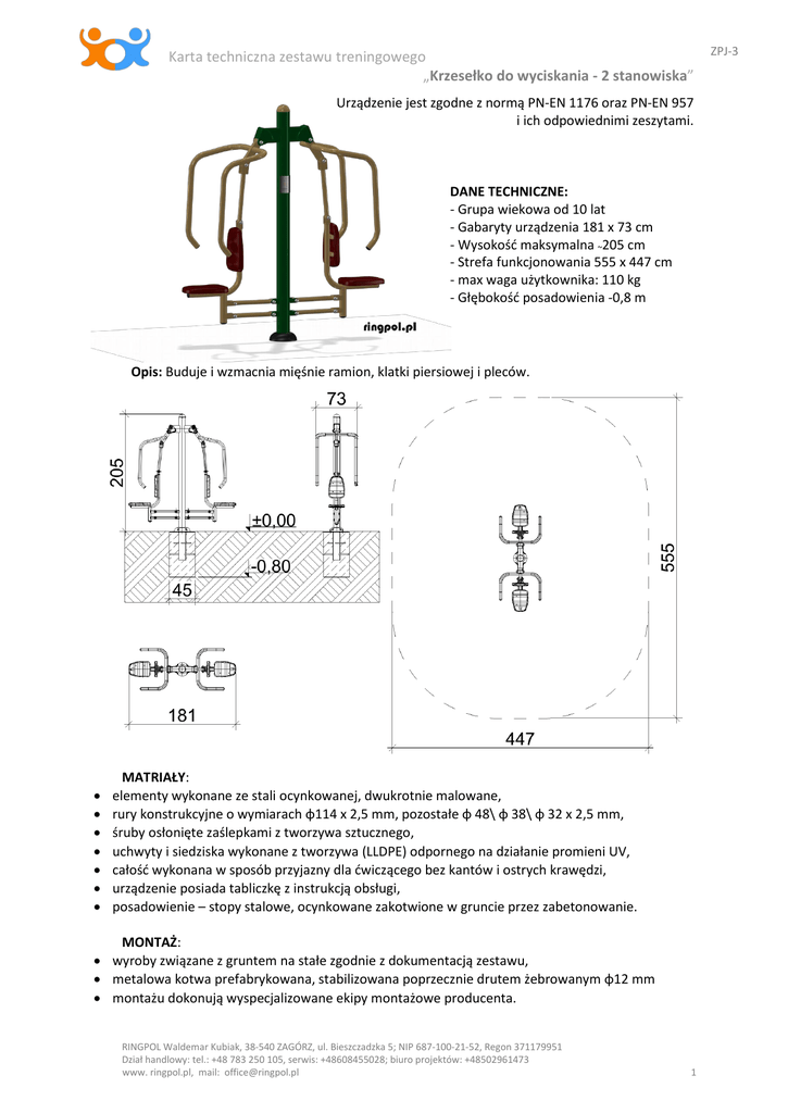 Karta techniczna zestawu treningowego „Krzesełko do wyciskania - 2 stanowiska” Urządzenie jest zgodne z normą PN-EN 1176 oraz PN-EN 957 i ich odpowiednimi zeszytami. DANE TECHNICZNE: - Grupa wiekowa od 10 lat - Gabaryty urządzenia 181 x 73 cm - Wysokość maksymalna ~205 cm - Strefa funkcjonowania 555 x 447 cm - max waga użytkownika: 110 kg - Głębokość posadowienia -0,8 m Opis: Buduje i wzmacnia mięśnie ramion, klatki piersiowej i pleców. MATRIAŁY: elementy wykonane ze stali ocynkowanej, dwukrotnie malowane, rury konstrukcyjne o wymiarach φ114 x 2,5 mm, pozostałe φ 48\ φ 38\ φ 32 x 2,5 mm, śruby osłonięte zaślepkami z tworzywa sztucznego, uchwyty i siedziska wykonane z tworzywa (LLDPE) odpornego na działanie promieni UV, całość wykonana w sposób przyjazny dla ćwiczącego bez kantów i ostrych krawędzi, urządzenie posiada tabliczkę z instrukcją obsługi, posadowienie – stopy stalowe, ocynkowane zakotwione w gruncie przez zabetonowanie. MONTAŻ: wyroby związane z gruntem na stałe zgodnie z dokumentacją zestawu, metalowa kotwa prefabrykowana, stabilizowana poprzecznie drutem żebrowanym φ12 mm montażu dokonują wyspecjalizowane ekipy montażowe producenta. RINGPOL Waldemar Kubiak, 38-540 ZAGÓRZ, ul. Bieszczadzka 5; NIP 687-100-21-52, Regon 371179951 Dział handlowy: tel.: +48 783 250 105, serwis: +48608455028; biuro projektów: +48502961473 www. ringpol.pl, mail: [email protected] 1 ZPJ-3