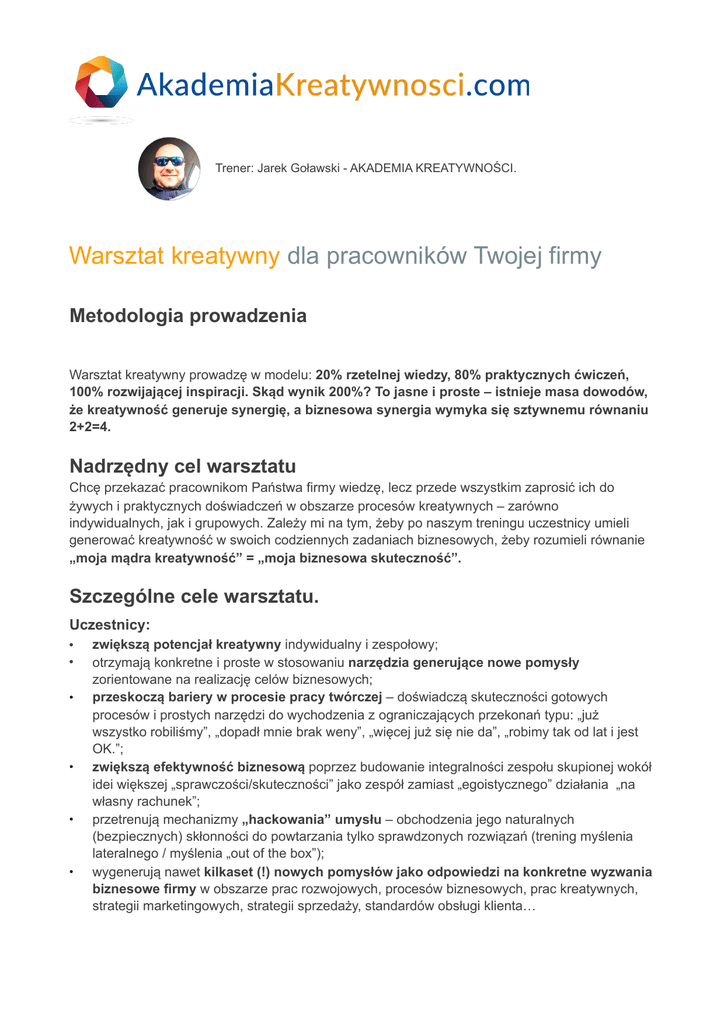 Trener: Jarek Goławski - AKADEMIA KREATYWNOŚCI. Warsztat kreatywny dla pracowników Twojej firmy Metodologia prowadzenia Warsztat kreatywny prowadzę w modelu: 20% rzetelnej wiedzy, 80% praktycznych ćwiczeń, 100% rozwijającej inspiracji. Skąd wynik 200%? To jasne i proste – istnieje masa dowodów, że kreatywność generuje synergię, a biznesowa synergia wymyka się sztywnemu równaniu 2+2=4. Nadrzędny cel warsztatu Chcę przekazać pracownikom Państwa firmy wiedzę, lecz przede wszystkim zaprosić ich do żywych i praktycznych doświadczeń w obszarze procesów kreatywnych – zarówno indywidualnych, jak i grupowych. Zależy mi na tym, żeby po naszym treningu uczestnicy umieli generować kreatywność w swoich codziennych zadaniach biznesowych, żeby rozumieli równanie „moja mądra kreatywność” = „moja biznesowa skuteczność”. Szczególne cele warsztatu. Uczestnicy: • • • • • • zwiększą potencjał kreatywny indywidualny i zespołowy; otrzymają konkretne i proste w stosowaniu narzędzia generujące nowe pomysły zorientowane na realizację celów biznesowych; przeskoczą bariery w procesie pracy twórczej – doświadczą skuteczności gotowych procesów i prostych narzędzi do wychodzenia z ograniczających przekonań typu: „już wszystko robiliśmy”, „dopadł mnie brak weny”, „więcej już się nie da”, „robimy tak od lat i jest OK.”; zwiększą efektywność biznesową poprzez budowanie integralności zespołu skupionej wokół idei większej „sprawczości/skuteczności” jako zespół zamiast „egoistycznego” działania „na własny rachunek”; przetrenują mechanizmy „hackowania” umysłu – obchodzenia jego naturalnych (bezpiecznych) skłonności do powtarzania tylko sprawdzonych rozwiązań (trening myślenia lateralnego / myślenia „out of the box”); wygenerują nawet kilkaset (!) nowych pomysłów jako odpowiedzi na konkretne wyzwania biznesowe firmy w obszarze prac rozwojowych, procesów biznesowych, prac kreatywnych, strategii marketingowych, strategii sprzedaży, standardów obsługi klienta… Metodologia skoncentrowana na efekcie Trenowane przez uczestników narzędzia podaję w formie, która umożliwia łatwo i skutecznie przekazać je dalej pracownikom, którzy nie uczestniczyli w warsztacie (nowo zatrudniani, nieobecni itp.). Warsztat biegnie żywym i elastycznym procesem grupowym, tak aby twórczo zaangażować jak największą liczbę uczestników oraz uruchomić (odblokować) potencjał kreatywny osób, które z różnych względów (ograniczające przekonania na temat firmy, usługi, samego siebie itp.) mogą własny potencjał blokować. W trakcie szkolenia „implementuję” uczestnikom także inne umiejętności współpracy grupowej, które w codziennej pracy zwiększają skuteczność biznesową całej firmy - rozpoznawanie roli w zespole, umiejętność „wspierającego” przekazywania uwag do działań innych ludzi, umiejętność skutecznej prezentacji swoich pomysłów na szerszym forum... Warsztat buduję z ciągu ćwiczeń, które generują konkretne pomysły kreatywne. Przeplatam je podaniem rzetelnej wiedzy teoretycznej oraz przerywnikami w postaci inspirujących filmów z case’ami i przykładami reklam różnych firm. Szkolenie kończymy rzęsistymi oklaskami towarzyszącymi wręczaniu każdemu uczestnikowi imiennego certyfikatu „Kreatywny w pracy zespołowej i indywidualnej”. Szczegółowy plan szkolenia (jeden dzień): 9.00 – 17.00 (w tym 4 przerwy kawowe + przerwa na lunch od 12.00 do 13.00) - Przedstawienie celu i agenda szkolenia. - Wyzwania firmy na szkolenie. - Przykład case’u (film). - Wspólne formułowanie celów szczegółowych na szkolenie. - Przykład case’u (film). - Krótkie wprowadzenie do procesów kreatywnych (nowa wiedza). - Fundamenty myślenia twórczego. - Ćwiczenia kreatywne (rozgrzewka) - technika od prowokacji do rozwiązania: „Co by było, gdyby....” - Przykład case’u (film). - Myślenie lateralne wraz z przykładami. - Ćwiczenia kreatywne (rozgrzewka) – technika wymuszonych skojarzeń. - Przykład case’u (film). - Techniki wymuszonych skojarzeń. - Ćwiczenia kreatywne techniką Birkenbihl. - Przykład case’u (film). - Techniki klastrowe. - Ćwiczenia kreatywne techniką klastra. - Przykład case’u (film). - Proces odblokowania twórczego - opis procesu, narzędzia. - Techniki wymuszonych skojarzeń c.d. - piramida skojarzeń. - Ćwiczenia kreatywne techniką piramidy. - Przykład case’u (film). - Dlaczego w różnorodności jest siła - synergia grupy, a kreatywność. - Wzorce przywództwa (ról) w grupie wg Satir. Rozpoznawanie własnego wzorca zachowań w zespole. - Przykład case’u (film). - Techniki wymuszonych skojarzeń w pracy zespołowej. - Proces kreatywnej pracy grupowej: Generowanie nowych punktów widzenia problemu. Przełamywanie syndromu „Wszystko już było”. - Przykład case’u (film). - Ćwiczenie kreatywne brainstorming grupowy - narzędzie „Pass the Buck”. - Wspierająca recenzja - jak przekazywać uwagi i krytykę by inspirować i osiągać cele. Prezentacje pomysłów w grupach wyników „Pass The Buck”. - Przykład case’u (film). - Techniki lepszego zapamiętywania i organizacji wiedzy - mindmapa (będzie używana do notowania przy każdym ćwiczeniu brainstormingowym). - Przykład case’u (film). - Brainstorming Osborna - najczęstsze błędy, a model skuteczny. - Technika brainstormingu Walta Disneya. - Technika Brainwriting 635. Warsztat brainwritingowy (grupowy) 635 (duży). - Przykład case’u (film). - Jak skutecznie „sprzedać” innym nasz pomysł - poziomy logiczne Diltsa. Tworzenie prezentacji pomysłów wg modelu poziomów logicznych. Prezentacje pomysłów w grupach. - Przykład case’u (film). - Podsumowanie warsztatu. UWAGA! Każdy z uczestników otrzyma wydrukowane materiały szkoleniowe z pełnym programem szkoleniowym oraz opisami wszystkich narzędzi kreatywn