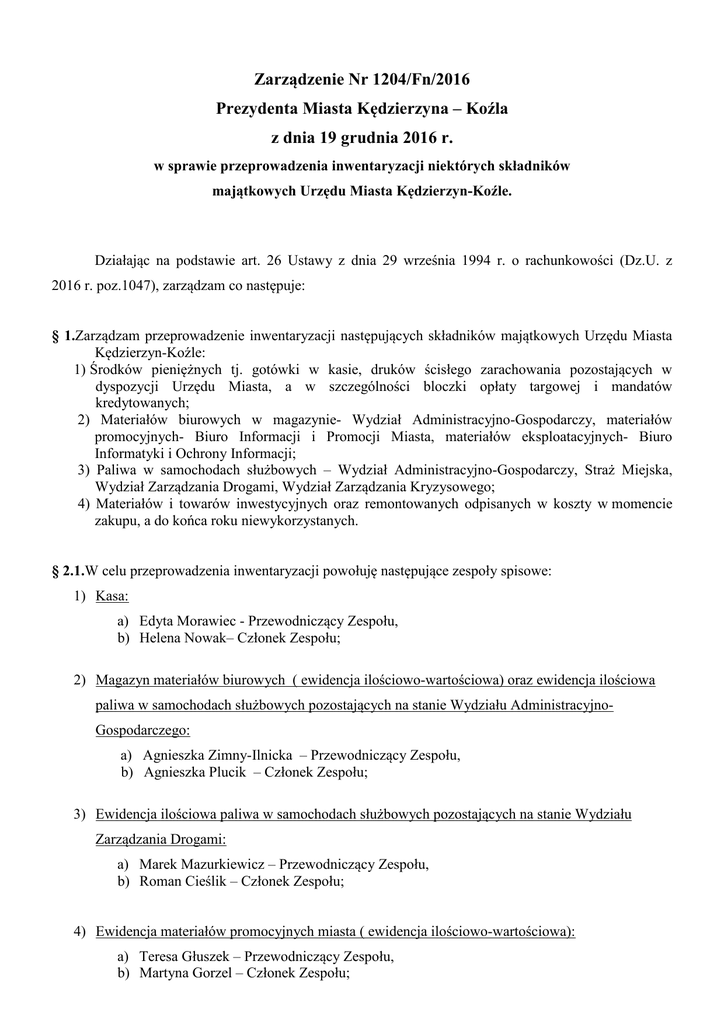 -WZÓR- Zarządzenie Nr 1204/Fn/2016 Prezydenta Miasta Kędzierzyna – Koźla z dnia 19 grudnia 2016 r. w sprawie przeprowadzenia inwentaryzacji niektórych składników majątkowych Urzędu Miasta Kędzierzyn-Koźle. Działając na podstawie art. 26 Ustawy z dnia 29 września 1994 r. o rachunkowości (Dz.U. z 2016 r. poz.1047), zarządzam co następuje: § 1.Zarządzam przeprowadzenie inwentaryzacji następujących składników majątkowych Urzędu Miasta Kędzierzyn-Koźle: 1) Środków pieniężnych tj. gotówki w kasie, druków ścisłego zarachowania pozostających w dyspozycji Urzędu Miasta, a w szczególności bloczki opłaty targowej i mandatów kredytowanych; 2) Materiałów biurowych w magazynie- Wydział Administracyjno-Gospodarczy, materiałów promocyjnych- Biuro Informacji i Promocji Miasta, materiałów eksploatacyjnych- Biuro Informatyki i Ochrony Informacji; 3) Paliwa w samochodach służbowych – Wydział Administracyjno-Gospodarczy, Straż Miejska, Wydział Zarządzania Drogami, Wydział Zarządzania Kryzysowego; 4) Materiałów i towarów inwestycyjnych oraz remontowanych odpisanych w koszty w momencie zakupu, a do końca roku niewykorzystanych. § 2.1.W celu przeprowadzenia inwentaryzacji powołuję następujące zespoły spisowe: 1) Kasa: a) Edyta Morawiec - Przewodniczący Zespołu, b) Helena Nowak– Członek Zespołu; 2) Magazyn materiałów biurowych ( ewidencja ilościowo-wartościowa) oraz ewidencja ilościowa paliwa w samochodach służbowych pozostających na stanie Wydziału AdministracyjnoGospodarczego: a) Agnieszka Zimny-Ilnicka – Przewodniczący Zespołu, b) Agnieszka Plucik – Członek Zespołu; 3) Ewidencja ilościowa paliwa w samochodach służbowych pozostających na stanie Wydziału Zarządzania Drogami: a) Marek Mazurkiewicz – Przewodniczący Zespołu, b) Roman Cieślik – Członek Zespołu; 4) Ewidencja materiałów promocyjnych miasta ( ewidencja ilościowo-wartościowa): a) Teresa Głuszek – Przewodniczący Zespołu, b) Martyna Gorzel – Członek Zespołu; 5) Ewidencja ilościowa paliwa w samochodach służbowych pozostających na stanie Straży Miejskiej: a) Jarosław Ostrycharz – Przewodniczący Zespołu, b) Sylwia Jasińska - Członek Zespołu; 6) Ewidencja ilościowo-wartościowa materiałów eksploatacyjnych: a) Izabela Krauze – Przewodniczący Zespołu, b) Artur Niedbalski – Członek Zespołu; 7) Ewidencja ilościowa paliwa w samochodach służbowych pozostających na stanie Wydziału Zarządzania Kryzysowego: a) Janusz Sieńczyk – Przewodniczący Zespołu, b) Zbigniew Kulej – Członek Zespołu. 2. Jako koordynatora pracy zespołów wyznaczam Pana Tadeusza Orlika Głównego KsięgowegoKierownika Referatu Obsługi Finansowej Urzędu Miasta. § 3. 1. Inwentaryzację należy przeprowadzić w dniu 30.12.2016r. 2. Osoby wchodzące w skład zespołów spisowych wskazanych w § 2 ponoszą pełną odpowiedzialność za właściwe oraz zgodne z obowiązującymi przepisami przeprowadzenie spisu z natury. 3. Protokół rozliczeń wyników inwentaryzacji należy przekazać do Wydziału Finansowego Referatu Obsługi Finansowej w terminie do 13 stycznia 2017r. §4. Wykonanie zarządzenia powierza się Głównemu Księgowemu Urzędu Miasta, który złoży informację o realizacji niniejszego zarządzenia. § 5. Zarządzenie wchodzi w życie z dniem wydania. PREZYDENT MIASTA KĘDZIERZYN-KOŹLE Sabina Nowosielska (-) Odpowiedzialny za sporządzenie informacji: Główny Księgowy Kierownik Referatu Obsługi Finansowej Urzędu Miasta Kędzierzyn-Koźle Tadeusz Orlik (-) Kędzierzyn-Koźle dn. 19 grudnia 2016r.