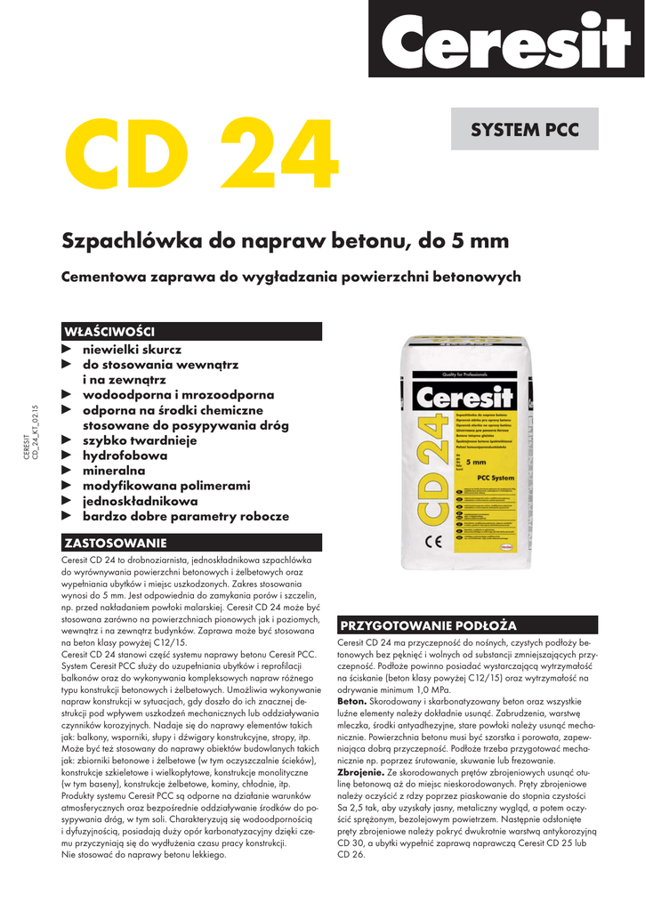 CD 24 SYSTEM PCC Szpachlówka do napraw betonu, do 5 mm CERESIT CD_24_KT_02.15 Cementowa zaprawa do wygładzania powierzchni betonowych WŁAŚCIWOŚCI niewielki skurcz do stosowania wewnątrz i na zewnątrz wodoodporna i mrozoodporna odporna na środki chemiczne stosowane do posypywania dróg szybko twardnieje hydrofobowa mineralna modyfikowana polimerami jednoskładnikowa bardzo dobre parametry robocze ZASTOSOWANIE Ceresit CD 24 to drobnoziarnista, jednoskładnikowa szpachlówka do wyrównywania powierzchni betonowych i żelbetowych oraz wypełniania ubytków i miejsc uszkodzonych. Zakres stosowania wynosi do 5 mm. Jest odpowiednia do zamykania porów i szczelin, np. przed nakładaniem powłoki malarskiej. Ceresit CD 24 może być stosowana zarówno na powierzchniach pionowych jak i poziomych, wewnątrz i na zewnątrz budynków. Zaprawa może być stosowana na beton klasy powyżej C12/15. Ceresit CD 24 stanowi część systemu naprawy betonu Ceresit PCC. System Ceresit PCC służy do uzupełniania ubytków i reprofilacji balkonów oraz do wykonywania kompleksowych napraw różnego typu konstrukcji betonowych i żelbetowych. Umożliwia wykonywanie napraw konstrukcji w sytuacjach, gdy doszło do ich znacznej destrukcji pod wpływem uszkodzeń mechanicznych lub oddziaływania czynników korozyjnych. Nadaje się do naprawy elementów takich jak: balkony, wsporniki, słupy i dźwigary konstrukcyjne, stropy, itp. Może być też stosowany do naprawy obiektów budowlanych takich jak: zbiorniki betonowe i żelbetowe (w tym oczyszczalnie ścieków), konstrukcje szkieletowe i wielkopłytowe, konstrukcje monolityczne (w tym baseny), konstrukcje żelbetowe, kominy, chłodnie, itp. Produkty systemu Ceresit PCC są odporne na działanie warunków atmosferycznych oraz bezpośrednie oddziaływanie środków do posypywania dróg, w tym soli. Charakteryzują się wodoodpornością i dyfuzyjnością, posiadają duży opór karbonatyzacyjny dzięki czemu przyczyniają się do wydłużenia czasu pracy konstrukcji. Nie stosować do naprawy betonu lekkiego. PRZYGOTOWANIE PODŁOŻA Ceresit CD 24 ma przyczepność do nośnych, czystych podłoży betonowych bez pęknięć i wolnych od substancji zmniejszających przyczepność. Podłoże powinno posiadać wystarczającą wytrzymałość na ściskanie (beton klasy powyżej C12/15) oraz wytrzymałość na odrywanie minimum 1,0 MPa. Beton. Skorodowany i skarbonatyzowany beton oraz wszystkie luźne elementy należy dokładnie usunąć. Zabrudzenia, warstwę mleczka, środki antyadhezyjne, stare powłoki należy usunąć mechanicznie. Powierzchnia betonu musi być szorstka i porowata, zapewniająca dobrą przyczepność. Podłoże trzeba przygotować mechanicznie np. poprzez śrutowanie, skuwanie lub frezowanie. Zbrojenie. Ze skorodowanych prętów zbrojeniowych usunąć otulinę betonową aż do miejsc nieskorodowanych. Pręty zbrojeniowe należy oczyścić z rdzy poprzez piaskowanie do stopnia czystości Sa 2,5 tak, aby uzyskały jasny, metaliczny wygląd, a potem oczyścić sprężonym, bezolejowym powietrzem. Następnie odsłonięte pręty zbrojeniowe należy pokryć dwukrotnie warstwą antykorozyjną CD 30, a ubytki wypełnić zaprawą naprawczą Ceresit CD 25 lub CD 26. WYKONANIE Przygotowanie zaprawy. Zawartość opakowania wsypywać do odmierzonej ilości czystej wody i mieszać za pomocą wolnoobrotowej wiertarki z mieszadłem, aż do uzyskania jednolitej masy bez grudek. Odczekać 3 minuty i ponownie przemieszać zaprawę. Aplikacja zaprawy. Przed upływem czasu zużycia, gotową zaprawę należy nałożyć pacą na wilgotne podłoże lub w przypadku szpachlowania betonu, na świeżą warstwę kontaktową z zaprawy Ceresit CD 30, wygładzić lub ewentualnie nadać fakturę. Powierzchnię szpachlówki CD 24 zaraz po nałożeniu można wygładzić stalową pacą lub w ciągu 10–45 min zatrzeć pacą plastikową lub gąbką. W przypadku nakładania zaprawy w kilku warstwach odstęp czasu pomiędzy kolejnymi warstwami nie może przekroczyć 3 godzin. W przeciwnym wypadku należy odczekać 24 godz., podłoże zwilżyć wodą, nanieść warstwę kontaktową i dopiero nakładać szpachlówkę. Dodatkowe zabezpieczenie betonu. Dodatkowym zabezpieczeniem chroniącym beton przed korozją, szkodliwym działaniem wody, mrozu, środków odladzających i zanieczyszczeń atmosferycznych jest pokrycie szpachlówki CD 24 farbą akrylową CT 44 lub elastyczną powłoką izolacyjną CR 166. Powłoki te można aplikować po 3 dniach od nałożenia zaprawy CD 24. UWAGA Prace wykonywać w suchych warunkach, przy temperaturze powietrza i podłoża od +5°C do +30°C oraz przy wilgotności względnej powietrza poniżej 80%. Zaprawę chronić przed zbyt szybkim przesychaniem spowodowanym silnym nasłonecznieniem, przeciągami, itp. Do czasu całkowitego wyschnięcia, chronić zaprawę przed opadami deszczu. Zaleca się wtedy stosowanie osłon na rusztowaniach. Świeże zabrudzenia zaprawą myć wodą, a stwardniałe usuwać mechanicznie. Zaprawy nie mieszać z innymi dodatkami i nie pokrywać materiałami zawierającymi gips. CD 24 zawiera cement i zmieszana z wodą ma odczyn alkaliczny. Chronić skórę i oczy. Zabrudzenia dokładnie zmywać wodą. W przypadku kontaktu z oczami płukać je obficie wodą i zasięgnąć porady lekarza. Zawartość chromu VI – poniżej 2 ppm w okresie ważno-ści wyrobu. SKŁADOWANIE Do 12 miesięcy od daty produkcji, przy składowaniu na paletach, w suchych warunkach i w oryginalnych, nieuszkodzonych opakowaniach. OPAKOWANIA Worek 25 kg. DANE TECHNICZNE Baza: cement z wypełniaczami mineralnymi i wysokogatunkową, sproszkowaną żywicą Kolor: szary Uziarnienie: 0–0,5 mm Proporcje mieszania: ok. 5 l wody na 25 kg Temperatura stosowania: od +5°C do +30°C Czas wstępnego dojrzewania: ok. 3 min Czas zużycia: ok. 50 min Nakładanie kolejnej warstwy: –max. do 3 godzin dla kolejnych warstw zaprawy CD 24 –po około 3 dniach dla warstw ochronny