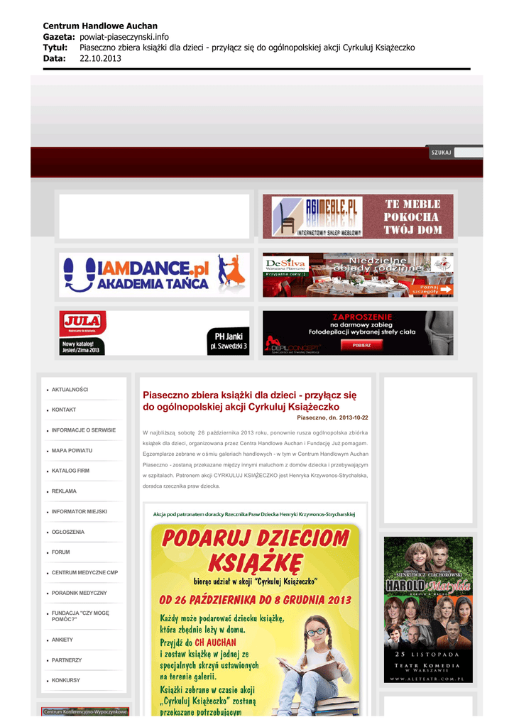 Centrum Handlowe Auchan Gazeta: powiatpiaseczynski.info Tytu³: Piaseczno zbiera ksi¹¿ki dla dzieci przy³¹cz siê do ogólnopolskiej akcji Cyrkuluj Ksi¹¿eczko Data: 22.10.2013 AKTUALNOŚCI KONTAKT Piaseczno zbiera książki dla dzieci - przyłącz się do ogólnopolskiej akcji Cyrkuluj Książeczko Piaseczno, dn. 2013-10-22 INFORMACJE O SERWISIE W najbliższą sobotę 2 6 p aździernika 2013 roku, ponownie rusza ogólnopolska zbiórka książek dla dzieci, organizowana przez Centra Handlowe Auchan i Fundację Już pomagam. MAPA POWIATU Egzemplarze zebrane w ośmiu galeriach handlowych - w tym w Centrum Handlowym Auchan Piaseczno - zostaną przekazane między innymi maluchom z domów dziecka i przebywającym KATALOG FIRM w szpitalach. Patronem akcji CYRKULUJ KSIĄŻECZKO jest Henryka Krzywonos-Strychalska, doradca rzecznika praw dziecka. REKLAMA INFORMATOR MIEJSKI OGŁOSZENIA FORUM CENTRUM MEDYCZNE CMP PORADNIK MEDYCZNY FUNDACJA "CZY MOGĘ POMÓC?" ANKIETY PARTNERZY KONKURSY Centrum Handlowe Auchan Gazeta: powiatpiaseczynski.info Tytu³: Piaseczno zbiera ksi¹¿ki dla dzieci przy³¹cz siê do ogólnopolskiej akcji Cyrkuluj Ksi¹¿eczko Data: 22.10.2013 Zapewnić maluchom radość i przenieść je do świata fantazji - to główny cel ogólnopolskiej akcji "Cyrkuluj, książeczko", czyli wielkiej zbiórki bajek, opowiadań, wierszyków oraz albumów dla najmłodszych. Od soboty 26 października w ośmiu Centrach Handlowych Auchan w Polsce staną specjalne pojemniki, w których każd y będzie mógł zostawić książki dla Wyszukiwarka ofert pracy najmłodszych i najbardziej potrzebujących czytelników. W tym roku do akcji przyłączyło się CH Auchan Piaseczno. - Książki mają magiczną moc. Potrafią bowiem przenieść m ałych czytelników w świat pełen przygód i radości. Często są one wręcz wybawieniem dla maluchów z domów dziecka czy tych, leżących w szpitalnych łóżkach. Dzięki akcji "Cyrkuluj, książeczko" przywracamy tym dzielnym szkrabom nadzieję, że każda historia może mieć dobre zakończenie" - mówi Kamila Węcłaś, menedżer CH Auchan Piaseczno. Zebrane podczas akcji książki przekazane zostaną również do publicznych bibliotek, dzięki czemu dzieci z uboższych rodzin będą miały łatwiejszy dostęp d o świata literatury. Zorganizowaną we współpracy z Fundacją "Już pomagam" akcję, objęła patronatem pani Henryka Krzywonos-Strycharska, doradca rzecznika praw dziecka. Akcja "Cyrkuluj, książeczko" to ogólnopolska zbiórka książek dla najbardziej potrzebujących maluchów. W zeszłym roku przyłączyło się do niej siedem Centrów Handlowych Auchan w całym kraju. W ciągu dwóch miesięcy gościom odwiedzającym galerie udało s ię zebrać b l i s k o 4 , 5 t y s iąca egzemplarzy. Wszystkie zostały przekazane wybranym oddziałom dziecięcym szpitali, opiekuńczym domom dziecka, pogotowiu opiekuńczemu i szkołom podstawowym, w tym szkołom specjalnym. Akcja "Cyrkuluj książeczko" potrwa od 26 października do 8 grudnia 2013 roku. Przez 6 tygodni w Centrum Handlowym Auchan w Piasecznie, będą stały specjalne pojemniki, do których można wrzucać książki dla dzieci. Justyna Kolczyńska Znajdź nas na Facebooku Powiat Piaseczyński twoja społeczność Lubię to! 1.750 osób lubi obiekt Powiat Piaseczyński - twoja społeczność. Centrum Handlowe Auchan Gazeta: powiatpiaseczynski.info Tytu³: Piaseczno zbiera ksi¹¿ki dla dzieci przy³¹cz siê do ogólnopolskiej akcji Cyrkuluj Ksi¹¿eczko Data: 22.10.2013 Redakcja 2013-10-21 18:29:41 Wątek na forum mieszkańców: GALERIA HANDLOWA AUCHAN PIASECZNO Dodaj swój komentarz Imię (pseudonim) Komentarz: 5 6 c zapoznałem się z zasadami zamieszczania komentarzy d e f g WYŚLIJ AKTUALNOŚCI KATALOG FIRM FORUM POWIATU Grawitacjanie Mistrzami Świata ID... Lombard Piaseczno Milka >> Galeria Handlowa Auchan Piasec... Piaseczno zbiera książki dla dzie... LOMBARD PIASECZNO PUŁAWSKA 20 >> Harmonogram odbioru odpadów na... Akcja Niechronieni Uczestnicy Ruc... Bilde Remonty i wykończenia wnętr... >> KS GRAWITACJA PIASECZNO Ostatnie rozdanie - Dyskusyjny Kl... Centrum Stomatologii DENTAL Spa J... >> PRZECIWDZIAŁAĆ PODTOPIENIOM >> Akcja Niechronieni Uczestnicy ... KONTAKT IMIĘ NAZWISKO MAIL AB OVO Teatr Improv - publiczność... Jak wspierać swoje dziecko w rozw... OGŁOSZENIA DROBNE >> KLUB KULTURY W JÓZEFOSŁAWIU Panama Przesmyk Darien - Klub Pod... Zespół z okolic Tarczyna szuka wokal... >> Ostrożnie w lasach wokół Podko... Wyprawa po skarb w wykonaniu Teat... Serwis Fitness Warszawa , Serwis Row... >> Komunikacja na terenie gminy K... Szukałeś Nas - Jesteśmy zaproszen... Zdjęcia Ślubne Warszawa i okolice >> Skradziono Twoje zdjęcie i co ... Kino plenerowe czy street workout... Profesjonalna rehabilitacja w domu p... >> A dzisiaj na talerzu... TREŚĆ Przepisz powyższe słowa: Strona korzysta z plików cookies w celu realizacji usług i zgodnie z Politykš Cookies. Możesz okre ć warunki li przechowywania lub dostępu do plików cookies w Twojej przeglšdarce. >> EDYTA GEPPERT W PIASECZNIE KONCERT EDYTY GEPPERT W PIASECZNI... WYŚLIJ Więcej informacji możn a z n a l e ć w naszej Polityce cookies. Rozumiem i zamknij te powiadomienie