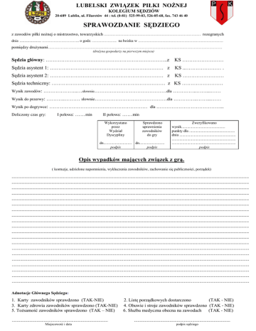 LUBELSKI ZWIĄZEK PIŁKI NOśNEJ KOLEGIUM SĘDZIÓW 20-609 Lublin, ul. Filaretów 44 : tel. (0-81) 525-99-03, 526-05-68, fax. 743 46 40 SPRAWOZDANIE SĘDZIEGO z zawodów piłki noŜnej o mistrzostwo, towarzyskich ………………………………………………………………… rozegranych dnia ...................... ……………………….. o godz. ………………. na boisku w ………………………………………………………… pomiędzy druŜynami……………………………………………………………………………………………………………………… (druŜyna gospodarzy na pierwszym miejscu) Sędzia główny: ……………………………………………………………..z KS …………………… Sędzia asystent 1: ………………………………………………………… z KS ..………………… . Sędzia asystent 2: ………………………………………………………… z KS …………………… Sędzia techniczny: ………………………………………………………… z KS …………………… Wynik zawodów: ………………..…słownie……………………………………dla …………..……...…… Wynik do przerwy: ………..……… słownie……………………………………dla …………..……...…… Wynik po dogrywce: Doliczony czas gry: ………………………………………………… dla .………………………………... I połowa: ……min II połowa: ……min Wykorzystano przez Wydział Dyscypliny Sprawdzono uprawnienia zawodników do gry dn............................. dn.......................... podpis podpis Zweryfikowano wynik............................................. punkty dla ............................................... dnia .......................................................... .................................................................. .................................................................. podpis Opis wypadków mających związek z grą. ( kontuzje, udzielone napomnienia, wykluczenia zawodników, zachowanie się publiczności, porządek) ........................................................................................................................................................................................ ........................................................................................................................................................................................ ........................................................................................................................................................................................ ........................................................................................................................................................................................ ........................................................................................................................................................................................ ........................................................................................................................................................................................ ........................................................................................................................................................................................ ........................................................................................................................................................................................ ........................................................................................................................................................................................ ........................................................................................................................................................................................ ........................................................................................................................................................................................ ........................................................................................................................................................................................ ........................................................................................................................................................................................ ........................................................................................................................................................................................................ ........................................................................................................................................................................................................ ........................................................................................................................................................................................................ ........................................................................................................................................................................................................ ........................................................................................................................................................................................................ ........................................................................................................................................................................................................ .................................................................................................................................................................................................