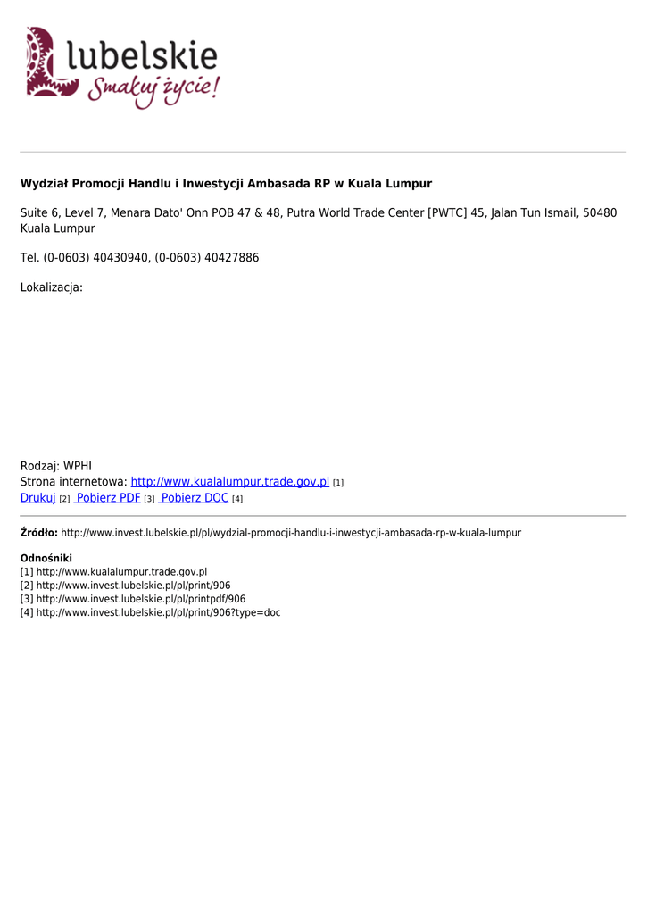 Wydział Promocji Handlu i Inwestycji Ambasada RP w Kuala Lumpur Suite 6, Level 7, Menara Dato' Onn POB 47 & 48, Putra World Trade Center [PWTC] 45, Jalan Tun Ismail, 50480 Kuala Lumpur Tel. (0-0603) 40430940, (0-0603) 40427886 Lokalizacja: Rodzaj: WPHI Strona internetowa: http://www.kualalumpur.trade.gov.pl [1] Drukuj [2] Pobierz PDF [3] Pobierz DOC [4] Źródło: http://www.invest.lubelskie.pl/pl/wydzial-promocji-handlu-i-inwestycji-ambasada-rp-w-kuala-lumpur Odnośniki [1] http://www.kualalumpur.trade.gov.pl [2] http://www.invest.lubelskie.pl/pl/print/906 [3] http://www.invest.lubelskie.pl/pl/printpdf/906 [4] http://www.invest.lubelskie.pl/pl/print/906?type=doc