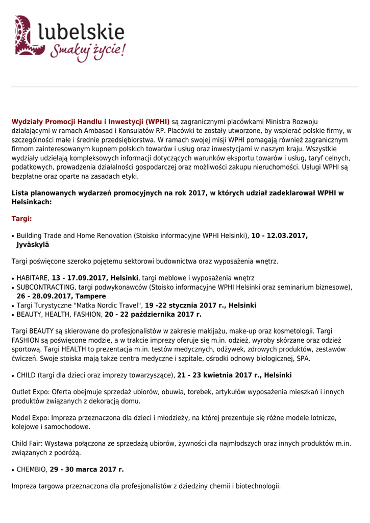 Wydziały Promocji Handlu i Inwestycji (WPHI) są zagranicznymi placówkami Ministra Rozwoju działającymi w ramach Ambasad i Konsulatów RP. Placówki te zostały utworzone, by wspierać polskie firmy, w szczególności małe i średnie przedsiębiorstwa. W ramach swojej misji WPHI pomagają również zagranicznym firmom zainteresowanym kupnem polskich towarów i usług oraz inwestycjami w naszym kraju. Wszystkie wydziały udzielają kompleksowych informacji dotyczących warunków eksportu towarów i usług, taryf celnych, podatkowych, prowadzenia działalności gospodarczej oraz możliwości zakupu nieruchomości. Usługi WPHI są bezpłatne oraz oparte na zasadach etyki. Lista planowanych wydarzeń promocyjnych na rok 2017, w których udział zadeklarował WPHI w Helsinkach: Targi: ● Building Trade and Home Renovation (Stoisko informacyjne WPHI Helsinki), 10 - 12.03.2017, Jyväskylä Targi poświęcone szeroko pojętemu sektorowi budownictwa oraz wyposażenia wnętrz. ● ● ● ● HABITARE, 13 - 17.09.2017, Helsinki, targi meblowe i wyposażenia wnętrz SUBCONTRACTING, targi podwykonawców (Stoisko informacyjne WPHI Helsinki oraz seminarium biznesowe), 26 - 28.09.2017, Tampere Targi Turystyczne "Matka Nordic Travel", 19 -22 stycznia 2017 r., Helsinki BEAUTY, HEALTH, FASHION, 20 - 22 października 2017 r. Targi BEAUTY są skierowane do profesjonalistów w zakresie makijażu, make-up oraz kosmetologii. Targi FASHION są poświęcone modzie, a w trakcie imprezy oferuje się m.in. odzież, wyroby skórzane oraz odzież sportową. Targi HEALTH to prezentacja m.in. testów medycznych, odżywek, zdrowych produktów, zestawów ćwiczeń. Swoje stoiska mają także centra medyczne i szpitale, ośrodki odnowy biologicznej, SPA. ● CHILD (targi dla dzieci oraz imprezy towarzyszące), 21 - 23 kwietnia 2017 r., Helsinki Outlet Expo: Oferta obejmuje sprzedaż ubiorów, obuwia, torebek, artykułów wyposażenia mieszkań i innych produktów związanych z dekoracją domu. Model Expo: Impreza przeznaczona dla dzieci i młodzieży, na której prezentuje się różne modele lotnicze, kolejowe i samochodowe. Child Fair: Wystawa połączona ze sprzedażą ubiorów, żywności dla najmłodszych oraz innych produktów m.in. związanych z podróżą. ● CHEMBIO, 29 - 30 marca 2017 r. Impreza targowa przeznaczona dla profesjonalistów z dziedziny chemii i biotechnologii. Wydarzenia: ● ● Helsinki International Boat Show, 10 - 19.02.2017, Helsinki, wystawa łodzi i jachtów Own Home, Own Cabin, SpringGarden, 6 - 9 kwietnia 2017 r., Helsinki Impreza obejmuje ekspozycję elementów i domów prefabrykowanych, rozwiązania w zakresie energii i gospodarki odpadami, farby, okna, artykuły gospodarstwa domowego i wyposażenie. Prezentowane są również usługi związane z budownictwem mieszkaniowym oraz wynajmem lokali. ● SLUSH, listopad/grudzień 2017 Największa impreza dla inwestorów i nowopowstających firm, start'upów, ciesząca się ogromnym powodzeniem. W trakcie imprezy są organizowane seminaria, pokazy mające za zadanie m.in. przyciągnięcie inwestorów oraz promocję przedsięwzięć start'upów. Podczas wymienionych wyżej wydarzeń istnieje możliwość skorzystania ze stoisk WPHI. Dodatkowa oferta WPHI: Na stoiskach WPHI z przyjemnością zaprezentujemy materiały informacyjne polskich firm w jęz. angielskim, a także udostępnimy miejsce do rozmów w przypadku przyjazdu przedstawicieli polskich przedsiębiorstw. W naszym biurze posiadamy małą salę z projektorem na użytek spotkań (ok. 20 osób), więc nie ma potrzeby odpłatnego wynajęcia sali w innej lokalizacji. Wydział Promocji Handlu i Inwestycji Ambasady RP w Helsinkach Risto Rytin tie 7 FIN-00570 Helsinki tel.: (00358 9) 686 0060 Lokalizacja: Rodzaj: WPHI Strona internetowa: http://www.helsinki.trade.gov.pl [1] Drukuj [2] Pobierz PDF [3] Pobierz DOC [4] Źródło: http://www.invest.lubelskie.pl/pl/wydzial-promocji-handlu-i-inwestycji-ambasady-rp-w-helsinkach Odnośniki [1] http://www.helsinki.trade.gov.pl [2] http://www.invest.lubelskie.pl/pl/print/915 [3] http://www.invest.lubelskie.pl/pl/printpdf/915 [4] http://www.invest.lubelskie.pl/pl/print/915?type=doc