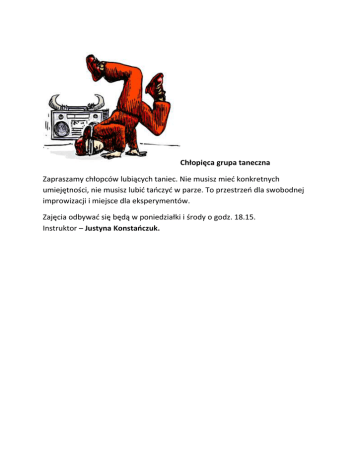 Chłopięca grupa taneczna Zapraszamy chłopców lubiących taniec. Nie musisz mieć konkretnych umiejętności, nie musisz lubić tańczyć w parze. To przestrzeń dla swobodnej improwizacji i miejsce dla eksperymentów. Zajęcia odbywać się będą w poniedziałki i środy o godz. 18.15. Instruktor – Justyna Konstańczuk.