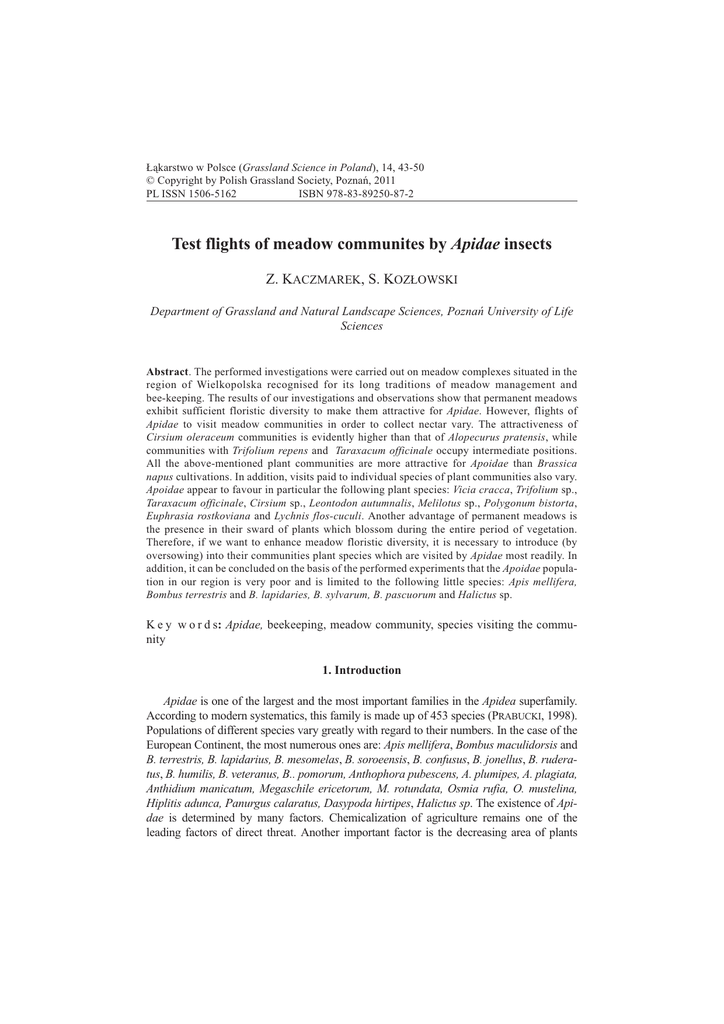 £¹karstwo w Polsce (Grassland Science in Poland), 14, 43-50 © Copyright by Polish Grassland Society, Poznañ, 2011 PL ISSN 1506-5162 ISBN 978-83-89250-87-2 Test flights of meadow communites by Apidae insects Z. KACZMAREK, S. KOZ£OWSKI Department of Grassland and Natural Landscape Sciences, Poznañ University of Life Sciences Abstract. The performed investigations were carried out on meadow complexes situated in the region of Wielkopolska recognised for its long traditions of meadow management and bee-keeping. The results of our investigations and observations show that permanent meadows exhibit sufficient floristic diversity to make them attractive for Apidae. However, flights of Apidae to visit meadow communities in order to collect nectar vary. The attractiveness of Cirsium oleraceum communities is evidently higher than that of Alopecurus pratensis, while communities with Trifolium repens and Taraxacum officinale occupy intermediate positions. All the above-mentioned plant communities are more attractive for Apoidae than Brassica napus cultivations. In addition, visits paid to individual species of plant communities also vary. Apoidae appear to favour in particular the following plant species: Vicia cracca, Trifolium sp., Taraxacum officinale, Cirsium sp., Leontodon autumnalis, Melilotus sp., Polygonum bistorta, Euphrasia rostkoviana and Lychnis flos-cuculi. Another advantage of permanent meadows is the presence in their sward of plants which blossom during the entire period of vegetation. Therefore, if we want to enhance meadow floristic diversity, it is necessary to introduce (by oversowing) into their communities plant species which are visited by Apidae most readily. In addition, it can be concluded on the basis of the performed experiments that the Apoidae population in our region is very poor and is limited to the following little species: Apis mellifera, Bombus terrestris and B. lapidaries, B. sylvarum, B. pascuorum and Halictus sp. K e y w o r d s: Apidae, beekeeping, meadow community, species visiting the community 1. Introduction Apidae is one of the largest and the most important families in the Apidea superfamily. According to modern systematics, this family is made up of 453 species (PRABUCKI, 1998). Populations of different species vary greatly with regard to their numbers. In the case of the European Continent, the most numerous ones are: Apis mellifera, Bombus maculidorsis and B. terrestris, B. lapidarius, B. mesomelas, B. soroeensis, B. confusus, B. jonellus, B. ruderatus, B. humilis, B. veteranus, B.. pomorum, Anthophora pubescens, A. plumipes, A. plagiata, Anthidium manicatum, Megaschile ericetorum, M. rotundata, Osmia rufia, O. mustelina, Hiplitis adunca, Panurgus calaratus, Dasypoda hirtipes, Halictus sp. The existence of Apidae is determined by many factors. Chemicalization of agriculture remains one of the leading factors of direct threat. Another important factor is the decreasing area of plants 44 Z. Kaczmarek, S. Koz³owski providing bee nectar flow. Susceptibility of the Apidae family to various diseases is also an important factor in this respect. The scope and intensity of influence of the above-mentioned factors vary in individual regions of the world and Europe. Permanent meadows provide an unappreciated and poorly recognised place of collection of the nectar flow. They are characterised by a very diverse and varied plant cover, both with regard to areas occupied by individual communities and the participation of individual plant species in their swards (WILKANIEC et al., 1996; WY£UPEK and TR¥BA, 1999; KACZMAREK and KOZ£OWSKI, 2008). Poland is becoming increasingly interesting in this regard as one of the countries which did not yield to West-European trends of intensification of fodder production from permanent meadows and many meadow complexes have preserved their floristic diversity. However, important questions arise about how to utilise these complexes and how to use them, (GRZEGORCZYK and ALBERSKI, 1999; KOZ£OWSKI and SWÊDRZYÑSKI, 1998). One of the possibilities of their rational (albeit not forage) utilisation of meadows is to treat them as sources of the nectar flow. However, this leads to another question, namely – what is the current species diversity of the Apidae population. The undertaken investigations were to find some answers to the above questions.The objective of our experiments was to try and determine flights made to meadow communities by Apidae. 2. Material and methods The investigations were carried out in years 2004–2006 on five large complexes of permanent meadows in the region called Wielkopolska known for its considerable traditions of meadow and bee-keeping economy. The performed experiments comprised the following basic problems: – Determination of the floristic variability of meadow communities, – Determination of the variability of the Apidae populations visiting the examined meadow communities. The point of departure for our investigations was to recognise the plant cover of permanent meadows. The percentage share of individual plants was determined with the assistance of the KLAPP (1955) method and sward floristic types were identified. The key developed by MIREK et al. (1995) and widely employed in Poland was very helpful for the identification of plant species. Sward floristic composition and the number of species which made it up were determined before each flight observation of plant inflorescences by Apidae. The investigation of the second problem consisted in registering and identification of the Apidae species making flights to the communities of permanent meadows. For the Apidae species identification, the authors employed the key elaborated by BANASZAK (2003). The flight intensity of individual communities as well as individual elements of the sward by the Apidae species was determined by marking off permanent micro plots of 1 m2 area each and carrying out systematic weekly observations throughout
