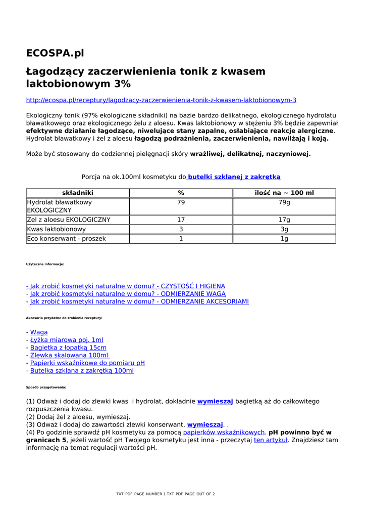 ECOSPA.pl Łagodzący zaczerwienienia tonik z kwasem laktobionowym 3% http://ecospa.pl/receptury/lagodzacy-zaczerwienienia-tonik-z-kwasem-laktobionowym-3 Ekologiczny tonik (97% ekologiczne składniki) na bazie bardzo delikatnego, ekologicznego hydrolatu bławatkowego oraz ekologicznego żelu z aloesu. Kwas laktobionowy w stężeniu 3% będzie zapewniał efektywne działanie łagodzące, niwelujące stany zapalne, osłabiające reakcje alergiczne. Hydrolat bławatkowy i żel z aloesu łagodzą podrażnienia, zaczerwienienia, nawilżają i koją. Może być stosowany do codziennej pielęgnacji skóry wrażliwej, delikatnej, naczyniowej. Porcja na ok.100ml kosmetyku do butelki szklanej z zakrętką składniki % ilość na ~ 100 ml Hydrolat bławatkowy EKOLOGICZNY 79 79g Żel z aloesu EKOLOGICZNY 17 17g Kwas laktobionowy 3 3g Eco konserwant - proszek 1 1g Użyteczne informacje: - Jak zrobić kosmetyki naturalne w domu? - CZYSTOŚĆ I HIGIENA - Jak zrobić kosmetyki naturalne w domu? - ODMIERZANIE WAGĄ - Jak zrobić kosmetyki naturalne w domu? - ODMIERZANIE AKCESORIAMI Akcesoria przydatne do zrobienia receptury: - Waga - Łyżka miarowa poj. 1ml - Bagietka z łopatką 15cm - Zlewka skalowana 100ml - Papierki wskaźnikowe do pomiaru pH - Butelka szklana z zakrętką 100ml Sposób przygotowania: (1) Odważ i dodaj do zlewki kwas i hydrolat, dokładnie wymieszaj bagietką aż do całkowitego rozpuszczenia kwasu. (2) Dodaj żel z aloesu, wymieszaj. (3) Odważ i dodaj do zawartości zlewki konserwant, wymieszaj. . (4) Po godzinie sprawdź pH kosmetyku za pomocą papierków wskaźnikowych. pH powinno być w granicach 5, jeżeli wartość pH Twojego kosmetyku jest inna - przeczytaj ten artykuł. Znajdziesz tam informację na temat regulacji wartości pH. TXT_PDF_PAGE_NUMBER 1 TXT_PDF_PAGE_OUT_OF 2 Instrukcja użycia: (1) Umyj twarz, np. bazowym żelem do mycia EKOLOGICZNYM. (2) Stonizuj skórę twarzy tonikiem omijając okolice oczu i ust. Uwaga: po użyciu toniku może pojawić się lekkie uczucie ciepła, są to normalne objawy w przypadku stosowania kosmetyków z kwasami. Jeżeli jednak objawy te będą się nasilać w czasie - niezwłocznie zmyj kosmetyk z twarzy. (3) Po upływie 20-30 minut zaaplikuj na skórę twarzy krem albo olej. Może to być np. krem z bazy kremowej EKOLOGICZNEJ. Przechowywanie stosowanie termin przydatności na półce lub w lodówce (bez konserwantu) codziennie 3 miesiące z konserwantem, 2-3 tygodnie bez konserwantu TXT_PDF_PAGE_NUMBER 2 TXT_PDF_PAGE_OUT_OF 2