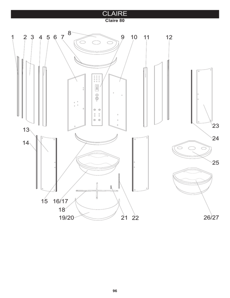 CLAIRE Claire 80 1 2 3 4 5 6 7 8 9 10 11 12 23 13 24 14 25 15 16/17 18 19/20 21 22 96 26/27 Claire 80 numer symbol nazwa części grupa cenowa uwagi 1 201020040 profil boczny lewy I 2 104020059 gruba uszczelka o przekroju „U” F 3 301010054 szyba przednia stała M 4 104020060 cienka uszczelka o przekroju „U” F 5 201020041 profil frontowy lewy I 6 301030035 ścianka tylna lewa O 7 201010041 profil poziomy górny J 8 801020007 daszek - korpus K 9 501010016 panel natryskowy U wysokość 1575 10 301030036 ścianka tylna prawa O wymiary 1580 x 440 11 201020042 profil frontowy prawy I 12 201020043 profil boczny prawy I 13 301020035 szyba drzwiowa + uszczelka magnetyczna N 14 104020061 uszczelka piórowa szyby drzwiowej F 15 201010042 profil poziomy dolny I 16 401020060 skorupa brodzika - zwykły montaż O 17 401020061 skorupa brodzika - szybki montaż O 18 402010020 stelaż brodzika I 19 401020054 osłona brodzika - zwykły montaż L 20 401020055 osłona brodzika - szybki montaż L 21 403010044 pręt M12 x 210 nogi przedniej C 22 403010017 pręt M12 x 410 nogi bocznej/tylnej E 23 301020036 szyba drzwiowa M 24 104020062 uszczelka magnetyczna H 25 801010012 daszek kompletny N wymaga potwierdzenia dostępności 26 401010037 brodzik kompletny - zwykły montaż R wymaga potwierdzenia dostępności 27 401010038 brodzik kompletny - szybki montaż R wymaga potwierdzenia dostępności 97 wymiary 280 x 1600, grubość szkła 5 wymiary 1580 x 440 zestaw fabryczny wymaga potwierdzenia dostępności wymaga potwierdzenia dostępności wymiary 330 x 1568, grubość szkła 5 Claire 90 1 2 3 4 5 6 7 8 9 10 11 12 23 13 24 14 25 15 16/17 18 19/20 28 21 22 29 98 26/27 Claire 90 numer symbol nazwa części grupa cenowa uwagi 1 201020044 profil boczny lewy I 2 104020063 gruba uszczelka o przekroju „U” F 3 301010055 szyba przednia stała M 4 104020064 cienka uszczelka o przekroju „U” F 5 201020045 profil frontowy lewy I 6 301030037 ścianka tylna lewa O 7 201010043 profil poziomy górny J 8 801020009 daszek - korpus K 9 501010017 panel natryskowy U wysokość 1545 10 301030038 ścianka tylna prawa O wymiary 1550 x 570 11 201020046 profil frontowy prawy I 12 201020047 profil boczny prawy I 13 301020037 szyba drzwiowa + uszczelka magnetyczna N 14 104020065 uszczelka piórowa szyby drzwiowej F 15 201010044 profil poziomy dolny I 16 401020062 skorupa brodzika - zwykły montaż P 17 401020063 skorupa brodzika - szybki montaż P 18 402010022 stelaż brodzika - długość 81 cm I 19 401020064 osłona brodzika - zwykły montaż M 20 401020065 osłona brodzika - szybki montaż M 21 403010035 pręt M12 x 360 siedziska D 22 403010047 pręt M12 x 460 nogi E 23 301020038 szyba drzwiowa M 24 104020066 uszczelka magnetyczna H 25 801010013 daszek kompletny N wymaga potwierdzenia dostępności 26 401010039 brodzik kompletny - zwykły montaż S wymaga potwierdzenia dostępności 27 401010040 brodzik kompletny - szybki montaż S wymaga potwierdzenia dostępności 28 403010014 pręt gwintowany M12 x 150 C nowa wersja szybkiego montażu 29 402010032 stelaż brodzika - długość 78 cm I nowa wersja szybkiego montażu 99 wymiary 1565 x 280, grubość szkła 5 wymiary 1550 x 570 zestaw fabryczny wymaga potwierdzenia dostępności wymaga potwierdzenia dostępności wymiary 1533 x 380, grubość szkła 5 Claire - elementy panelu natryskowego/akcesoria 2 1 3 4 5 FM MHz VOL VOL+ TUN> <TUN VOL- FM 6 7 8 9 10 11 12 13 14 15 16 17 18 19 20 numer symbol nazwa części grupa cenowa uwagi 1 501020016 korpus panelu natryskowego model 80 N wymaga potwierdzenia dostępności 2 501020017 korpus panelu natryskowego model 90 N wymaga potwierdzenia dostępności 3 601010006 panel sterujący O 4 106010006 bateria kompletna N 5 103010001 głowica mieszacza - 40 mm G 6 103020011 G 7 101030029 uchwyt mieszacza F 8 101030030 uchwyt przełącznika funkcji F 9 102020022 rozeta mieszacza D 10 102020023 rozeta przełącznika funkcji D 11 102040016 osłona głowicy mieszacza D 12 105010023 dysza masażowa przelotowa D 13 105010024 dysza masażowa końcowa D 14 105010025 dysza masażowa oparcia C 15 102030028 wąż połączeniowy dysz masażowych F długość całkowita 135 cm 16 102030035 wąż połączeniowy zestawu natryskowego E długość 70 cm 17 102030030 wąż połączeniowy masażera F długość 100 cm 18 102030031 wąż połączeniowy deszczownicy/wylewki F długość 120 cm 19 102060001 opaska zaciskowa B 20 603010003 zasilacz I głowica przełącznika funkcji 100 rozstaw 140 średnica 36 (37), wysokość 78 (81) Claire - elementy panelu natryskowego/akcesoria 1 2 3 4 5 6 7 8 9 10 11 12 13 14 15 16 17 18 19 20 numer symbol nazwa części grupa cenowa 1 604010007 oświetlenie LED - panel natryskowy H 2 502010013 klosz LED - panel natryskowy B 3 102050007 kolanko węża połączeniowego - mosiądz C 4 503010003 oparcie panelu G 5 502010014 nakładka panelu natryskowego D 6 702020016 uchwyt drzwi G 7 105010027 słuchawka natryskowa G 8 105020004 wąż natryskowy E 9 105030018 uchwyt słuchawki E 10 701020005 śruby uchwytu słuchawki A 11 703010008 dozowniki I 12 105010012 masażer H 13 105030010 uchwyt masażera B 14 105020006 wąż masażera E 15 101020017 wylewka G 16 701020003 nakrętka 1/2" - tworzywo A 17 701020002 nakrętka 1/2" z kołnierzem - tworzywo A 18 105010011 I 19 703010009 półka G 20 102050013 przyłącze węża natryskowego C deszczownica 101 uwagi rozstaw otworów 145 1/2" x 1/2" L1500 Claire - elementy panelu natryskowego/akcesoria 1 2 3 4 5 6 7 8 9 10 11 12 13 14 15 16 17 18 19 20 numer symbol nazwa części grupa cenowa uwagi 1 105050009 drenaż I 2 604010002 halogen H przewód 10 cm 3 604030001 głośnik H przewód 20 cm 4 604020001 wentylator G przewód 20 cm 5 802010008 osłona głośnika/wentylatora C 6 702010022 rolka górna E średnica kółka 25 7 702010023 rolka dolna D średnica kółka 25 8 701010019 zestaw wkrętów do montażu kabiny F 9 403010048 zestaw wkrętów do montażu brodzika/daszka E 10 403010005 