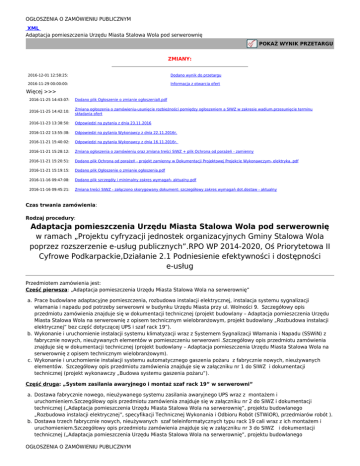 OGŁOSZENIA O ZAMÓWIENIU PUBLICZNYM XML Adaptacja pomieszczenia Urzędu Miasta Stalowa Wola pod serwerownię POKAŻ WYNIK PRZETARGU ZMIANY: 2016-12-01 12:58:25: Dodano wynik do przetargu 2016-11-29 00:00:00: Informacja z otwarcia ofert Więcej >>> 2016-11-25 14:43:07: Dodano plik Ogłoszenie o zmianie ogłoszeniaII.pdf 2016-11-25 14:42:10: Zmiana ogłoszenia o zamówieniu-usunięcie rozbieżności pomiędzy ogłoszeniem a SIWZ w zakresie wadium,przesunięcie terminu składania ofert 2016-11-23 13:38:50: Odpowiedzi na pytania z dnia 23.11.2016 2016-11-22 13:55:38: Odpowiedzi na pytania Wykonawcy z dnia 22.11.2016r. 2016-11-21 15:40:02: Odpowiedzi na pytania Wykonawcy z dnia 16.11.2016r. 2016-11-21 15:28:12: Zmiana ogłoszenia o zamówieniu oraz zmiana treści SIWZ + plik Ochrona od porażeń - zamienny 2016-11-21 15:20:51: Dodano plik Ochrona od porażeń - projekt zamienny w Dokumentacji Projektowej Projekcie Wykonawczym- elektryka..pdf 2016-11-21 15:19:15: Dodano plik Ogłoszenie o zmianie ogłoszenia.pdf 2016-11-16 09:47:08: Dodano plik szczegóły i minimalny zakres wymagań- aktualny.pdf 2016-11-16 09:45:21: Zmiana treści SIWZ - załączono skorygowany dokument: szczegółowy zakres wymagań dot.dostaw - aktualny Czas trwania zamówienia: Rodzaj procedury: Adaptacja pomieszczenia Urzędu Miasta Stalowa Wola pod serwerownię w ramach „Projektu cyfryzacji jednostek organizacyjnych Gminy Stalowa Wola poprzez rozszerzenie e-usług publicznych”.RPO WP 2014-2020, Oś Priorytetowa II Cyfrowe Podkarpackie,Działanie 2.1 Podniesienie efektywności i dostępności e-usług Przedmiotem zamówienia jest: Cześć pierwsza: „Adaptacja pomieszczenia Urzędu Miasta Stalowa Wola na serwerownię” a. Prace budowlane adaptacyjne pomieszczenia, rozbudowa instalacji elektrycznej, instalacja systemu sygnalizacji włamania i napadu pod potrzeby serwerowni w budynku Urzędu Miasta przy ul. Wolności 9. Szczegółowy opis przedmiotu zamówienia znajduje się w dokumentacji technicznej (projekt budowlany – Adaptacja pomieszczenia Urzędu Miasta Stalowa Wola na serwerownię z opisem technicznym wielobranżowym, projekt budowlany „Rozbudowa instalacji elektrycznej” bez część dotyczącej UPS i szaf rack 19”). b. Wykonanie i uruchomienie instalacji systemu klimatyzacji wraz z Systemem Sygnalizacji Włamania i Napadu (SSWiN) z fabrycznie nowych, nieużywanych elementów w pomieszczeniu serwerowni .Szczegółowy opis przedmiotu zamówienia znajduje się w dokumentacji technicznej (projekt budowlany – Adaptacja pomieszczenia Urzędu Miasta Stalowa Wola na serwerownię z opisem technicznym wielobranżowym). c. Wykonanie i uruchomienie instalacji systemu automatycznego gaszenia pożaru z fabrycznie nowych, nieużywanych elementów. Szczegółowy opis przedmiotu zamówienia znajduje się w załączniku nr 1 do SIWZ i dokumentacji technicznej (projekt wykonawczy „Budowa systemu gaszenia pożaru”). Część druga: „System zasilania awaryjnego i montaż szaf rack 19” w serwerowni” a. Dostawa fabrycznie nowego, nieużywanego systemu zasilania awaryjnego UPS wraz z montażem i uruchomieniem.Szczegółowy opis przedmiotu zamówienia znajduje się w załączniku nr 2 do SIWZ i dokumentacji technicznej („Adaptacja pomieszczenia Urzędu Miasta Stalowa Wola na serwerownię”, projektu budowlanego „Rozbudowa instalacji elektrycznej”, specyfikacji Technicznej Wykonania i Odbioru Robót (STWiOR), przedmiarów robót ). b. Dostawa trzech fabrycznie nowych, nieużywanych szaf teleinformatycznych typu rack 19 cali wraz z ich montażem i uruchomieniem.Szczegółowy opis przedmiotu zamówienia znajduje się w załączniku nr 3 do SIWZ i dokumentacji technicznej („Adaptacja pomieszczenia Urzędu Miasta Stalowa Wola na serwerownię”, projektu budowlanego OGŁOSZENIA O ZAMÓWIENIU PUBLICZNYM OGŁOSZENIA O ZAMÓWIENIU PUBLICZNYM „Rozbudowa instalacji elektrycznej”, specyfikacji Technicznej Wykonania i Odbioru Robót (STWiOR), przedmiarów robót).Szczegółowy zakres robót określa dokumentacja projektowa na którą składają się: Projekt budowlany „Adaptacja pomieszczenia Urzędu Miasta Stalowa Wola na serwerownię” z opisem technicznym wielobranżowym, Projekt budowlany „Rozbudowa instalacji elektrycznej”, Projekt wykonawczy „Budowa systemu gaszenia pożaru”, przedmiary robót, Specyfikacje techniczne dostaw oraz Szczegółowe Specyfikacje Techniczne Wykonania i Odbioru Robót Budowlanych , stanowiące załączniki do niniejszej specyfikacji oraz uwarunkowania zawarte w SIWZ. Data składania ofert: 2016-11-25 12:00:00 Data wpłaty wadium: 2016-11-25 12:00:00 Przetarg został rozstrzygnięty (archiwum) Podmiot publikujący Urząd Miasta Stalowa Wola Wytworzył Miejska Rada 2016-11-10 15:54:00 Publikujący Magdalena Wrońska-Bulec 2016-11-10 16:15:00 Modyfikował(a) Magdalena Wrońska-Bulec 2016-12-01 12:58:25 Załączniki >>> Pliki: Lp. Nazwa Rozmiar 1. ogłoszenie o zamówieniu- pobierz plik 571.65 Kb 2. SIWZ- pobierz plik 891.34 Kb 3. formularz ofertowy + załączniki - pobierz plik 163.00 Kb 4. dokumentacja projektowa- pobierz plik 8.21 MB 5. przedmiar robót - pobierz plik 653.41 Kb 6. SST - pobierz plik 1.63 MB 7. szczegółowy zakres wymagań dot.dostaw-nieaktualny 268.73 Kb 8. wzór umowy - roboty budowlane - pobierz plik 97.65 Kb 9. wzór umowy - dostawy - pobierz plik 27.41 Kb 10. szczegółowy zakres wymagań dot.dostaw- aktualny-pobierz plik 234.71 Kb 11. Ogłoszenie o zmianie ogłoszenia-pobierz plik 344.69 Kb 12. Ochrona od porażeń- plik zamienny 224.23 Kb 13. ogłoszenie o zmianie ogłoszenia- pobierz plik 345.29 Kb Rejestr zmian OGŁOSZENIA O ZAMÓWIENIU PUBLICZNYM Typ