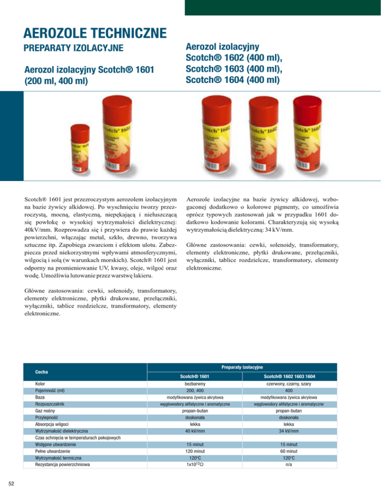 A E R O Z O L E T E C H N I C Z N E A e r o z o l i z o l a c y j n y S c o t c h ® 1 6 0 2 ( 4 0 0 m l ) , c o t c h ® 1 6 0 3 ( 4 0 0 m l ) , A e r o z o l i z o l a c y j n y S c o t c h ® 1 6 0 1 S S c o t c h ® 1 6 0 4 ( 4 0 0 m l ) ( 2 0 0 m l , 4 0 0 m l ) P R E P A R A T Y I Z O L A C Y J N E Scotch® 1601 jest przezroczystym aerozolem izolacyjnym na bazie żywicy alkidowej. Po wyschnięciu tworzy przezroczystą, mocną, elastyczną, niepękającą i niełuszczącą się powłokę o wysokiej wytrzymałości dielektrycznej: 40kV/mm. Rozprowadza się i przywiera do prawie każdej powierzchni, włączając metal, szkło, drewno, tworzywa sztuczne itp. Zapobiega zwarciom i efektom ulotu. Zabezpiecza przed niekorzystnymi wpływami atmosferycznymi, wilgocią i solą (w warunkach morskich). Scotch® 1601 jest odporny na promieniowanie UV, kwasy, oleje, wilgoć oraz wodę. Umożliwia lutowanie przez warstwę lakieru. Aerozole izolacyjne na bazie żywicy alkidowej, wzbogaconej dodatkowo o kolorowe pigmenty, co umożliwia oprócz typowych zastosowań jak w przypadku 1601 dodatkowo kodowanie kolorami. Charakteryzują się wysoką wytrzymałością dielektryczną: 34 kV/mm. Główne zastosowania: cewki, solenoidy, transformatory, elementy elektroniczne, płytki drukowane, przełączniki, wyłączniki, tablice rozdzielcze, transformatory, elementy elektroniczne. Główne zastosowania: cewki, solenoidy, transformatory, elementy elektroniczne, płytki drukowane, przełączniki, wyłączniki, tablice rozdzielcze, transformatory, elementy elektroniczne. C e c h a K o l o r P o j e m n o ść ( m l ) B a z a R o z p u s z c z a l n i k G a z n o śn y P r z y l e p n o ść A b s o r p c j a w i l g o c i W y t r z y m a ło ść d i e l e k t r y c z n a C z a s s c h n i ęc i a w t e m p e r a t u r a c h p o k o j o w y c h W s t ęp n e u t w a r d z e n i e P e łn e u t w a r d z e n i e W y t r z y m a ło ść t e r m i c z n a R e z y s t a n c j a p o w i e r z c h n i o w a 5 2 P r e p a r a t y i z o l a c y j n e S c o t c h ® 1 6 0 1 b e z b a r w n y 2 0 0 , 4 0 0 S c o t c h ® 1 6 0 2 1 6 0 3 1 6 0 4 c z e r w o n y , c z a r n y , s z a r y 4 0 0 m o d y f i k o w a n a ży w i c a a k r y l o w a m o d y f i k o w a n a ży w i c a a k r y l o w a w ęg l o w o d o r y a l i f a t y c z n e i a r o m a t y c z n e w ęg l o w o d o r y a l i f a t y c z n e i a r o m a t y c z n e p r o p a n b u t a n d o s k o n a ła l e k k a 4 0 k V / m m 1 5 m i n u t 1 2 0 m i n u t 1 2 0 ºC 1 2 1 x 1 0 Ω p r o p a n b u t a n d o s k o n a ła l e k k a 3 4 k V / m m 1 5 m i n u t 6 0 m i n u t 1 2 0 ºC n / a